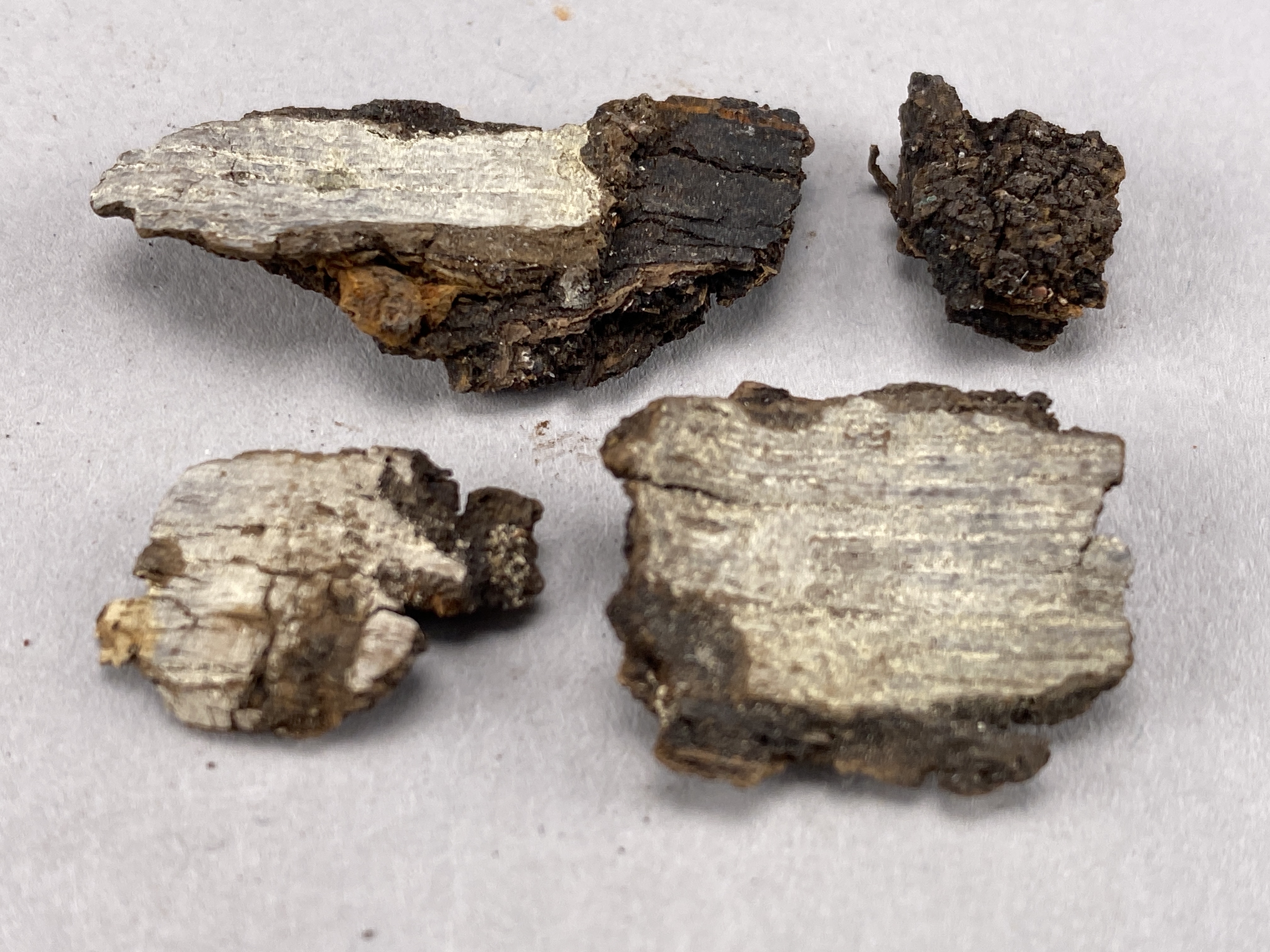 Ett 20-tal små fragment från den stora kistan i Bj 639. Tidigare har spår av målning observerats på fragmenten.