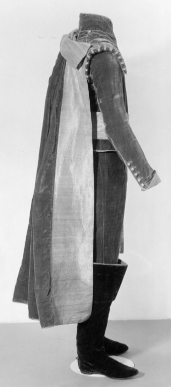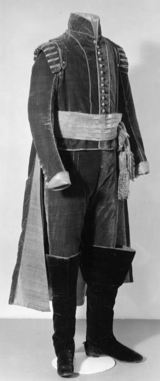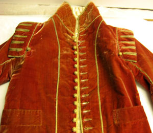 Jacka av krabbröd sammet med långa ärmar, kantad med smala guldgaloner. Sömmarna täcks av ett guldsnöre. Jackan är sydd med en mittsöm bak samt två snedställda sidsömmar, täckta med guldsnöre. Rakt skurna framstycken. Knäppning mitt fram bestående av en knapprad på vänster framstycke med 14 runda höga knappar, klädda med guldtråd i ett snörmakeriarbete. På höger framstycke motsvarande knapphål, 23 mm breda, kantade med stygn av guldtråd. Knäppningen är inramad med guldgalon. Mitt på vardera framstycke en iskuren horisontell ficka, 205 mm lång, med en markerad slå, 50 mm bred. På vardera framstycke intill ärmen sitter en knapp. Axelkarmar, 70 mm breda, vadderade och uppdelade i 13 tungor kantade med guldgalon. Långa smala ärmar med sömmarna täckta av guldsnöre, en yttersöm och en innersöm. Vid ärmsluten ett 150 mm högt sprund som fortsättning på innersömmen. Sprundet har en knäppning bestående av en knapprad med fem knappar samt motsvarande knapphål. Ärmarna är i nederkanten uppvikta i 70 mm breda slag vilka är fodrade med gult blankt sidentyg med inslag av guldtråd och nederkanten kantad med guldgalon. En 85 mm hög ståndkrage kantad med guldband upptill och i nederkanten över sömmen med guldsnöre. På bakstycket, under kragen, sitter två knappar, en knapp på vardera sida. Vid dessa är fästat ett 130 mm långt axelsnöre av tvinnad guldtråd, vilket löper ner mot axeln, snett bak på ryggen. På snöret mitt bak sitter två hyskor av två stora stygn av gul silkestråd. Sömmarna bildar på baksycket från midjan fyra invikta skörtflikar. På vardera sida i nedre kanten en kil. Jackan är på insidan fodrad med vit sidenatlas.