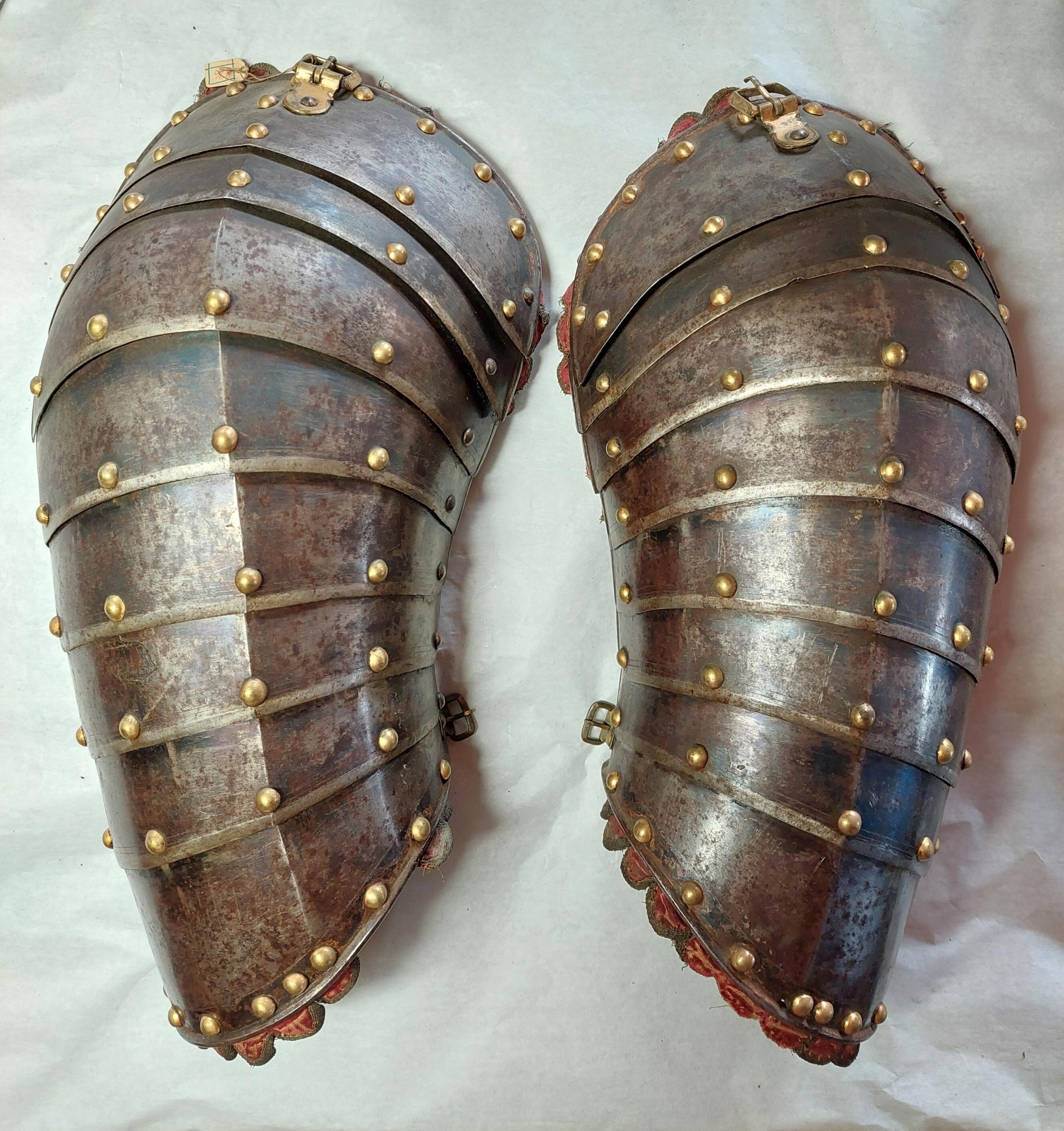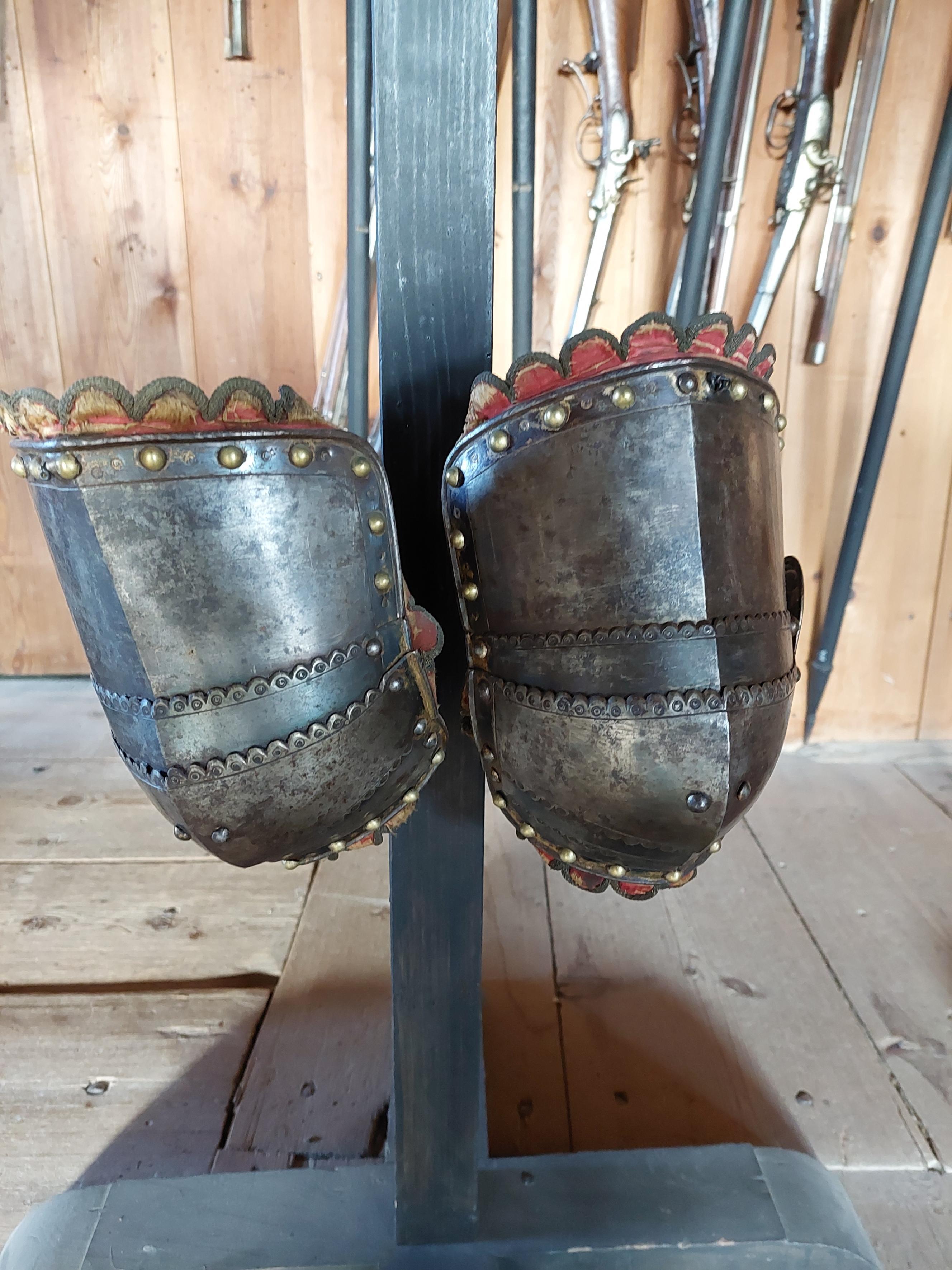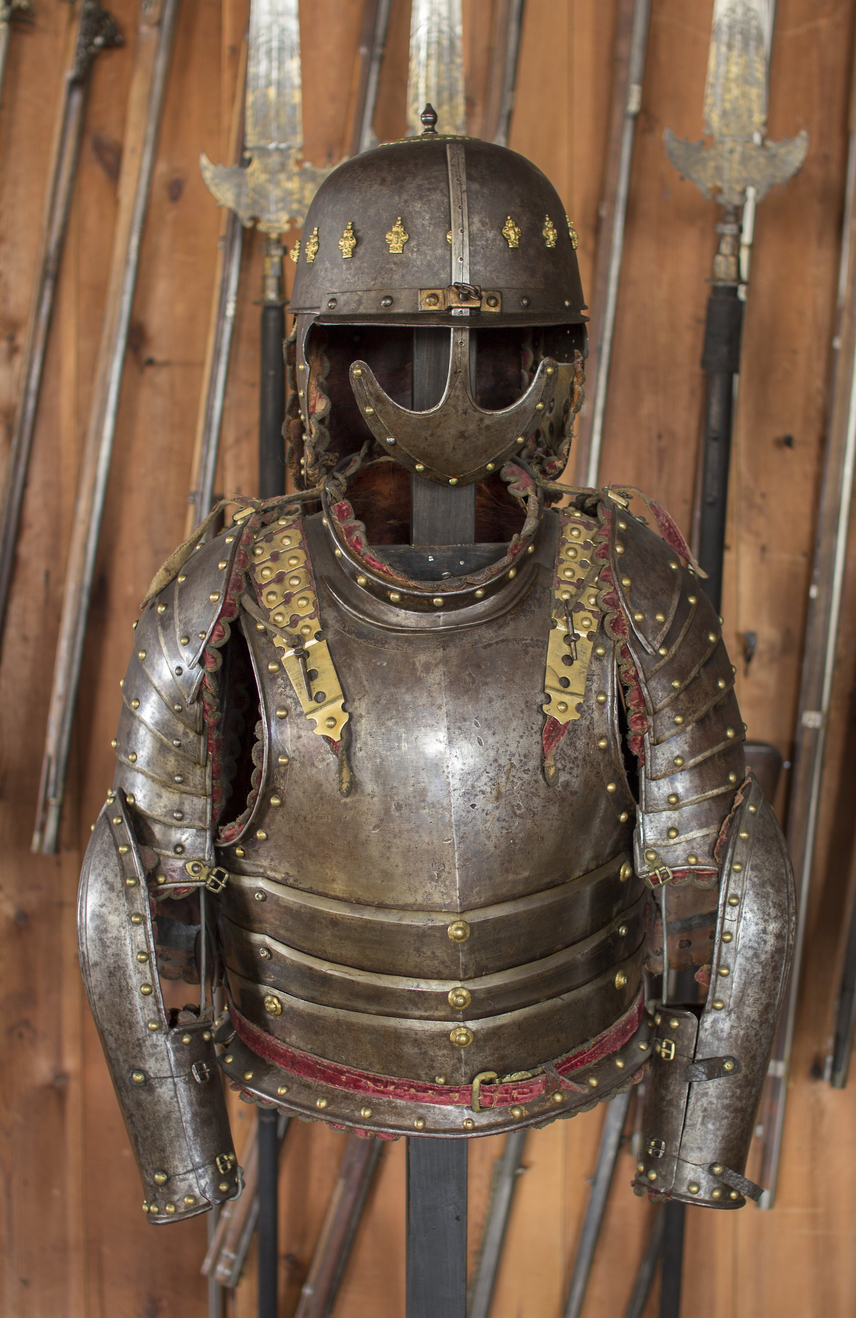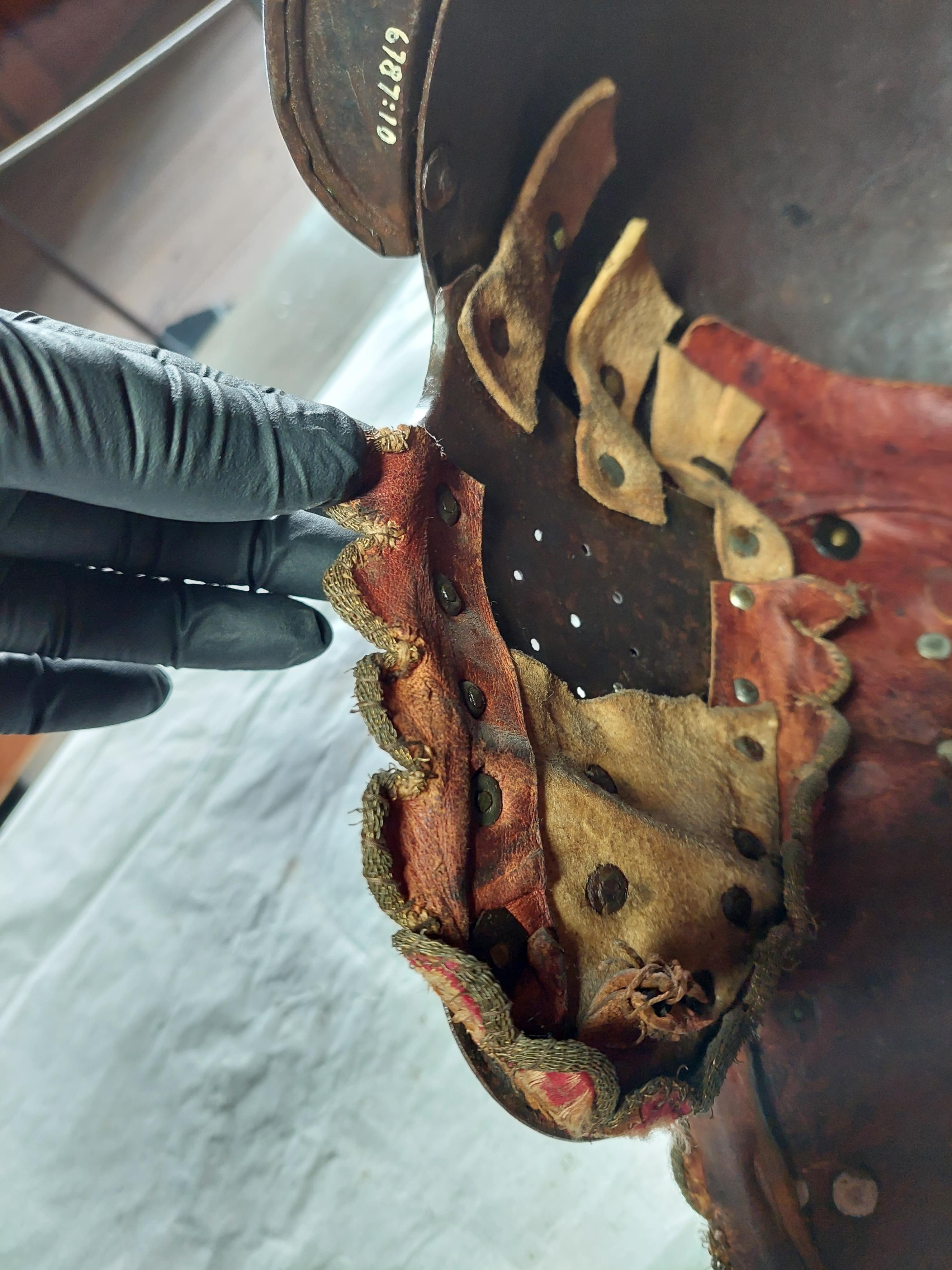 KOMPLETTERANDE BESKRIVNING Ryttarrustning av östeuropeisk/polsk typ, tillverkad i Polen eller Tyskland. Knäskydden och underarmsskenorna avviker från de övriga delarna men har sannolikt brukats tillsammans med dessa och kantningen överensstämmer. Arbetet håller hög kvalité men når inte samma kvalité i smidet som 6785. Ursprungligen har 6787 däremot varit blånerad med blanka fasade kanter och förgyllda detaljer. Foder och kantning framstår som ursprungligt från bruksningstiden. Rustningen har använts av en officer/adelsman. 6787:1 Bröstharnesk (sannolikt skottfritt) fyra delar av ursprungligen blånerat stål. De tre nedersta delarna med kanter med kraftiga filade fasningar med två parallella ritsade linjer, kontrasterande mot den ursprungliga blåneringen. Kraftiga dekornitar med nitbrickor som har sticklad dekor mitt fram och i sidorna. Stålnitar med pålödda, förgyllda mässingsskållor längs nederkanten och armurtagen. Nederkanten inåt omvikt och rundsmidd. Armurtag och halsringning utvikt med parallell ristad linje. Markerad lodrät mittås. Foder av rödbrunt skinn (Sannolikt ursprungligt) som har dubblerats senare med annat läder. Längs kanterna, på insidan, en fastnitad sämskinnsremsa vari fodret är sytt. Längs kanten en fastnitad, sammetsklädd läderemsa kantad med gulgalon. Lädret och kantningen framstår som ursprunglig. 6787:2 Ryggharnesk av fyra delar av ursprungligen blånerat stål. De tre nedersta delarna med kanter med filade fasningar med två parallella ritsade linjer, kontrasterande mot den ursprungliga blåneringen. Kraftiga dekornitar med nitbrickor som har sticklad dekor mitt fram och i sidorna. Stålnitar med pålödda, förgyllda mässingsskållor längs nederkanten och armurtagen. Nederkanten, hals- och armringning inåt omvikt och rundsmidd. Parallellt med denna vid hals och armurtag ritsad linje. Foder av rödbrunt skinn (Sannolikt ursprungligt) som har dubblerats senare med annat läder. I vänster sida två och i höger sida en läderknapp med oklart användningsområde. Längs kanterna, på insidan, en fastnitad sämskinnsremsa vari fodret är sytt. Längs kanten en fastnitad, sammetsklädd läderemsa kantad med gulgalon. Axelremmar klädda i sammet med fastnitade förgyllda mässingsbrickor. Lädret och kantningen framstår som ursprunglig. 6787:3 Halskrage av ursprungligen blånerat stål med stålnitar med pålödda mässingsskållor. Nederkanten och halskanten inåt omvikta och rundsmidda. med en parallell ritsad linje. Mitt fram markerad mittås, nerdragen i en spets mitt fram. Insidan med röbrunt skinnfoder, fastsytt in en fastnitad sämskskinnsremsa. Längs kanterna, en fastnitad, sammetsklädd läderemsa kantad med gulgalon. På ryggdelen fastnitade sammestklädda remmar för fästning i axelstyckena. Läder, kantning och remmar framstår som ursprungligt. 6787:4 och 6. Axelstycken med överaramslameller. Under- och överkanter är inåt omvikta samt rundsmidda och övergår i "falska" omvikta ytterkanter på de övriga delarna. Lamellerna med fasade, blankfilade kanter. Parallellt med dessa två ritsade linjer, utförda efter att delen blånerats.Stålnitar med pålödda, förgyllda mässingskållor. Helfodrade med rödbunt skinnfoder fastsytt i fastnitat sämskskinnsremsa. Kanterna med flikigt,sammetsklätt läder, kantat med guldgalon. Lamellerna sitter direkt i varandra i en bakre kanten och på läder i mitten och längs framkanten. Höger axelstycke med delvis bortfallna mässingsskållor. 6787:5 och 7 Underarmsrör. Höger underarmsrör saknar delar av läderkantningen. Gångjärnen som håller samman delarna är förgyllda. Underarmsrören avviker från de övriga delarna till rustningen genom att endast rören har en försänkt bård innanför de rundsmidda ytterkanterna. Kanske har delarna sammanförts då man satt fast kantningen, 6787:8-9. Knästycken ursprungligen ej samhörande med resten av rustningen bestående av fyra delar vardera. Markerad mittås ytterkanterna är inåt omvikta samt rundsmidda med mejslad repdekor. Lamellernas överkanter samt knäbucklans över- och underkanter profilerade i vågmönster med en punsad cirkel i varje våg Därunder mejslad linje. Stålnitar med pålödda mässingsskållor bortsett från lederna där stålnitarna är förgyllda.Längs kanterna fastnitade sammetsklädda läderemsor kantade med gulgaloner. 6787:10 Ryttarhjälm, s.k. zischägge med nackskydd av 19 delar. Kindplåtar i två stycken med urtag för periferiseende. Spår av förgyllning på knoppen, fästet för näsbärgan och längs en del kanter. Plymhållar är fatsatt upp och ner.