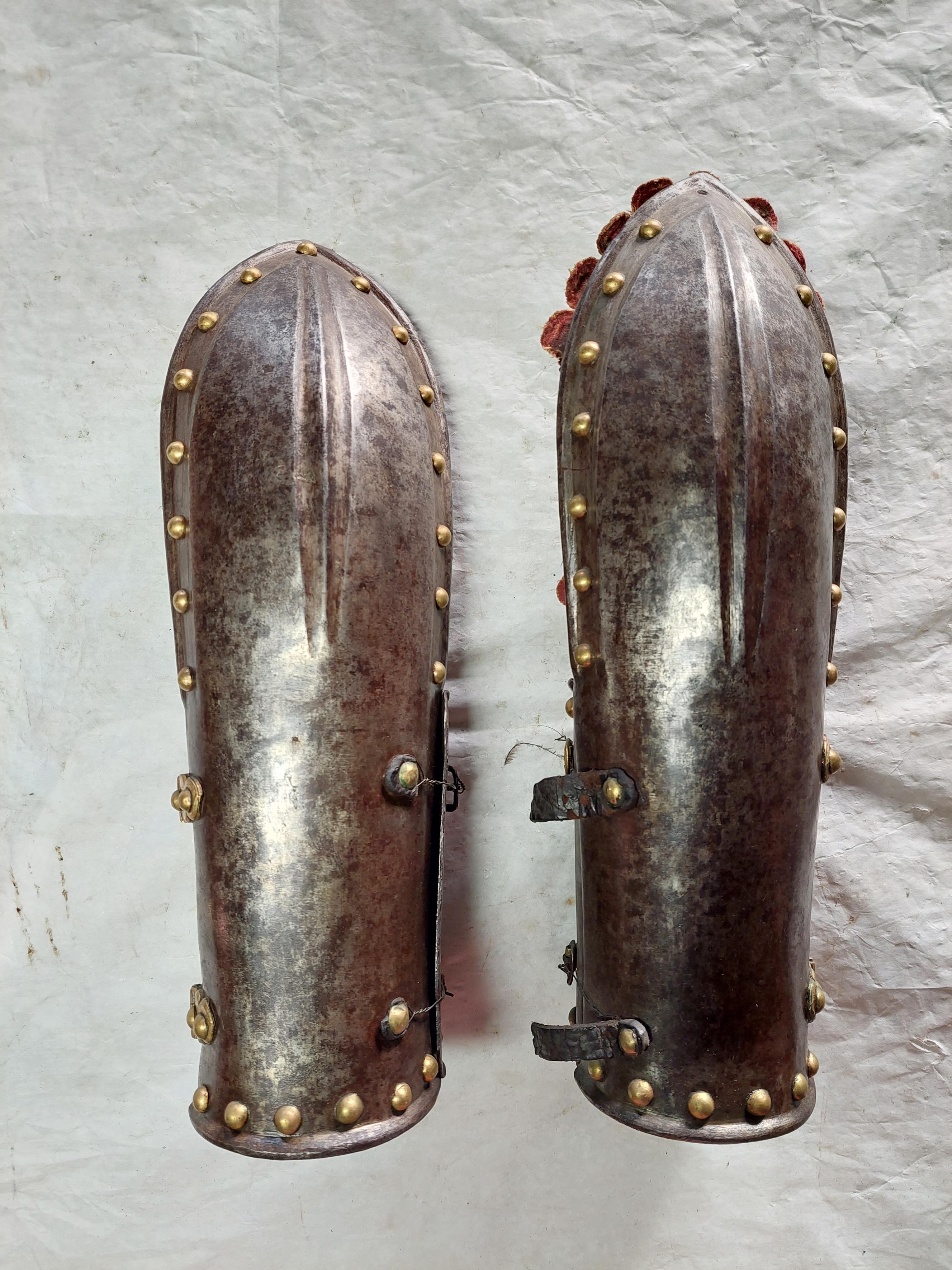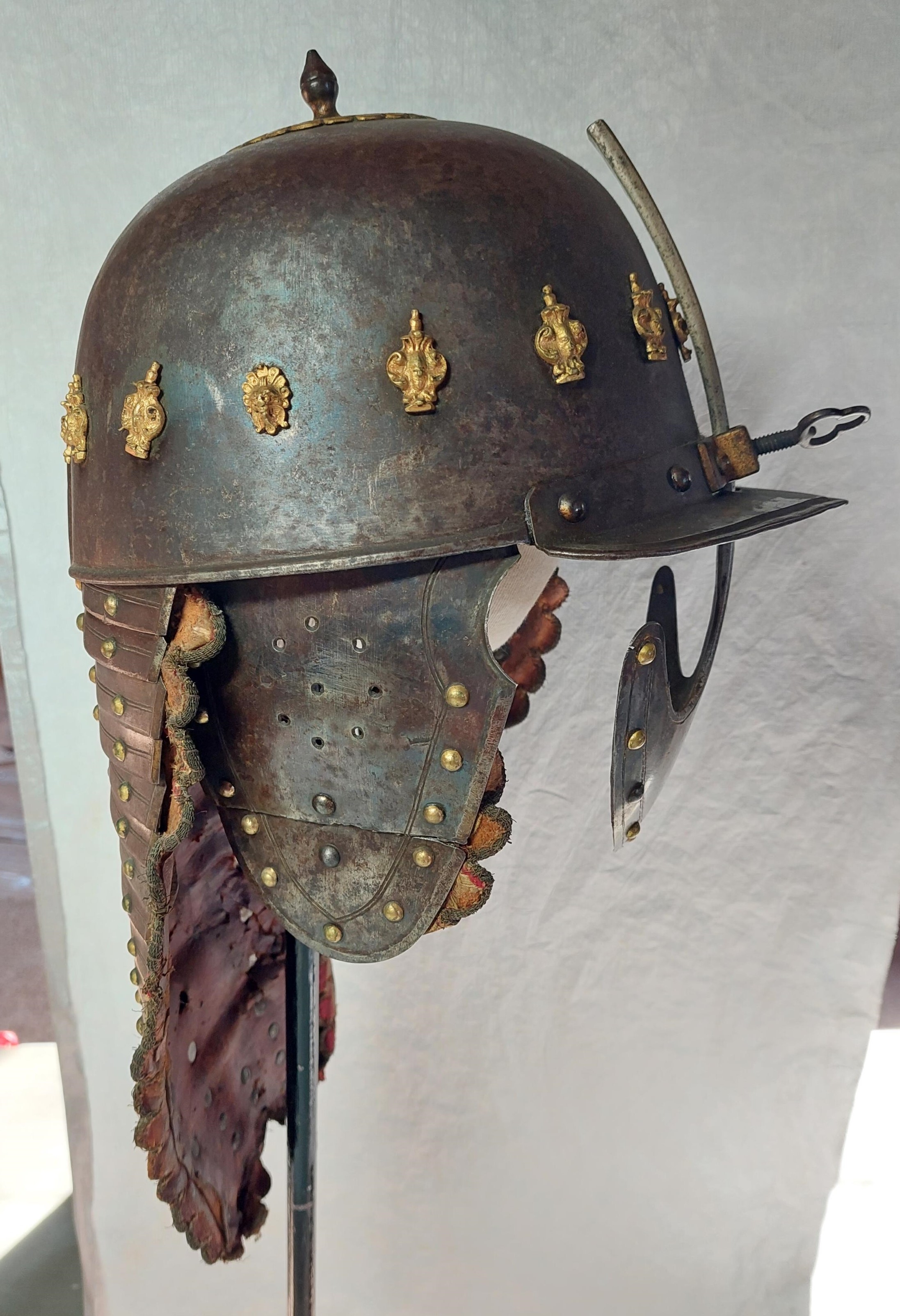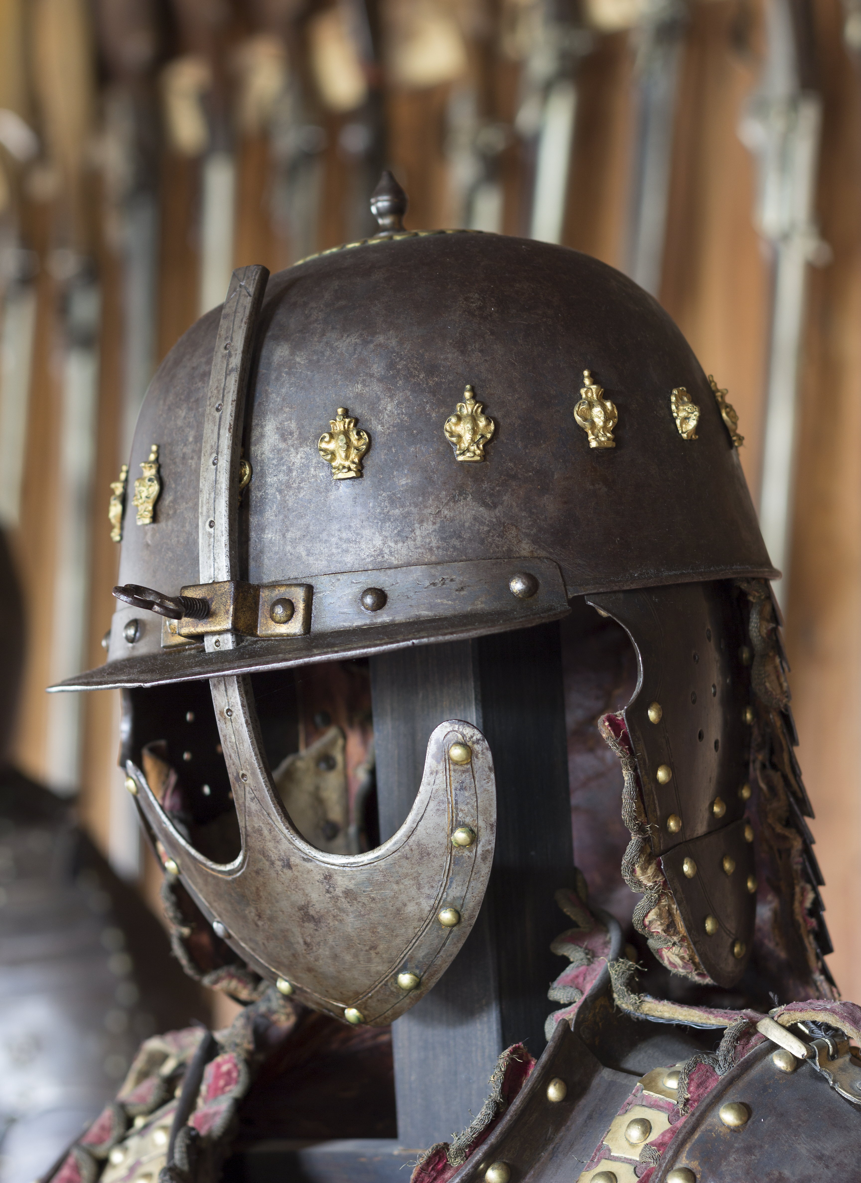 KOMPLETTERANDE BESKRIVNING Ryttarrustning av östeuropeisk/polsk typ, tillverkad i Polen eller Tyskland. Knäskydden och underarmsskenorna avviker från de övriga delarna men har sannolikt brukats tillsammans med dessa och kantningen överensstämmer. Arbetet håller hög kvalité men når inte samma kvalité i smidet som 6785. Ursprungligen har 6787 däremot varit blånerad med blanka fasade kanter och förgyllda detaljer. Foder och kantning framstår som ursprungligt från bruksningstiden. Rustningen har använts av en officer/adelsman. 6787:1 Bröstharnesk (sannolikt skottfritt) fyra delar av ursprungligen blånerat stål. De tre nedersta delarna med kanter med kraftiga filade fasningar med två parallella ritsade linjer, kontrasterande mot den ursprungliga blåneringen. Kraftiga dekornitar med nitbrickor som har sticklad dekor mitt fram och i sidorna. Stålnitar med pålödda, förgyllda mässingsskållor längs nederkanten och armurtagen. Nederkanten inåt omvikt och rundsmidd. Armurtag och halsringning utvikt med parallell ristad linje. Markerad lodrät mittås. Foder av rödbrunt skinn (Sannolikt ursprungligt) som har dubblerats senare med annat läder. Längs kanterna, på insidan, en fastnitad sämskinnsremsa vari fodret är sytt. Längs kanten en fastnitad, sammetsklädd läderemsa kantad med gulgalon. Lädret och kantningen framstår som ursprunglig. 6787:2 Ryggharnesk av fyra delar av ursprungligen blånerat stål. De tre nedersta delarna med kanter med filade fasningar med två parallella ritsade linjer, kontrasterande mot den ursprungliga blåneringen. Kraftiga dekornitar med nitbrickor som har sticklad dekor mitt fram och i sidorna. Stålnitar med pålödda, förgyllda mässingsskållor längs nederkanten och armurtagen. Nederkanten, hals- och armringning inåt omvikt och rundsmidd. Parallellt med denna vid hals och armurtag ritsad linje. Foder av rödbrunt skinn (Sannolikt ursprungligt) som har dubblerats senare med annat läder. I vänster sida två och i höger sida en läderknapp med oklart användningsområde. Längs kanterna, på insidan, en fastnitad sämskinnsremsa vari fodret är sytt. Längs kanten en fastnitad, sammetsklädd läderemsa kantad med gulgalon. Axelremmar klädda i sammet med fastnitade förgyllda mässingsbrickor. Lädret och kantningen framstår som ursprunglig. 6787:3 Halskrage av ursprungligen blånerat stål med stålnitar med pålödda mässingsskållor. Nederkanten och halskanten inåt omvikta och rundsmidda. med en parallell ritsad linje. Mitt fram markerad mittås, nerdragen i en spets mitt fram. Insidan med röbrunt skinnfoder, fastsytt in en fastnitad sämskskinnsremsa. Längs kanterna, en fastnitad, sammetsklädd läderemsa kantad med gulgalon. På ryggdelen fastnitade sammestklädda remmar för fästning i axelstyckena. Läder, kantning och remmar framstår som ursprungligt. 6787:4 och 6. Axelstycken med överaramslameller. Under- och överkanter är inåt omvikta samt rundsmidda och övergår i "falska" omvikta ytterkanter på de övriga delarna. Lamellerna med fasade, blankfilade kanter. Parallellt med dessa två ritsade linjer, utförda efter att delen blånerats.Stålnitar med pålödda, förgyllda mässingskållor. Helfodrade med rödbunt skinnfoder fastsytt i fastnitat sämskskinnsremsa. Kanterna med flikigt,sammetsklätt läder, kantat med guldgalon. Lamellerna sitter direkt i varandra i en bakre kanten och på läder i mitten och längs framkanten. Höger axelstycke med delvis bortfallna mässingsskållor. 6787:5 och 7 Underarmsrör. Höger underarmsrör saknar delar av läderkantningen. Gångjärnen som håller samman delarna är förgyllda. Underarmsrören avviker från de övriga delarna till rustningen genom att endast rören har en försänkt bård innanför de rundsmidda ytterkanterna. Kanske har delarna sammanförts då man satt fast kantningen, 6787:8-9. Knästycken ursprungligen ej samhörande med resten av rustningen bestående av fyra delar vardera. Markerad mittås ytterkanterna är inåt omvikta samt rundsmidda med mejslad repdekor. Lamellernas överkanter samt knäbucklans över- och underkanter profilerade i vågmönster med en punsad cirkel i varje våg Därunder mejslad linje. Stålnitar med pålödda mässingsskållor bortsett från lederna där stålnitarna är förgyllda.Längs kanterna fastnitade sammetsklädda läderemsor kantade med gulgaloner. 6787:10 Ryttarhjälm, s.k. zischägge med nackskydd av 19 delar. Kindplåtar i två stycken med urtag för periferiseende. Spår av förgyllning på knoppen, fästet för näsbärgan och längs en del kanter. Plymhållar är fatsatt upp och ner.