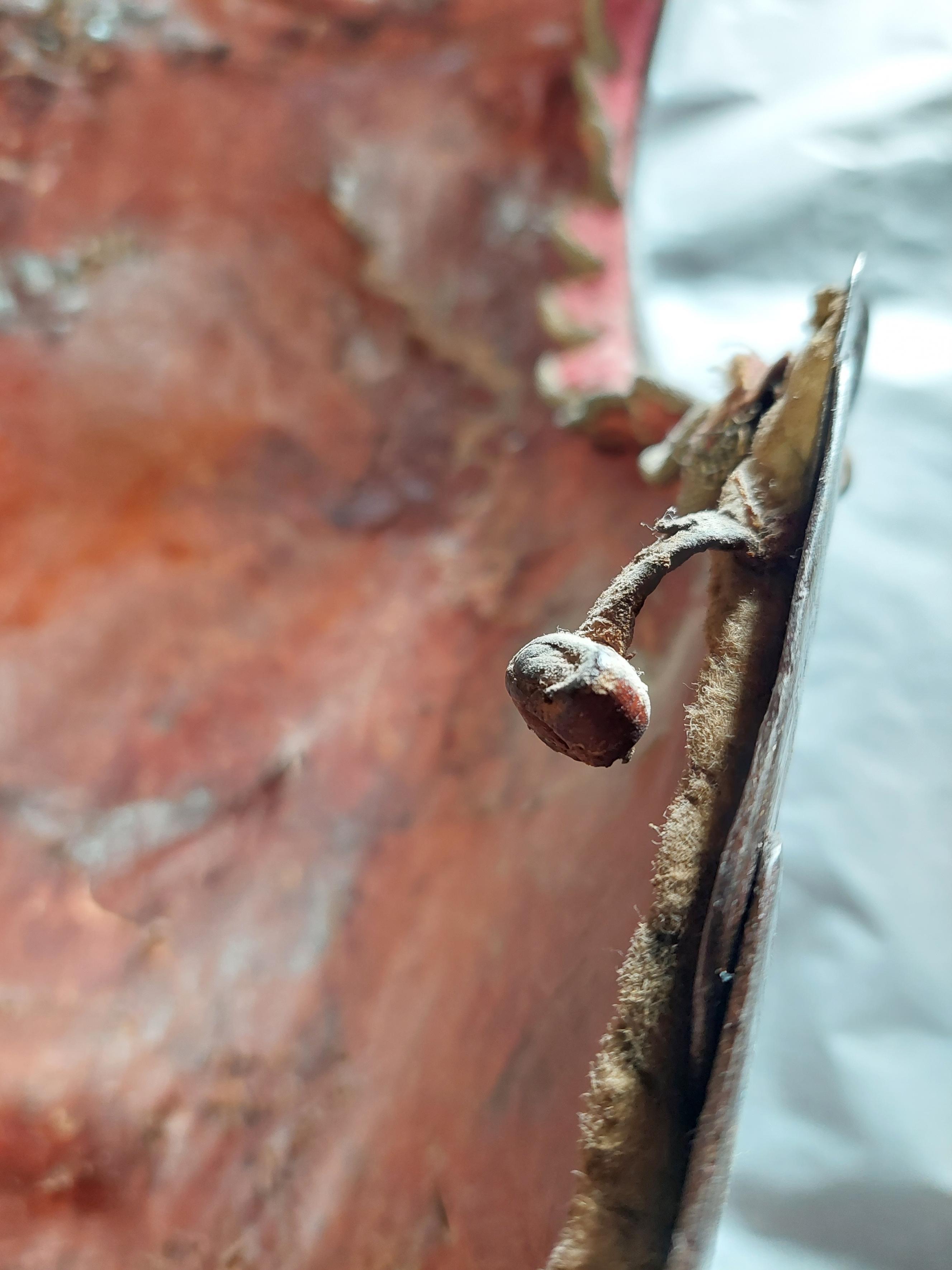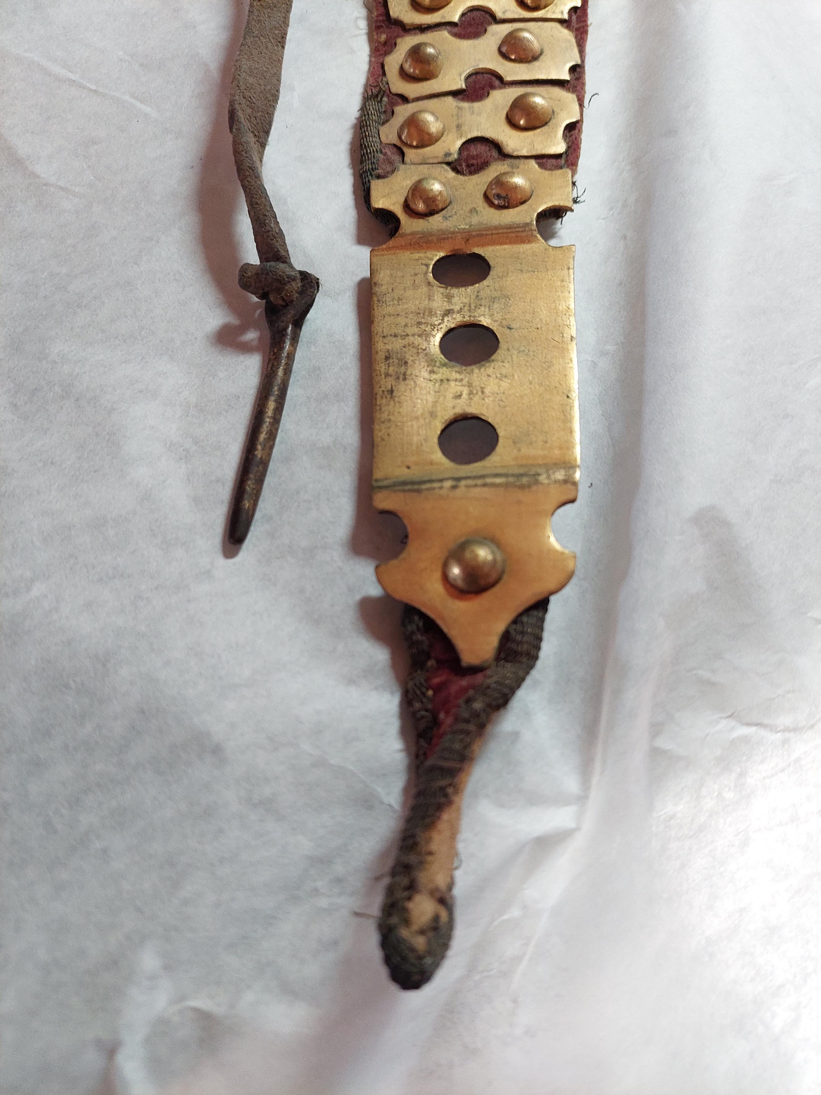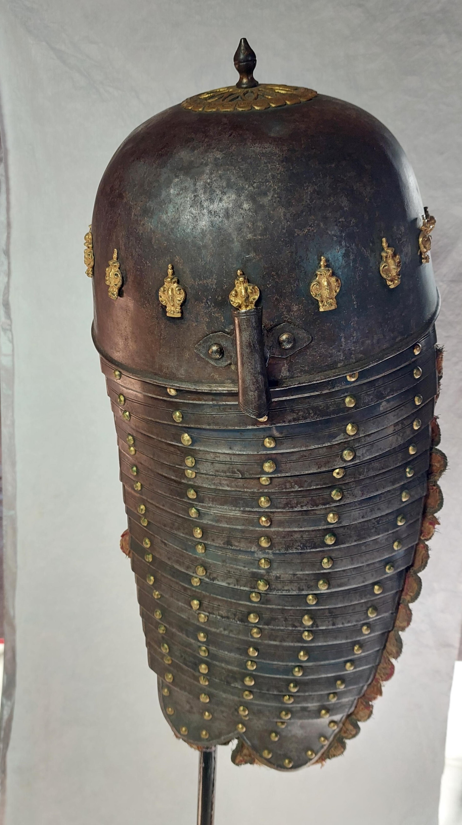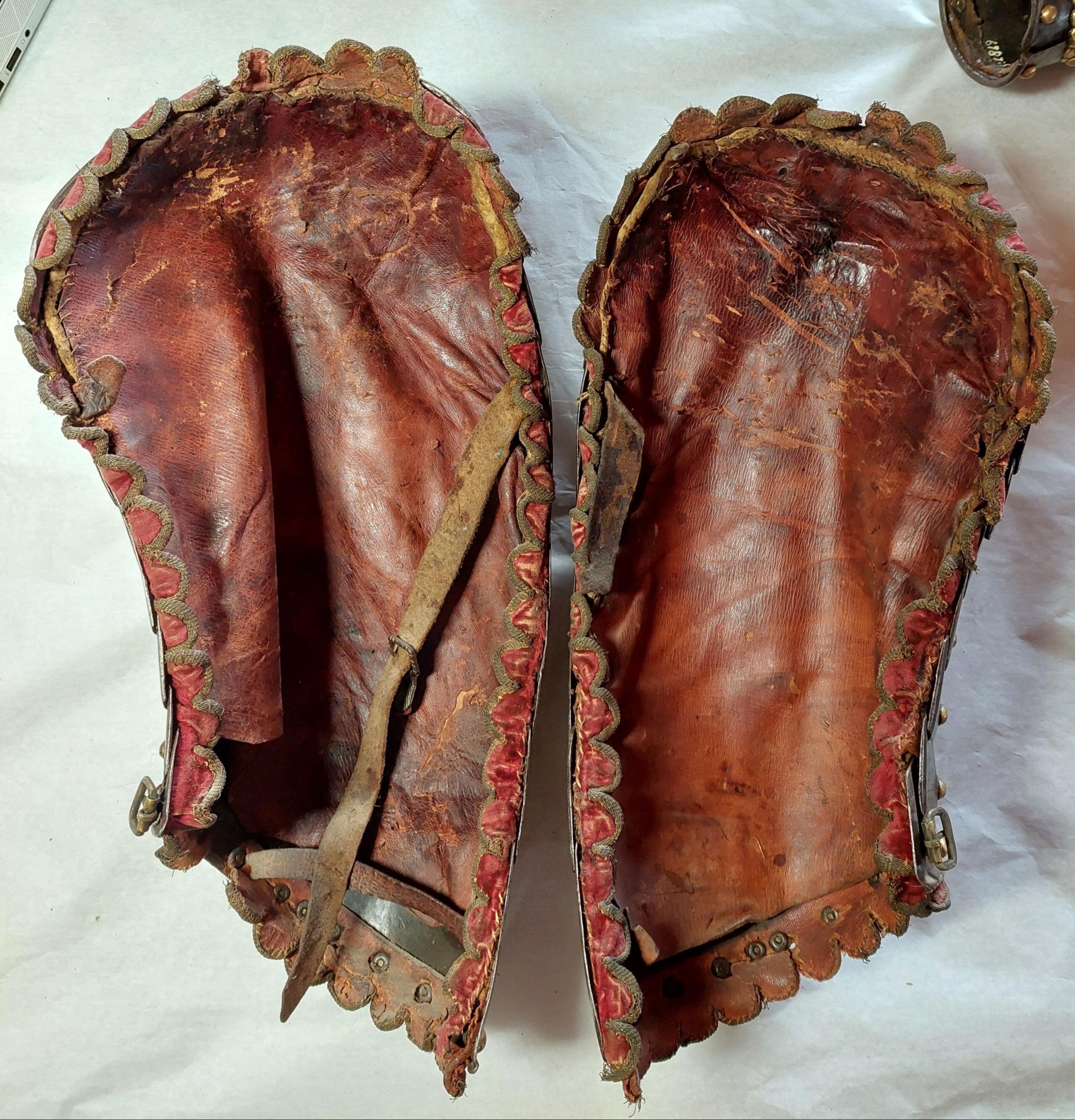 KOMPLETTERANDE BESKRIVNING Ryttarrustning av östeuropeisk/polsk typ, tillverkad i Polen eller Tyskland. Knäskydden och underarmsskenorna avviker från de övriga delarna men har sannolikt brukats tillsammans med dessa och kantningen överensstämmer. Arbetet håller hög kvalité men når inte samma kvalité i smidet som 6785. Ursprungligen har 6787 däremot varit blånerad med blanka fasade kanter och förgyllda detaljer. Foder och kantning framstår som ursprungligt från bruksningstiden. Rustningen har använts av en officer/adelsman. 6787:1 Bröstharnesk (sannolikt skottfritt) fyra delar av ursprungligen blånerat stål. De tre nedersta delarna med kanter med kraftiga filade fasningar med två parallella ritsade linjer, kontrasterande mot den ursprungliga blåneringen. Kraftiga dekornitar med nitbrickor som har sticklad dekor mitt fram och i sidorna. Stålnitar med pålödda, förgyllda mässingsskållor längs nederkanten och armurtagen. Nederkanten inåt omvikt och rundsmidd. Armurtag och halsringning utvikt med parallell ristad linje. Markerad lodrät mittås. Foder av rödbrunt skinn (Sannolikt ursprungligt) som har dubblerats senare med annat läder. Längs kanterna, på insidan, en fastnitad sämskinnsremsa vari fodret är sytt. Längs kanten en fastnitad, sammetsklädd läderemsa kantad med gulgalon. Lädret och kantningen framstår som ursprunglig. 6787:2 Ryggharnesk av fyra delar av ursprungligen blånerat stål. De tre nedersta delarna med kanter med filade fasningar med två parallella ritsade linjer, kontrasterande mot den ursprungliga blåneringen. Kraftiga dekornitar med nitbrickor som har sticklad dekor mitt fram och i sidorna. Stålnitar med pålödda, förgyllda mässingsskållor längs nederkanten och armurtagen. Nederkanten, hals- och armringning inåt omvikt och rundsmidd. Parallellt med denna vid hals och armurtag ritsad linje. Foder av rödbrunt skinn (Sannolikt ursprungligt) som har dubblerats senare med annat läder. I vänster sida två och i höger sida en läderknapp med oklart användningsområde. Längs kanterna, på insidan, en fastnitad sämskinnsremsa vari fodret är sytt. Längs kanten en fastnitad, sammetsklädd läderemsa kantad med gulgalon. Axelremmar klädda i sammet med fastnitade förgyllda mässingsbrickor. Lädret och kantningen framstår som ursprunglig. 6787:3 Halskrage av ursprungligen blånerat stål med stålnitar med pålödda mässingsskållor. Nederkanten och halskanten inåt omvikta och rundsmidda. med en parallell ritsad linje. Mitt fram markerad mittås, nerdragen i en spets mitt fram. Insidan med röbrunt skinnfoder, fastsytt in en fastnitad sämskskinnsremsa. Längs kanterna, en fastnitad, sammetsklädd läderemsa kantad med gulgalon. På ryggdelen fastnitade sammestklädda remmar för fästning i axelstyckena. Läder, kantning och remmar framstår som ursprungligt. 6787:4 och 6. Axelstycken med överaramslameller. Under- och överkanter är inåt omvikta samt rundsmidda och övergår i "falska" omvikta ytterkanter på de övriga delarna. Lamellerna med fasade, blankfilade kanter. Parallellt med dessa två ritsade linjer, utförda efter att delen blånerats.Stålnitar med pålödda, förgyllda mässingskållor. Helfodrade med rödbunt skinnfoder fastsytt i fastnitat sämskskinnsremsa. Kanterna med flikigt,sammetsklätt läder, kantat med guldgalon. Lamellerna sitter direkt i varandra i en bakre kanten och på läder i mitten och längs framkanten. Höger axelstycke med delvis bortfallna mässingsskållor. 6787:5 och 7 Underarmsrör. Höger underarmsrör saknar delar av läderkantningen. Gångjärnen som håller samman delarna är förgyllda. Underarmsrören avviker från de övriga delarna till rustningen genom att endast rören har en försänkt bård innanför de rundsmidda ytterkanterna. Kanske har delarna sammanförts då man satt fast kantningen, 6787:8-9. Knästycken ursprungligen ej samhörande med resten av rustningen bestående av fyra delar vardera. Markerad mittås ytterkanterna är inåt omvikta samt rundsmidda med mejslad repdekor. Lamellernas överkanter samt knäbucklans över- och underkanter profilerade i vågmönster med en punsad cirkel i varje våg Därunder mejslad linje. Stålnitar med pålödda mässingsskållor bortsett från lederna där stålnitarna är förgyllda.Längs kanterna fastnitade sammetsklädda läderemsor kantade med gulgaloner. 6787:10 Ryttarhjälm, s.k. zischägge med nackskydd av 19 delar. Kindplåtar i två stycken med urtag för periferiseende. Spår av förgyllning på knoppen, fästet för näsbärgan och längs en del kanter. Plymhållar är fatsatt upp och ner.