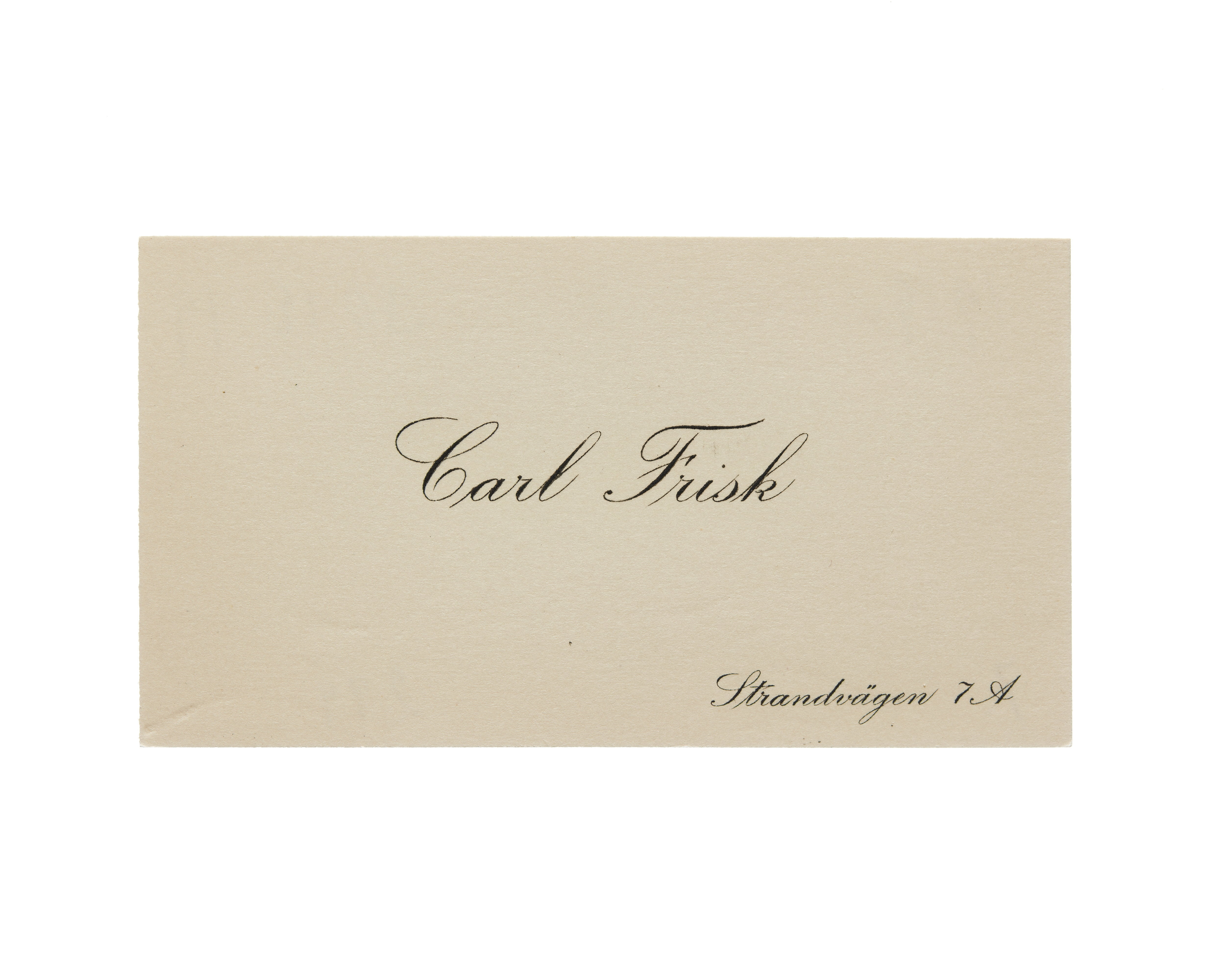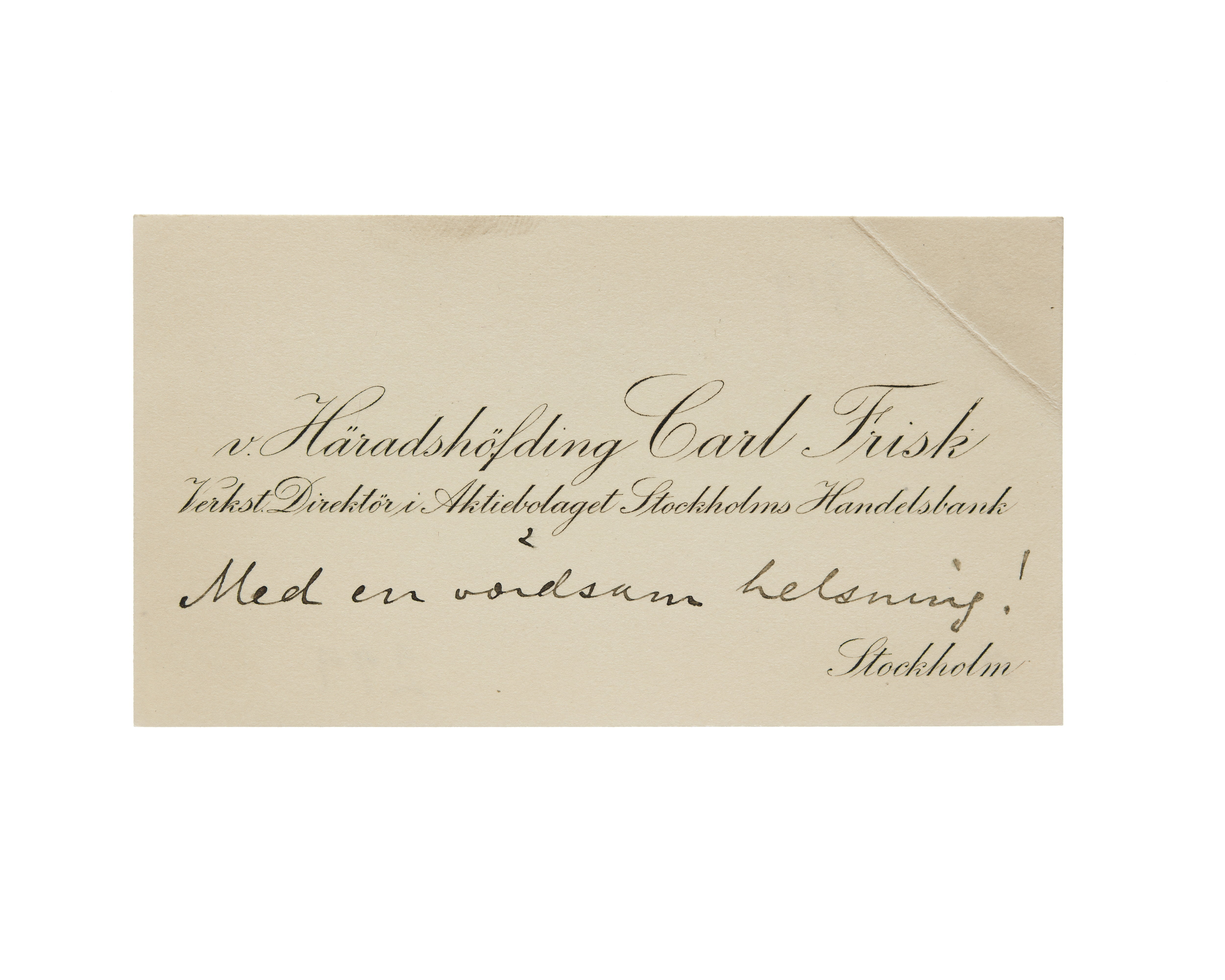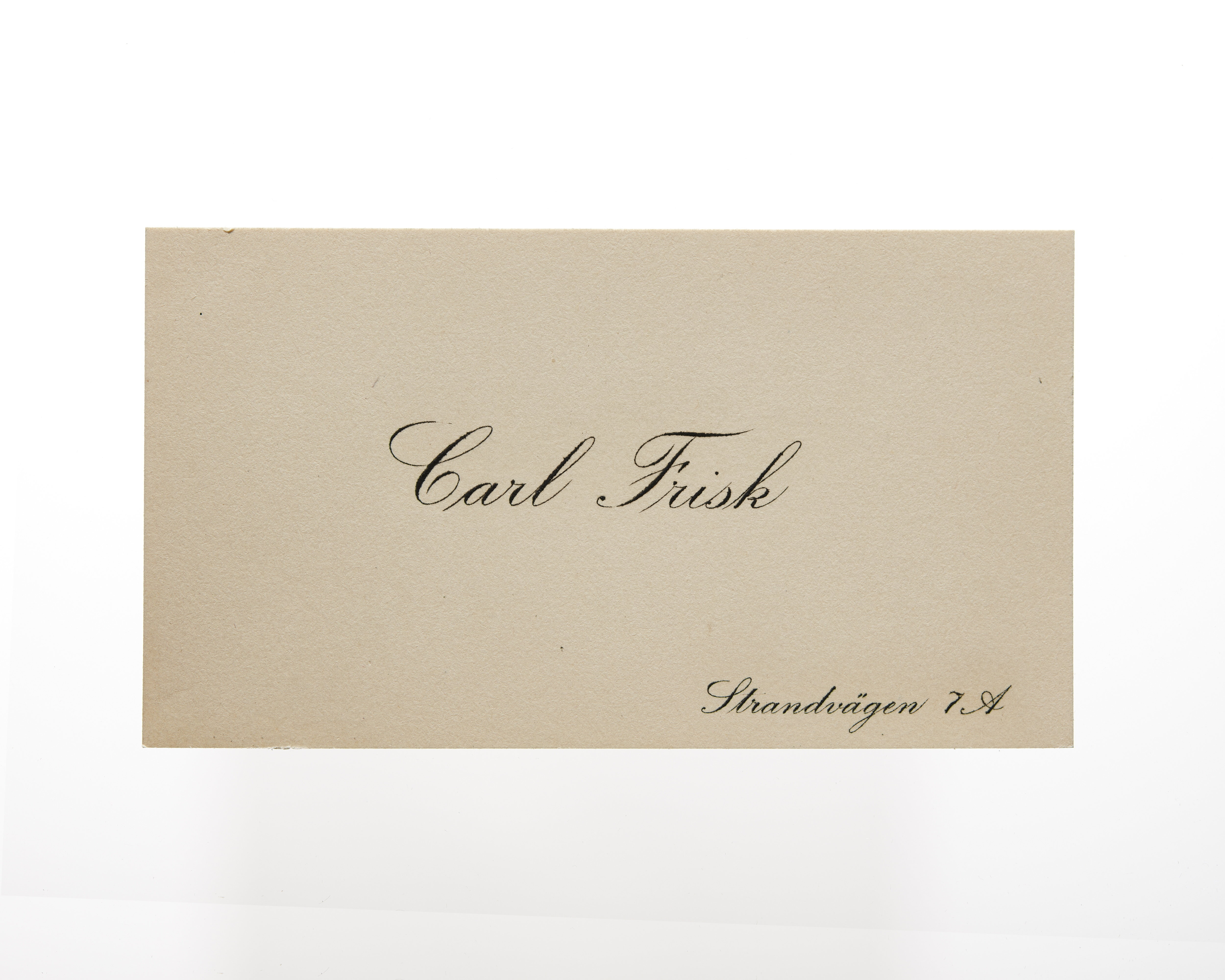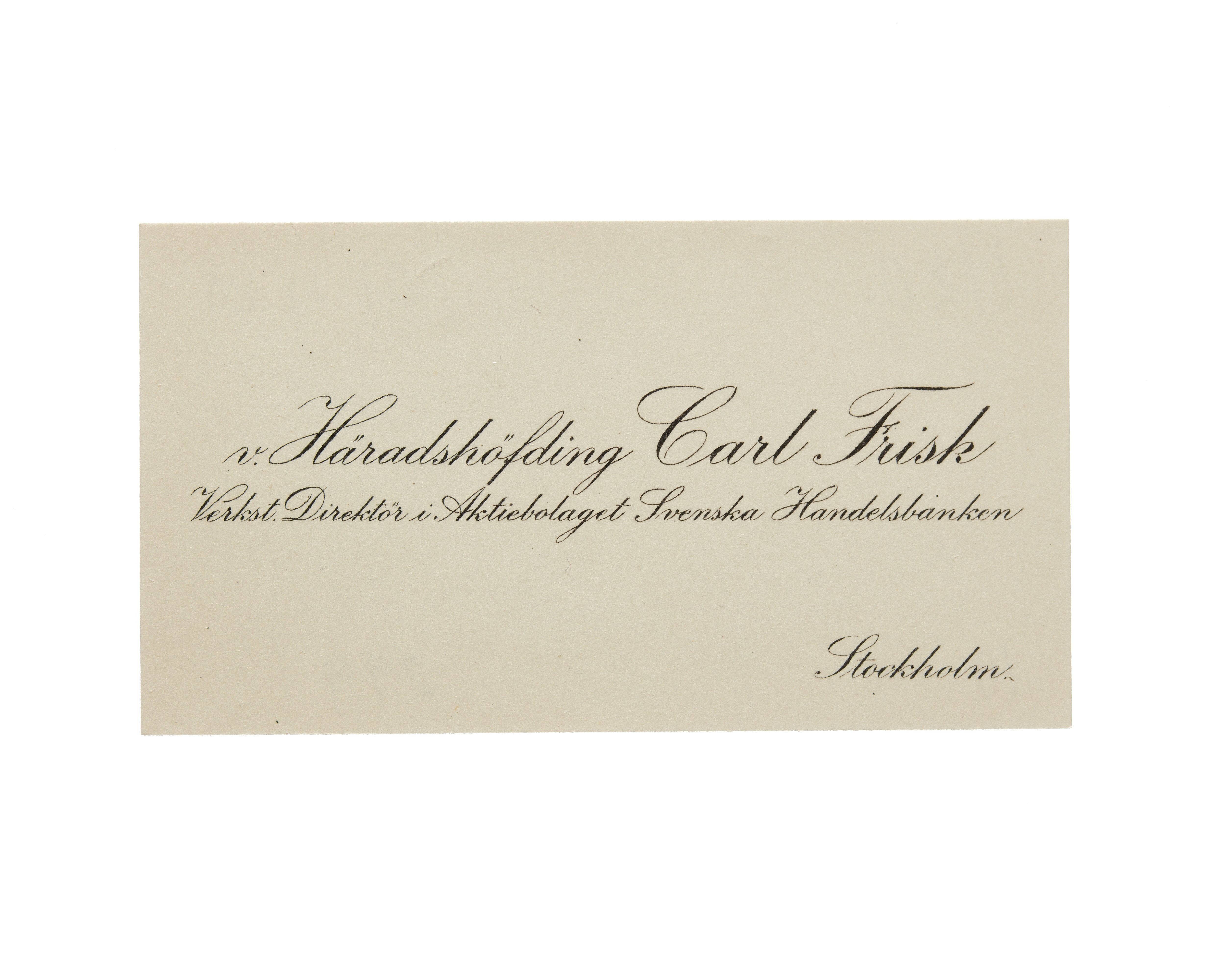 Tio visitkort från Carl Frisk, häradshövding. Första kortet daterat 31.12.1915. Adress (nedre högra hörnet) Strandvägen 7. A. Andra kortet daterat 23.12.1916. Tredje kortet daterat 30.12.1917. Fjärde kortet daterat 30.12.1917. Femte kortet daterat 1918. Sjätte kortet daterat 1918. Sjunde kortet daterat 30.12.1919. Åttonde kortet daterat 30.12.1919. Nionde kortet daterat 26.01.1919, vikt i övre högra hörnet. Står på kortet "Verkst direktör i Aktiebloget Stockholms Handelsbank". Handskrift (nedanför namnet) "Med en vardsama helsning (Hälsning)!". Tionde kortet daterat 31.12.1920.