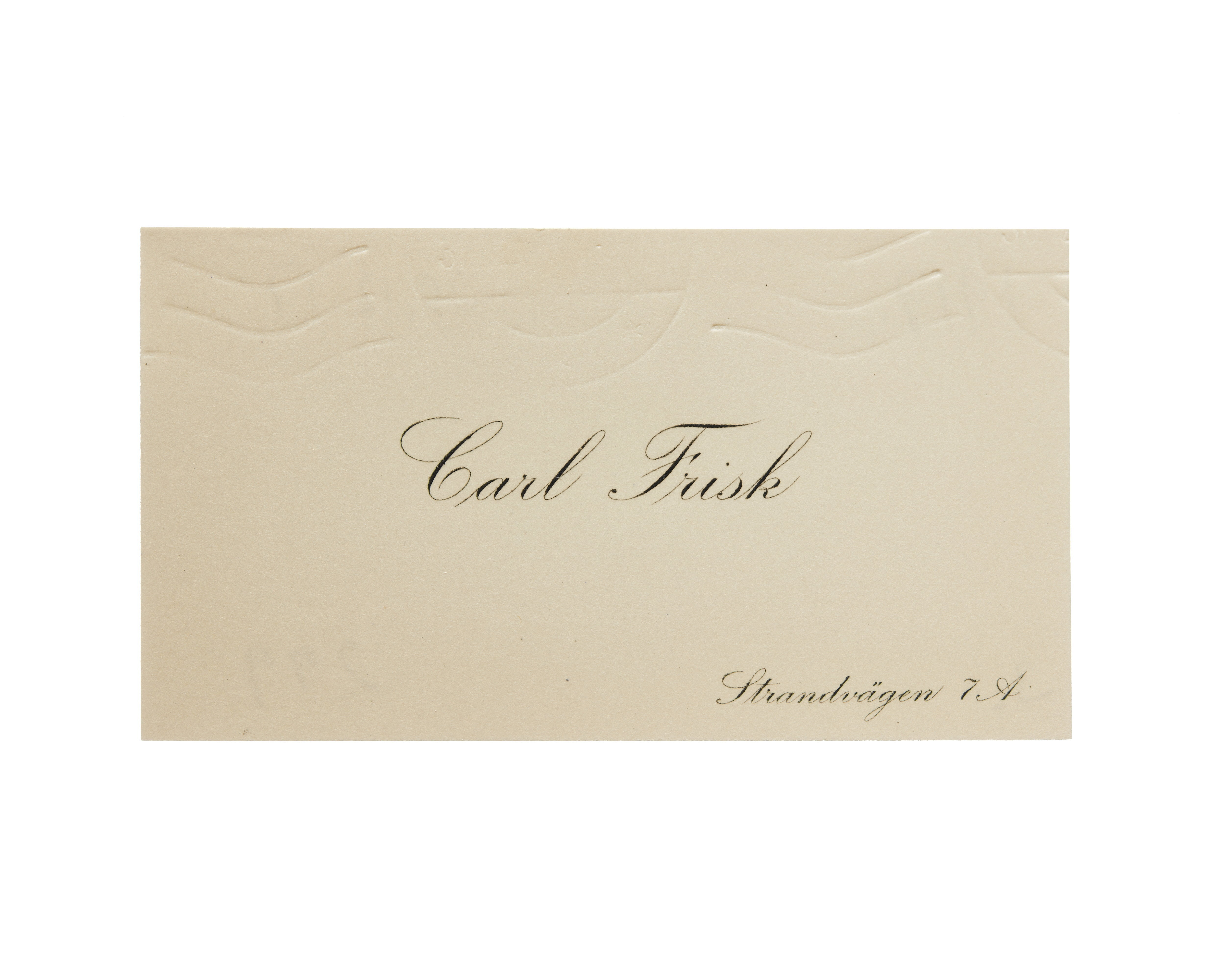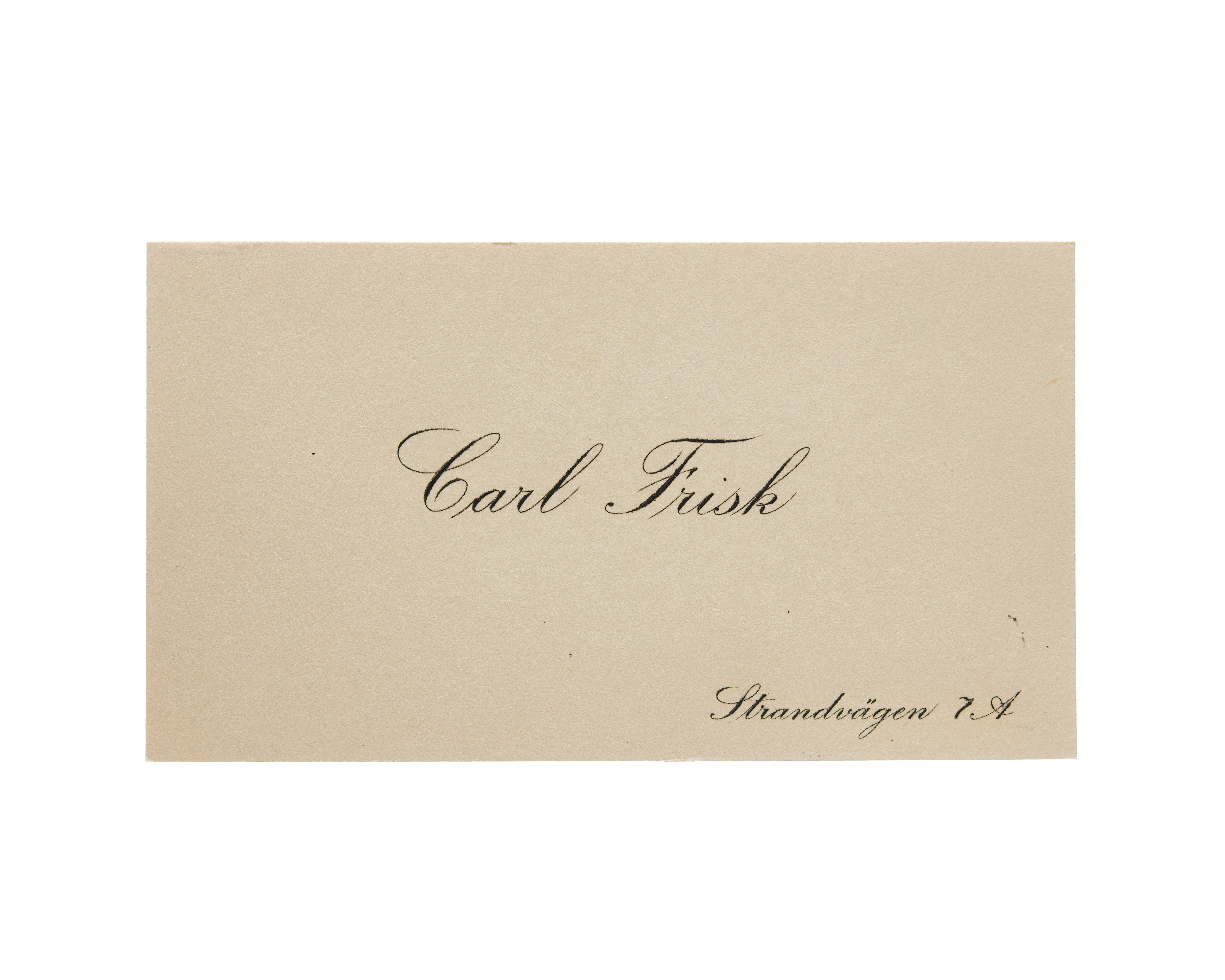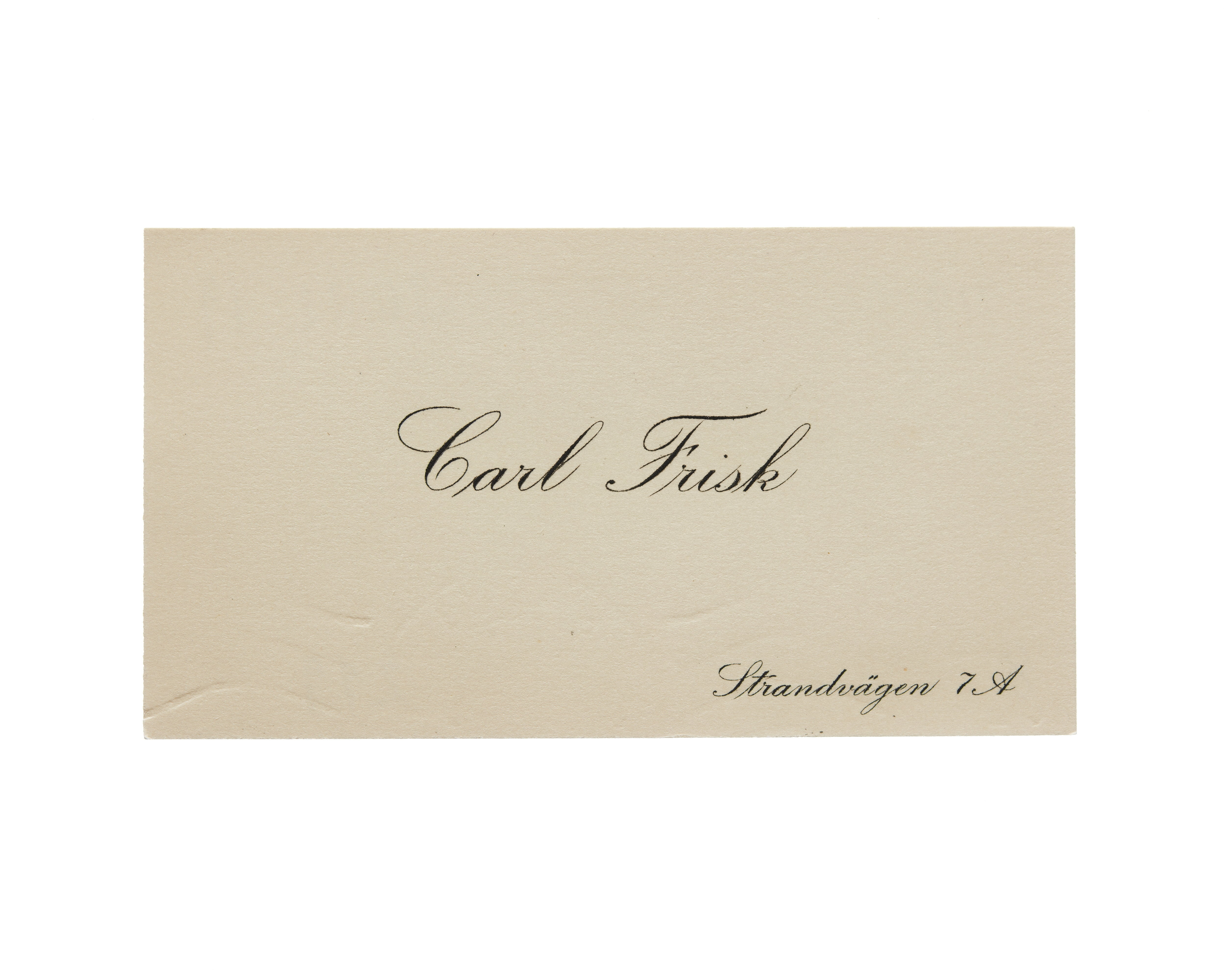 Tio visitkort från Carl Frisk, häradshövding. Första kortet daterat 31.12.1915. Adress (nedre högra hörnet) Strandvägen 7. A. Andra kortet daterat 23.12.1916. Tredje kortet daterat 30.12.1917. Fjärde kortet daterat 30.12.1917. Femte kortet daterat 1918. Sjätte kortet daterat 1918. Sjunde kortet daterat 30.12.1919. Åttonde kortet daterat 30.12.1919. Nionde kortet daterat 26.01.1919, vikt i övre högra hörnet. Står på kortet "Verkst direktör i Aktiebloget Stockholms Handelsbank". Handskrift (nedanför namnet) "Med en vardsama helsning (Hälsning)!". Tionde kortet daterat 31.12.1920.