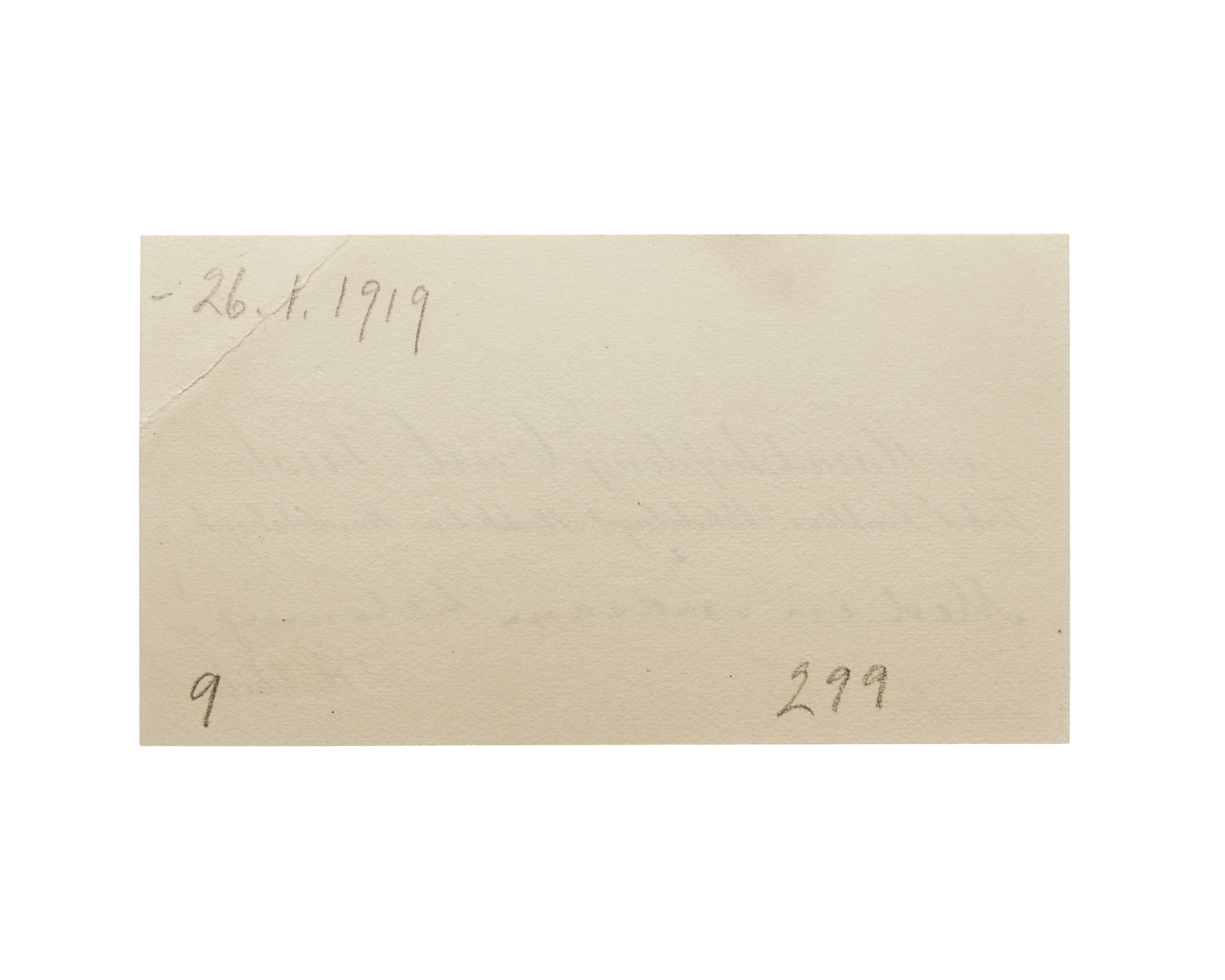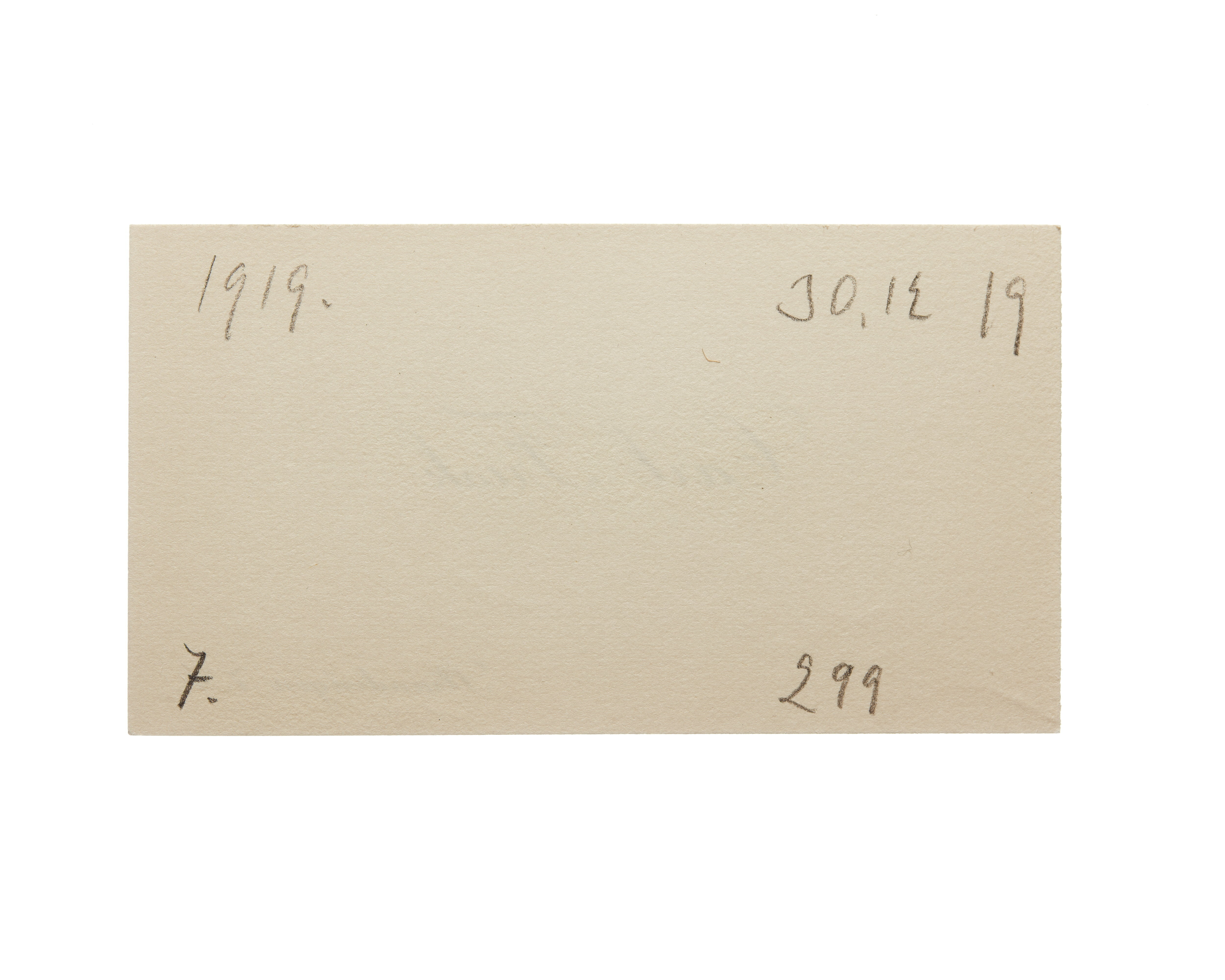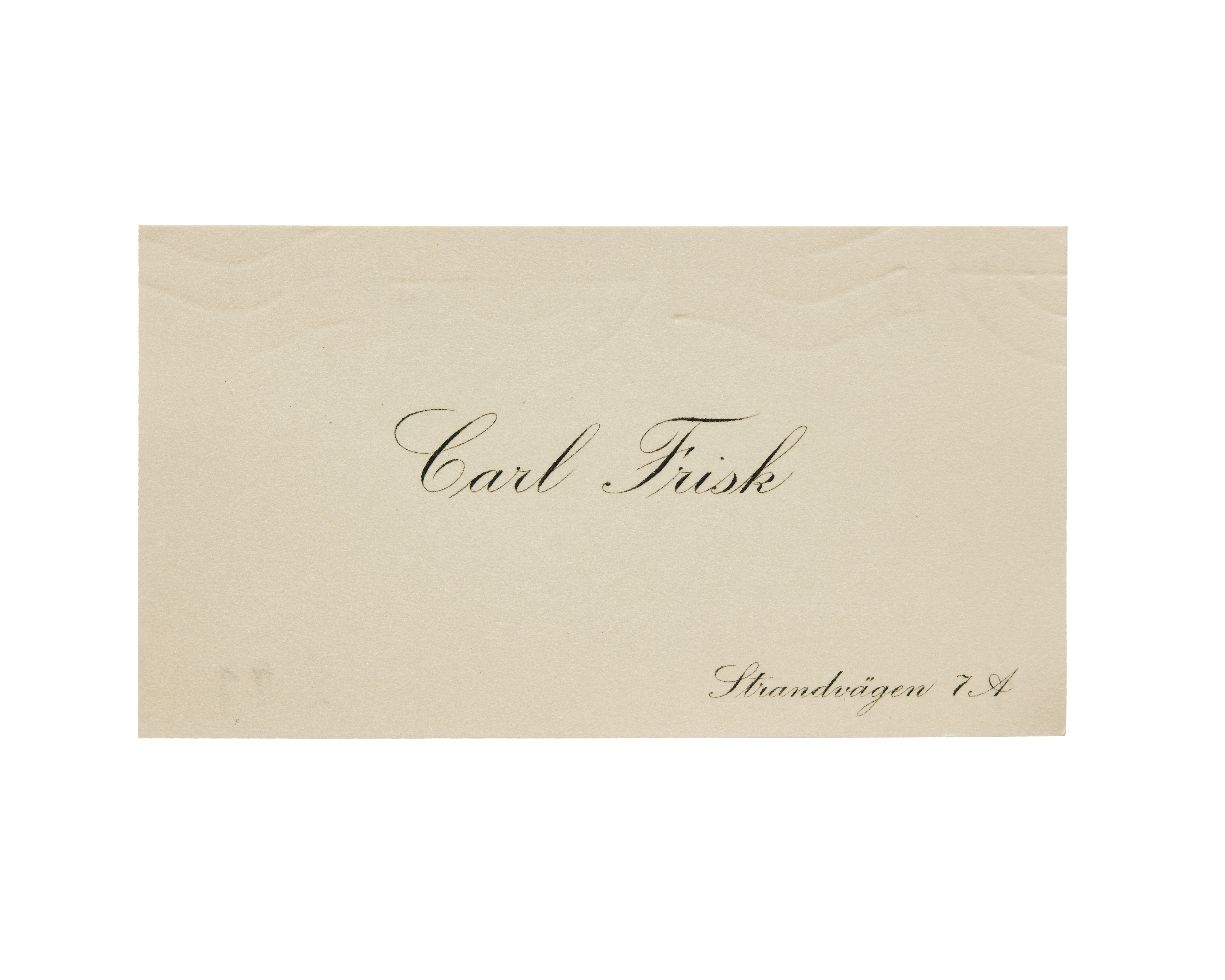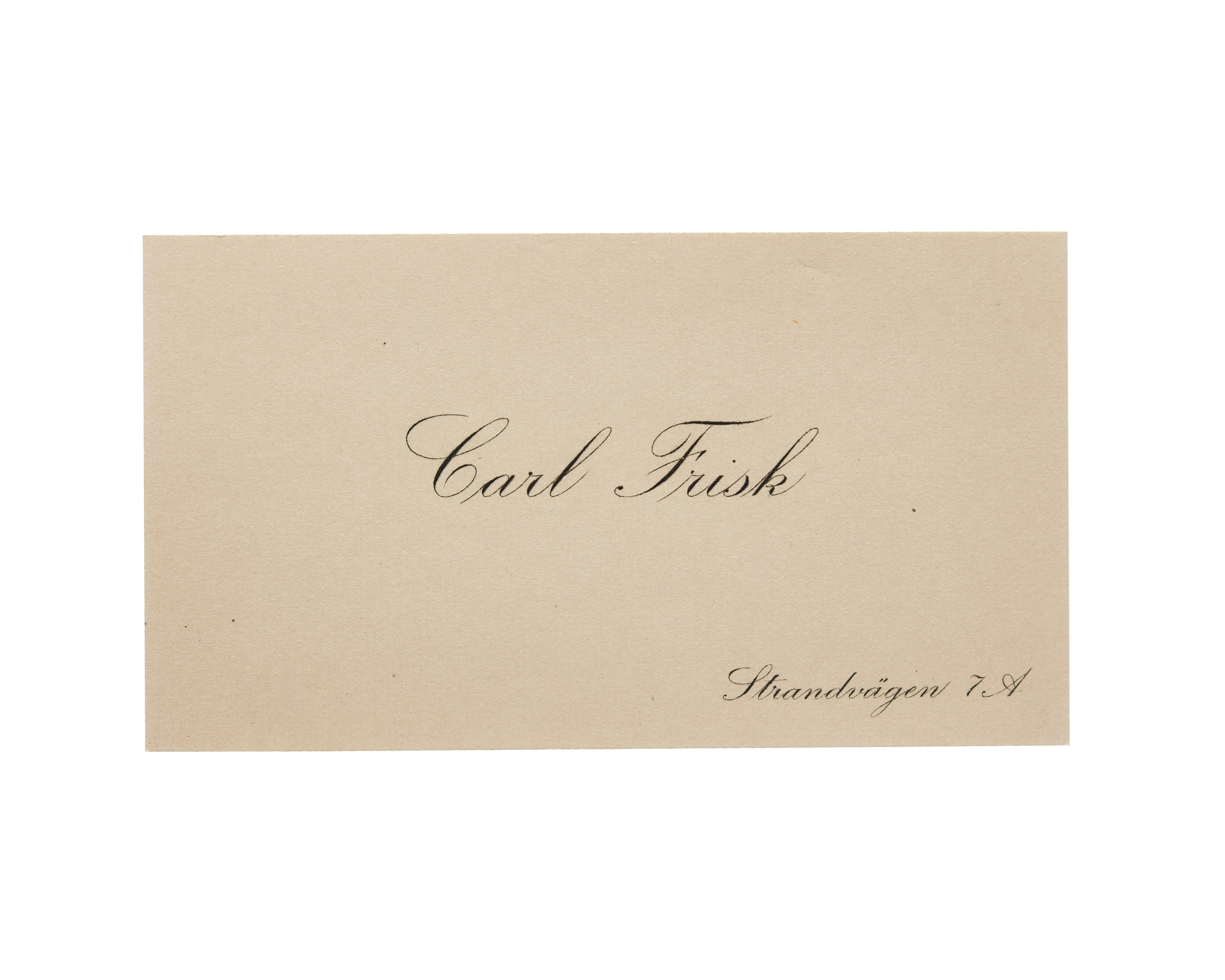Tio visitkort från Carl Frisk, häradshövding. Första kortet daterat 31.12.1915. Adress (nedre högra hörnet) Strandvägen 7. A. Andra kortet daterat 23.12.1916. Tredje kortet daterat 30.12.1917. Fjärde kortet daterat 30.12.1917. Femte kortet daterat 1918. Sjätte kortet daterat 1918. Sjunde kortet daterat 30.12.1919. Åttonde kortet daterat 30.12.1919. Nionde kortet daterat 26.01.1919, vikt i övre högra hörnet. Står på kortet "Verkst direktör i Aktiebloget Stockholms Handelsbank". Handskrift (nedanför namnet) "Med en vardsama helsning (Hälsning)!". Tionde kortet daterat 31.12.1920.