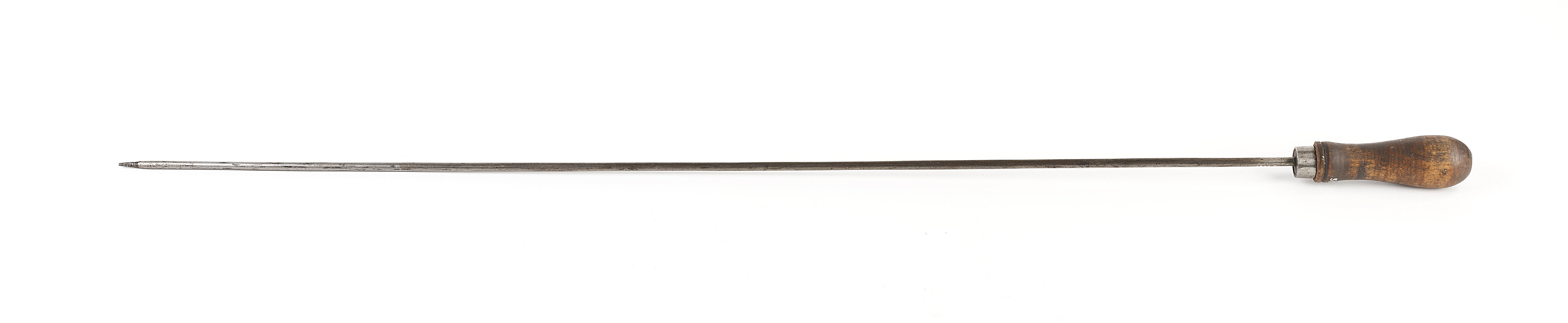 Svarvat skaft av björk med stålring. Möjligen avsett för rengöring av bössa.