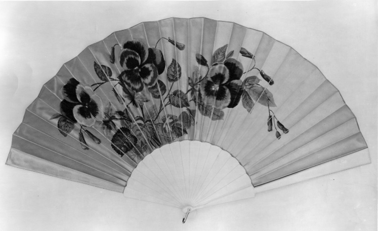 Stomme av ben, 18 blad, ytterblad med fasade kanter, bakre ytterbladet avbrutet nertill. Skärm av ljust gråblått atlassiden. På utsidan målat assymetrisk blomsterslinga med knoppar, tre stora applicerade blommor (penseer) av silkessammet i olika röda nyanser, luggen delvis nerklippt, likaså tre blad av brun-grön silkessammet, sammeten klistrad på sidenet. Skärmens andra sida odekorerad. Bladen nertill sammanhållna av stålstift, benbrickor, bygel av vitmetall.