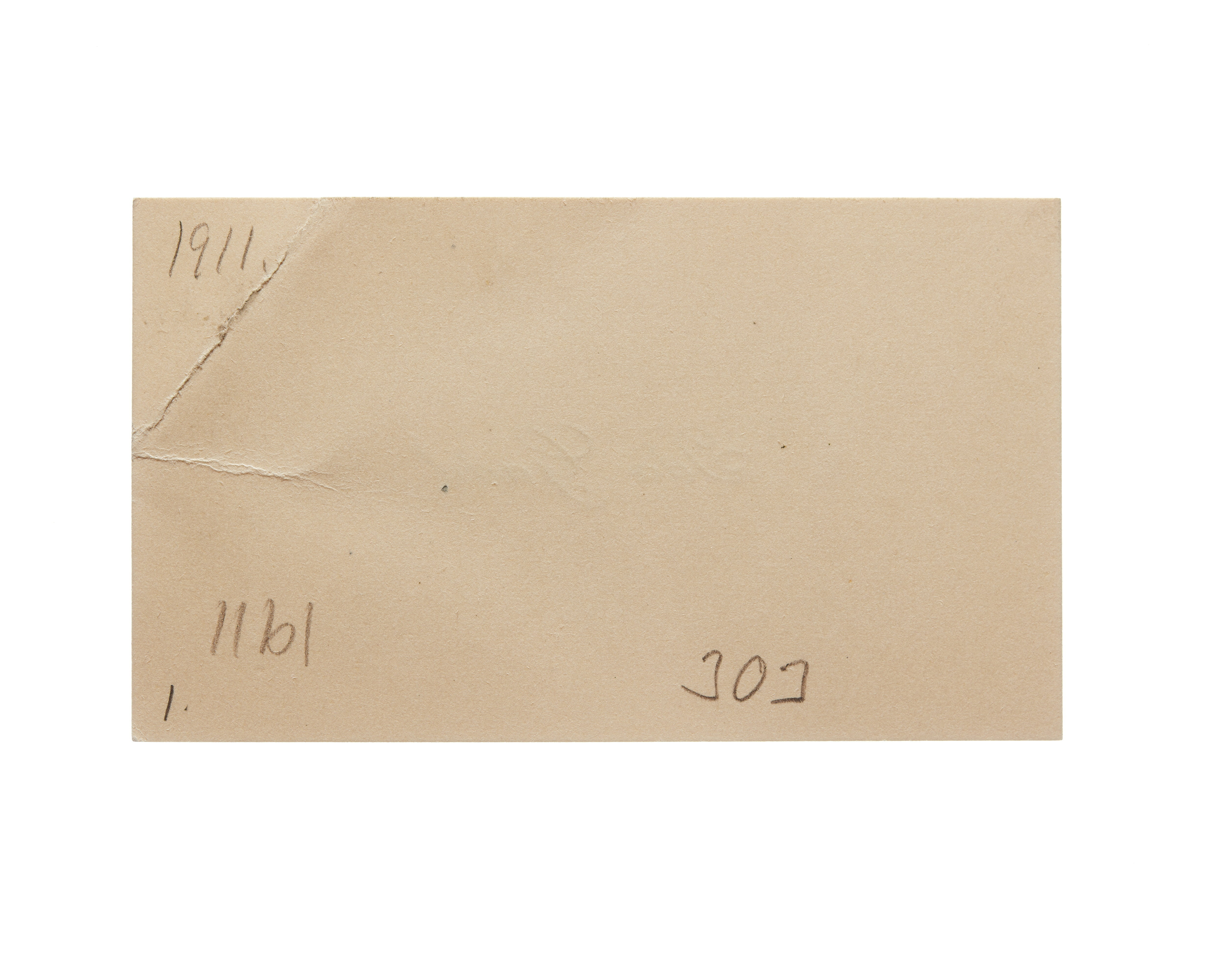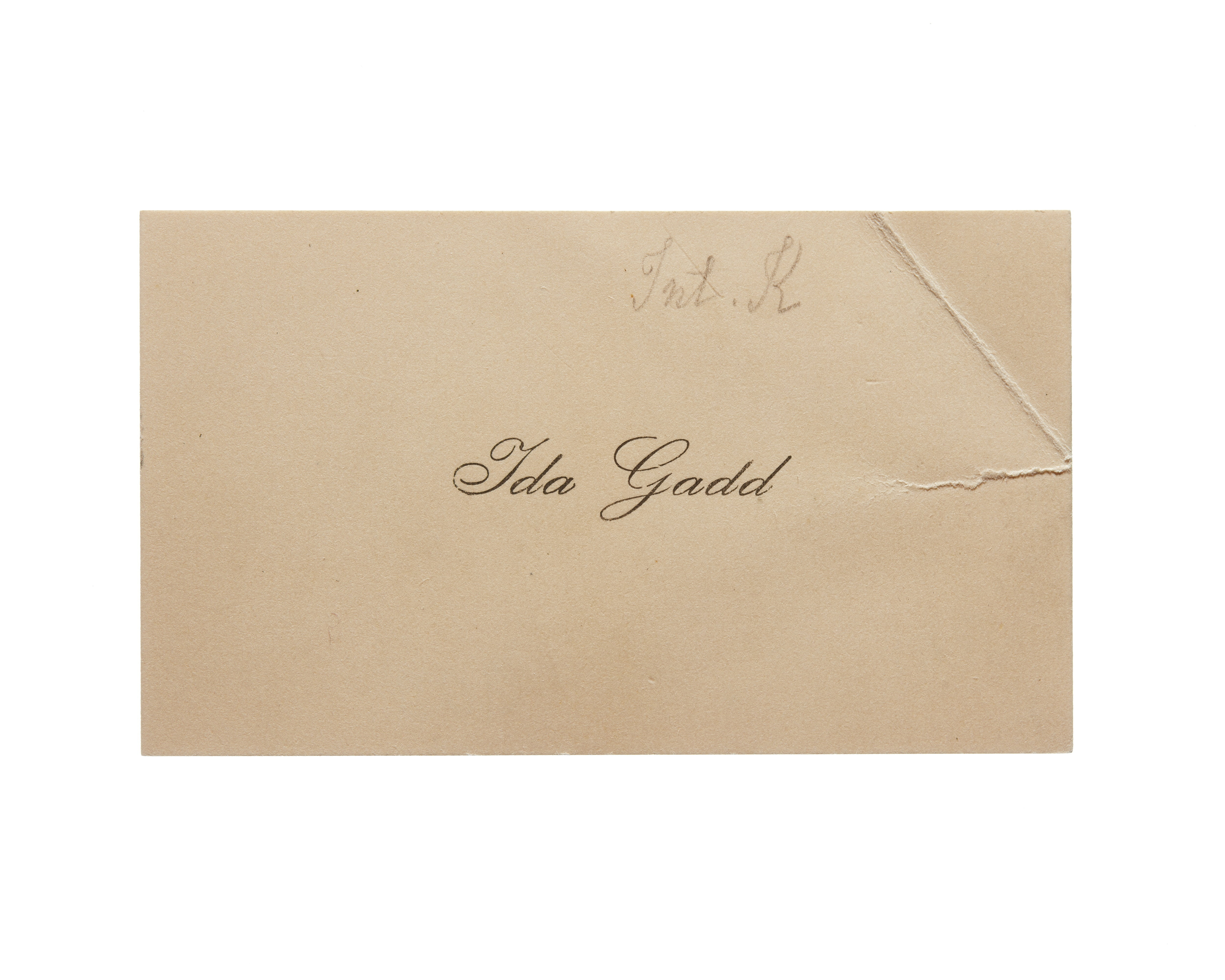 Ett visitkort från Ida Gadd, daterat 1911, vikt i övre högra hörnet. Överlämnat i samband med Internationella kvinnoförbundets kongress i Stockholm 1911.