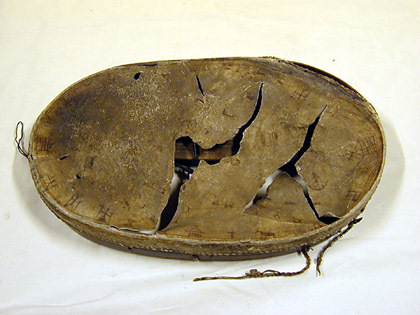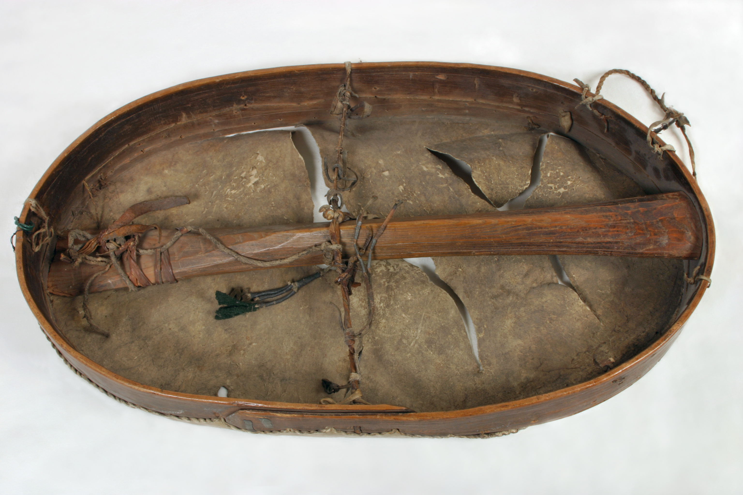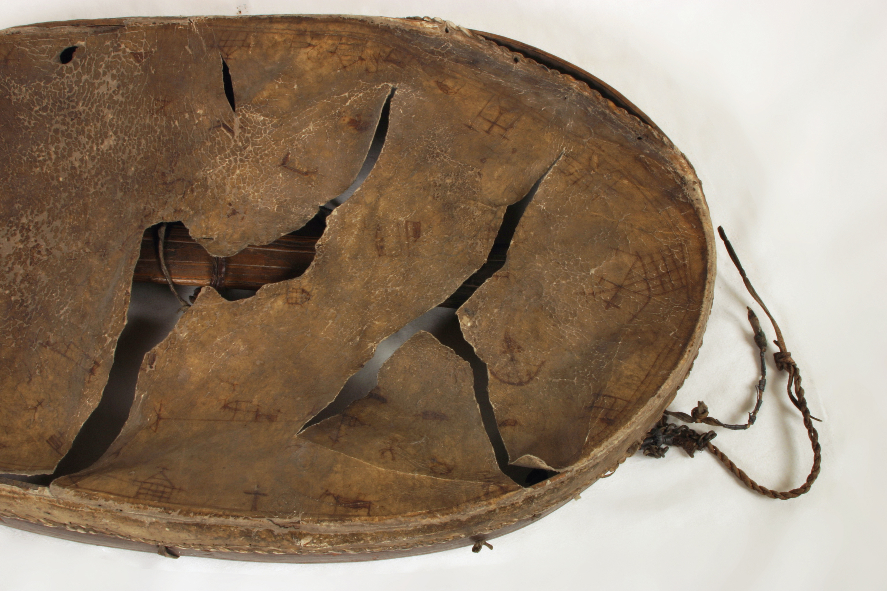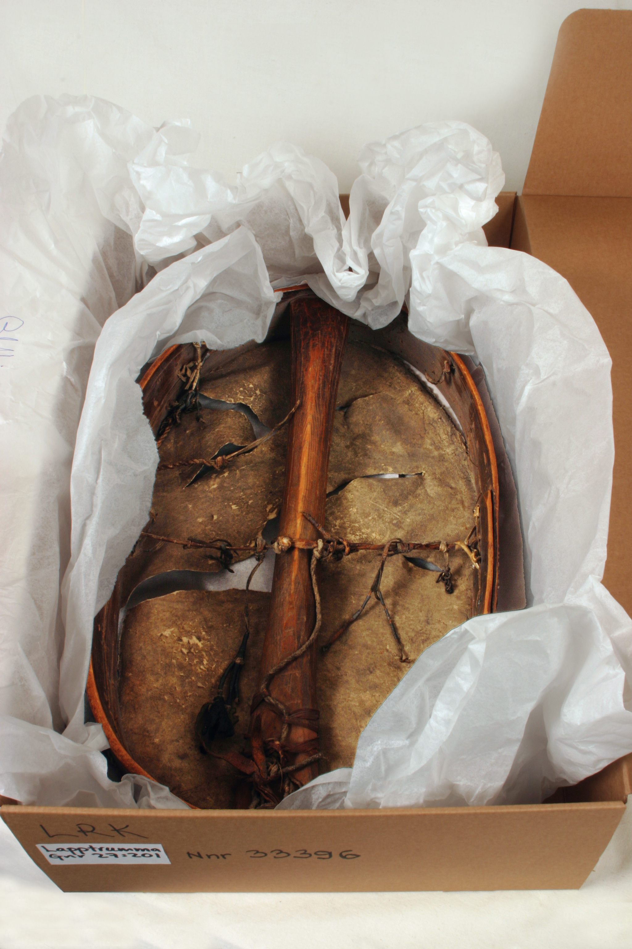 Oval trumma, så kallad ramtrumma, med ställning av trä och längsriktat handtag på undersidan. I ett tvärband på mitten och i ramkantens övre del fragment efter hängen. Utvändigt klädd med pergamentsartat renskinn, fäst med remmar i ställningen. På skinnet målade figurer och symboler i brunt. Till trumman hör trumpinne 20634. "Ao 1694 d. 20 Novembr. lefverass uthi Rust Cammarn en lapp medh een lapmudh och bllå fodrat mösssa lijgandes uthi een akia kiörandes föör sigh een Reenn, medh sijtt tygh på sigh och een klåcka under Hallsen, detta ähr förährat af Landz Härren ifrån Nårlandh Grefwe Duklass"