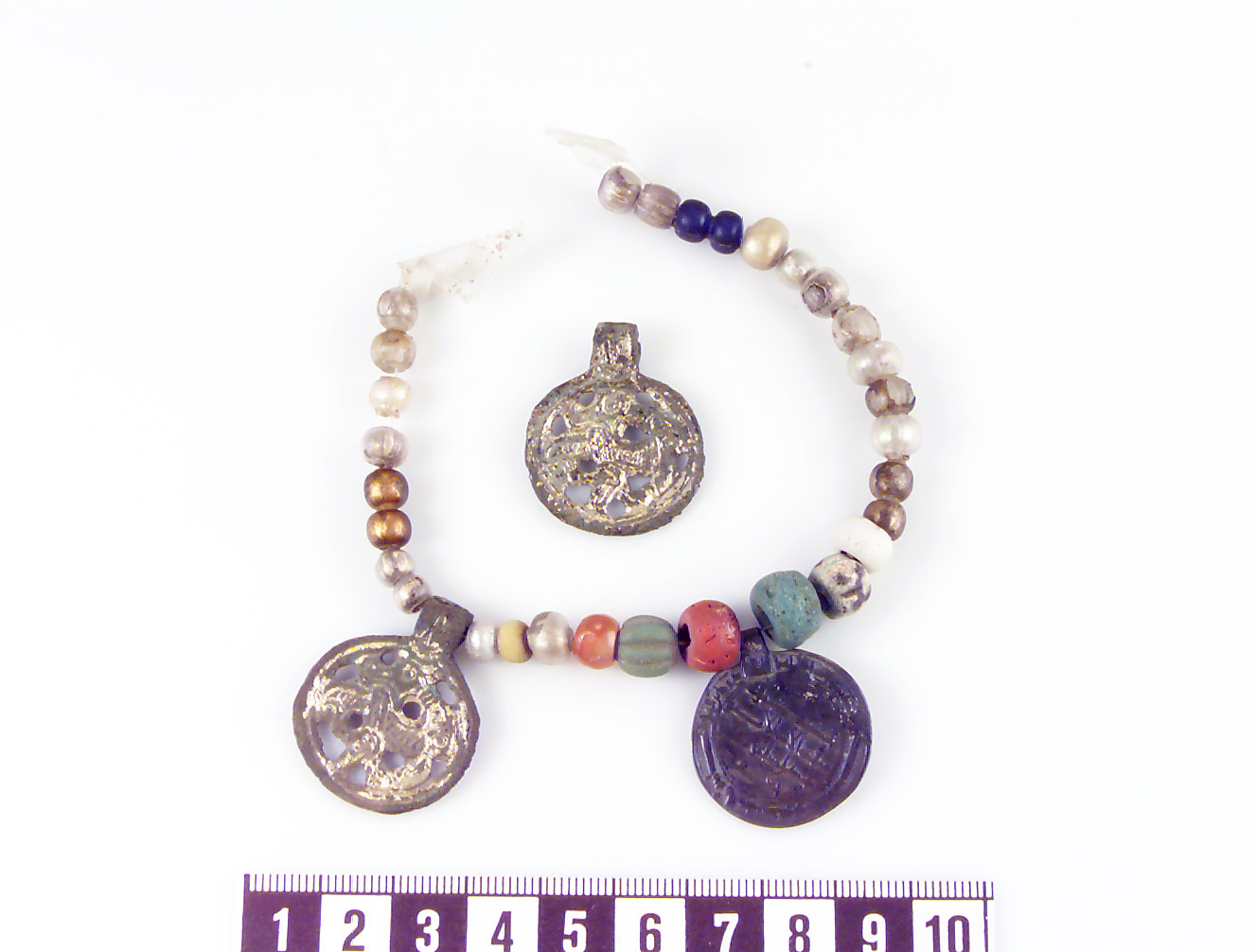 pärluppsättning av 27 pärlor med tre hängen. 2 hängen med djurornamnetik samt 1 mynthänge, arabiskt.