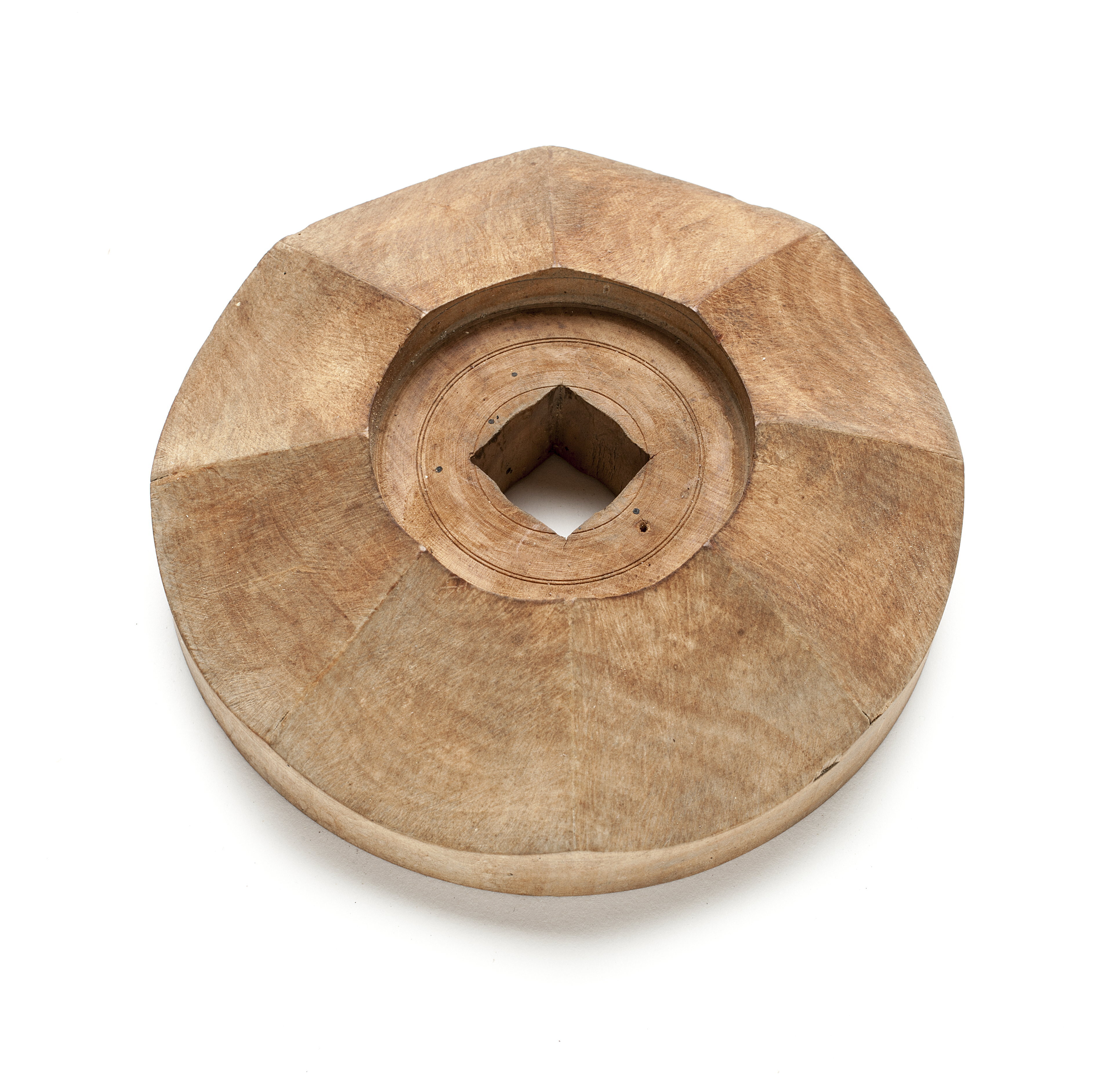Ena sidan plan, den andra har åtta radiella åsar samt rund fördjupning för spindelhylsan, diam 60 mm. Kvadratiskt hål, 20 mm sida. Med rödkrita skrivet: "1".