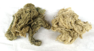 Hopprullade blånor av luddig tråd, möjligen bomullstråd. Två separata suddar varav den ena betydligt mer smutsig med grönaktig ton.