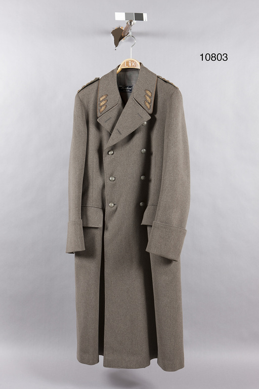 Kappa av grå diagonal, tvåradig med fem knappar för generalitet i vardera raden, d: 22 mm, avmässing, överdragna av en grå skålla, på insidan firmamärke: "C.C. SPORRONG & Co, STOCKHOLM". Två fickor med lock, v. ficka öppen rakt igenom (för sabelbärrem). Nedvikt krage med slag, kantadmed guldsnöre samt på vardera sidan tre ekblad. Axelklaffar täckta av guldgalon med tre stjärnor,korslagda kommandostavar samt en liten knapp d: 14 mm. Sprund mitt bak, 630 mm långt, därovanförslejf, 50 mm hög, knäppt med två knappar d: 22 mm. Ärmuppslag 140 mm breda. Foder av grått siden, två innerfickor. I den h. fickan firmamärke: "Militär Ekiperings AB)) KUNGL.HOFLEVERANTÖR)) Stockholm den 29.9.1942.)) Herr H.K.H.)) Prins Carl." Utmed fodrets kant 16 små gråknappar d: 14 mm.