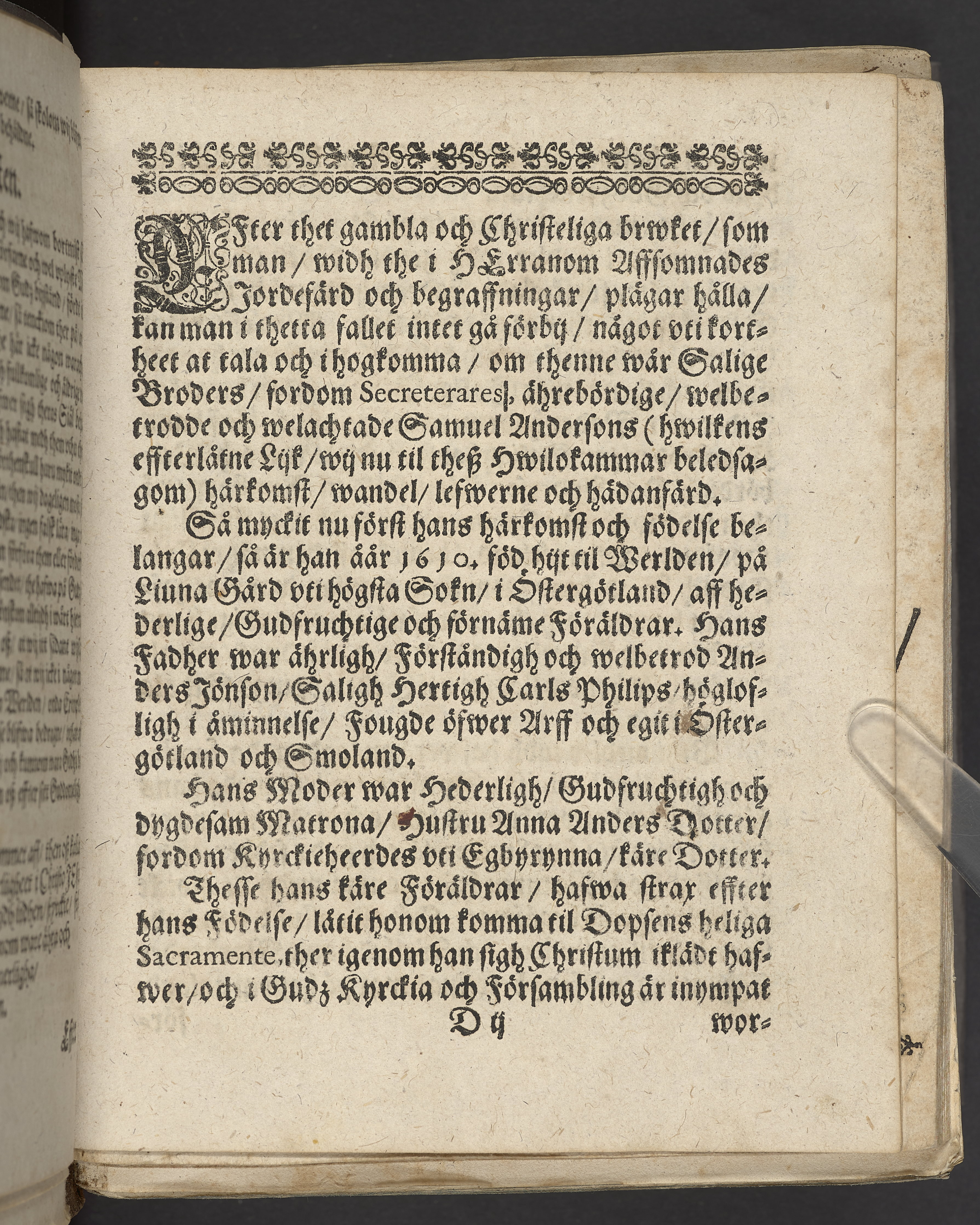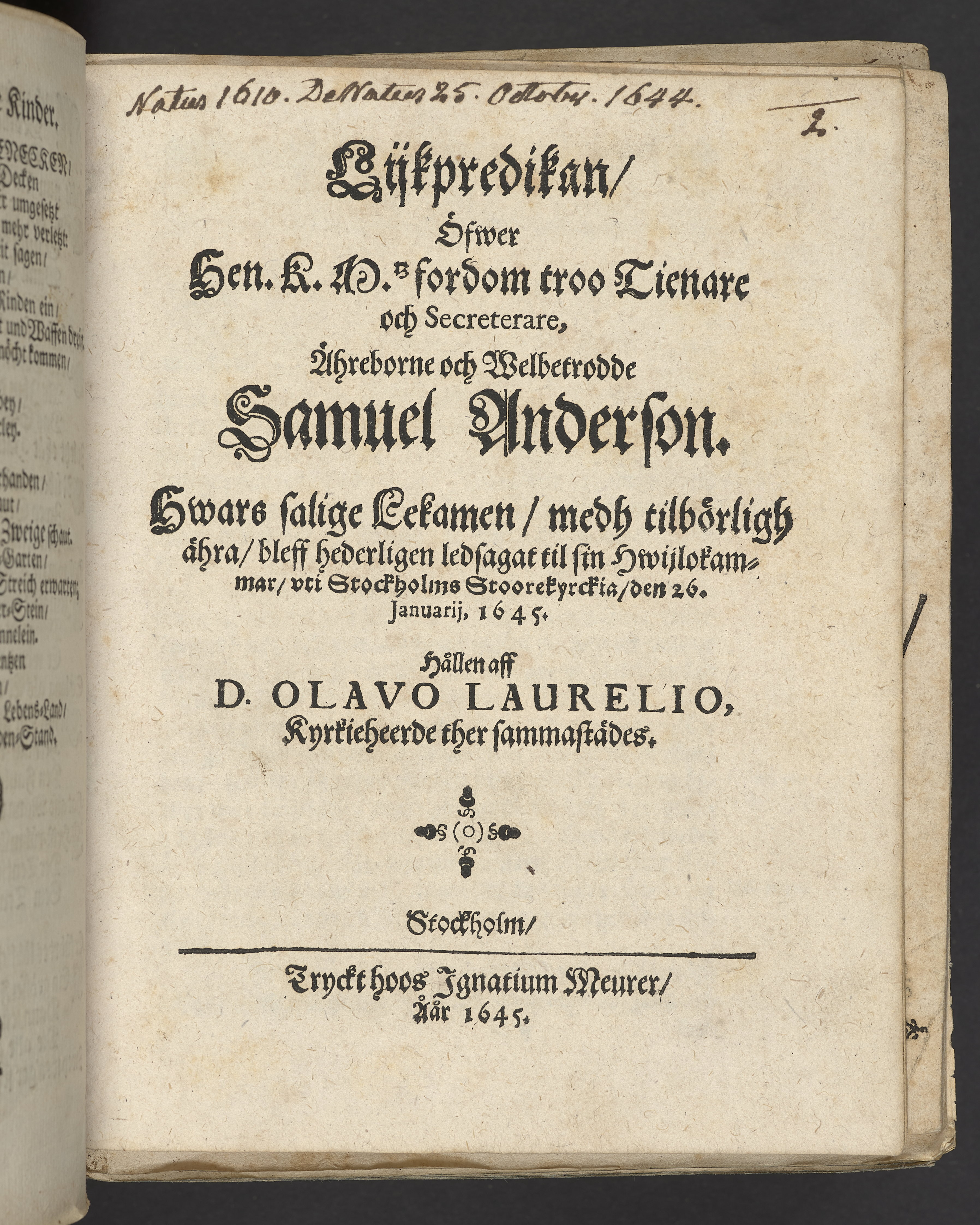 Lijkredikan, öfwer... Secreterare... Samuel Anderson... vti Stockholms stoorekyrckia, den 26. januarii. 1645. Hållen aff D. Olavo Laurelio... Stockholm, tryckt hoos Ignatium Meurer, åår 1645.