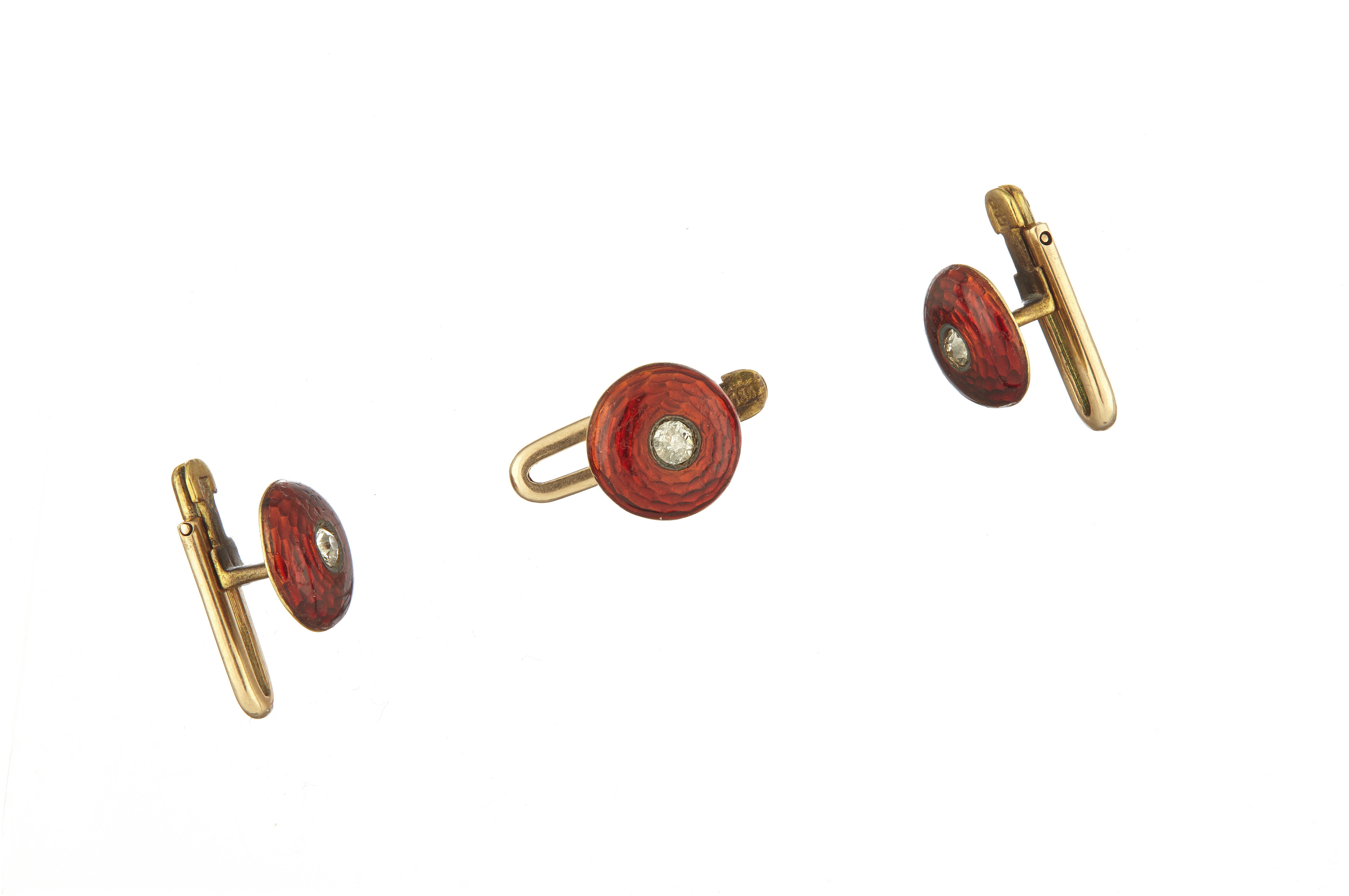 Runda, svagt välvda plattor av guld, täckta på ovansidan med röd, genomsynlig emalj, i mitten infattat en briljant. Fyrkantigt skaft av guld, l: 4 mm, därifrån i vinkel gående arm, l: 6 mm, stämplad: 585, på armen fäst u-formig, vikbar del, l: 11 mm. Förvaras i vit pappask från hovjuvelerare David Andersen & Co, Fredsgatan 4, Stockholm.