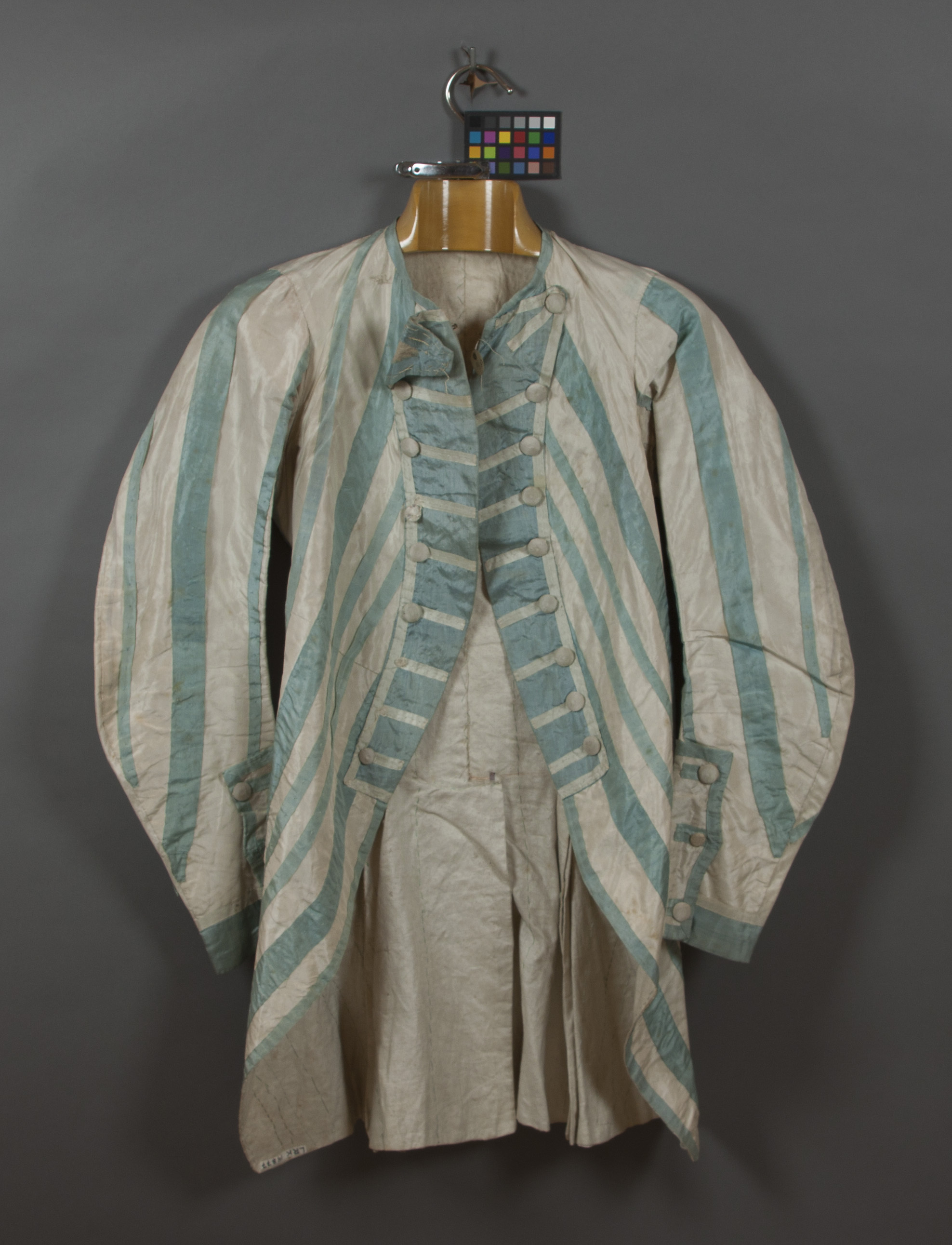 TILLÄGG: Upptagen som "En Catalans klädning" under rubriken "Ballet och Pantomime Kläder" i inventariet över slottsteatern på Rosersbergs slott [1806]. Förteckningen ingår bland Karl XIII:s bouppteckningshandlingar. Sammanlagt nio manliga dansdräkter av detta slag har bevarats i Livrustkammaren. Dräkterna består av rock, väst och byxa. En mössa av vit taft "randad med ljusblå tafts band" har ursprungligen hört till, men är idag inte bevarad. Plaggen följer det sena 1700-talets snitt, men har också flera drag typiska för teaterkostymer som de påsydda ränderna och den falska knäppningen. Regionala karaktärer (som "katalaner") ingick vanligtvis i den komiska dansgenren i tidens pantomimer och baletter. Den vita och blå färgen hänvisar dock inte till någon specifik nationell eller regional dräkt, utan snarare till den typiska framställningen av herdar eller bybor på den franska scenen. I italiensk commedia dell' arte refererar de blå ränderna till karaktären Mezzetino, förebilden för Molières Scapin. Flera av de katalanska dräkterna är märkta med namn som överensstämmer med de hovmän som spelade en grupp sjömän, Castellans, i divertissemanget "En venetiansk fest" på Stockholms slott 1777. Det är därför möjligt att benämningen på dräkten är en felskrivning. Hela arrangemanget var utformat av Gustav III som en överraskning för hans mor, Lovisa Ulrika. Bland annat uppträdde här två grupper med sjömän, eller "Nicolettes et Castellans" som Gustav III skriver. I detta sammanhang är det logiskt och troligt att man vid utformningen kan ha inspirerats av kostymerna från commedia dell'arte-figurer. Utökad dokumentation utförd i samarbete med fil.dr. Petra Dotlačilová.