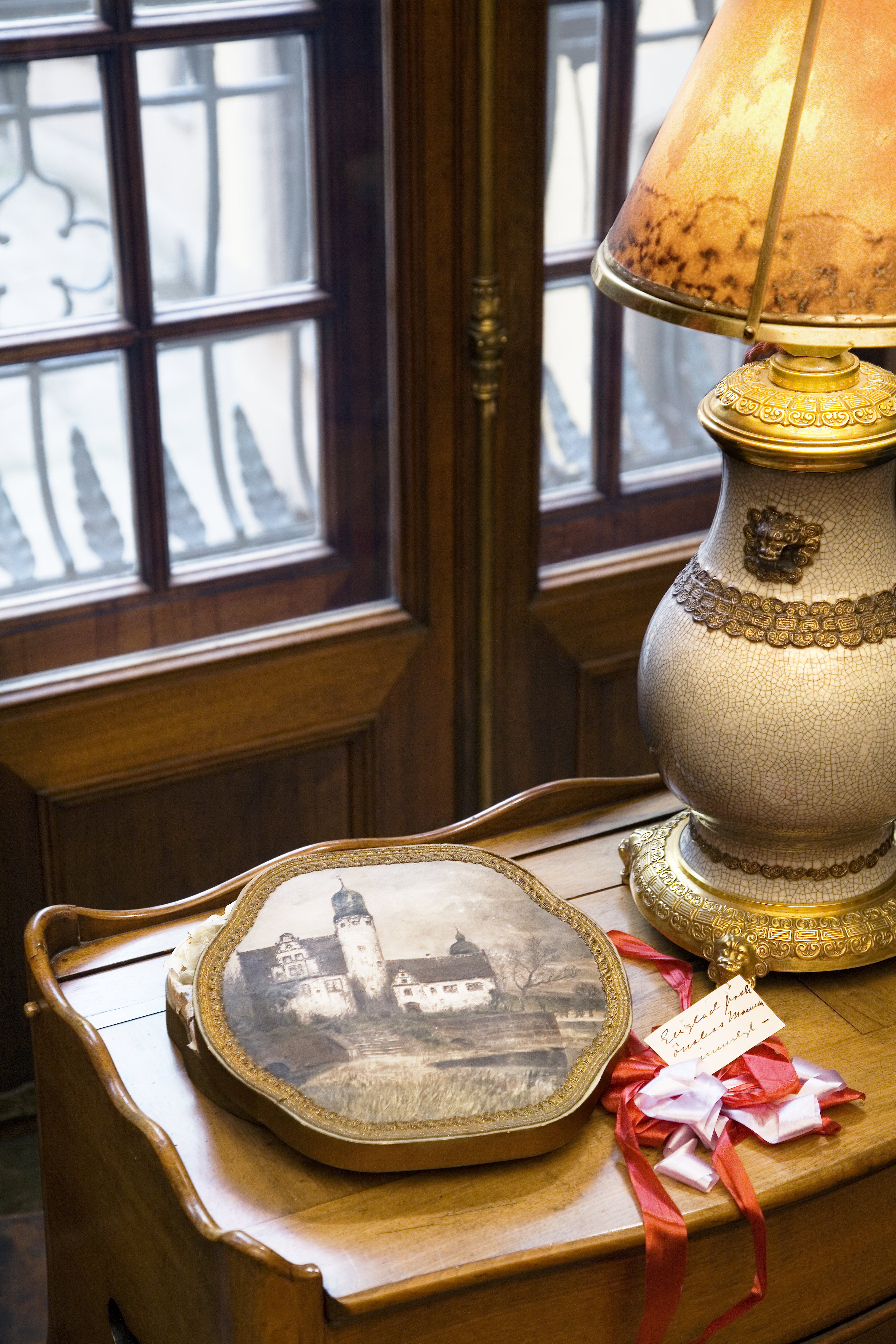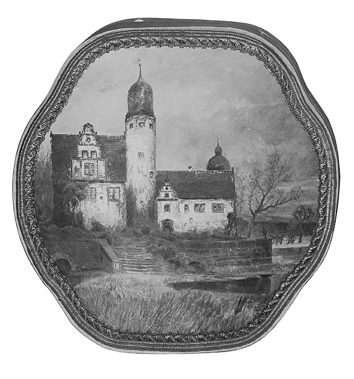 KONFEKTASK Av papp. Sexsidig, (nästan rund) med utanpågående kupigt trycklock samt klädd med guldbronserad papper; på locket ett slott med högt runt torn samt gråa väggar och brunt tak; framför slottet en murad terrass med trappa samt gråbruna buskar, till höger stora träd; i förgrunden och till vänster ett vatten, hitre stranden med grön vass; kring kanten en pålagd list av guldtråd. Inuti asken över- och underlägg av vitt papper med genombrutna pressade kantbårder samt gelatinpapper, varpå i guld: "Oskar Berg, Stockholm" dessutom ett rött sidenband, med stor rosett av röda och blågredelina band jämte ett kort, varpå skrivet med svart bläck "En glad påsk önskas Mamma innerligt". Höjd: 5,1 cm, diameter: 27,5 cm. Gåva (med innehåll) till Wilhelmina von Hallwyl, Påskaftonen 3 April 1926 från hennes dotter Ellen Roosval. Inköpt av den sistnämnda i Oscar Bergs konditori hovleverantör, Regeringsgatan 14, Stockholm.