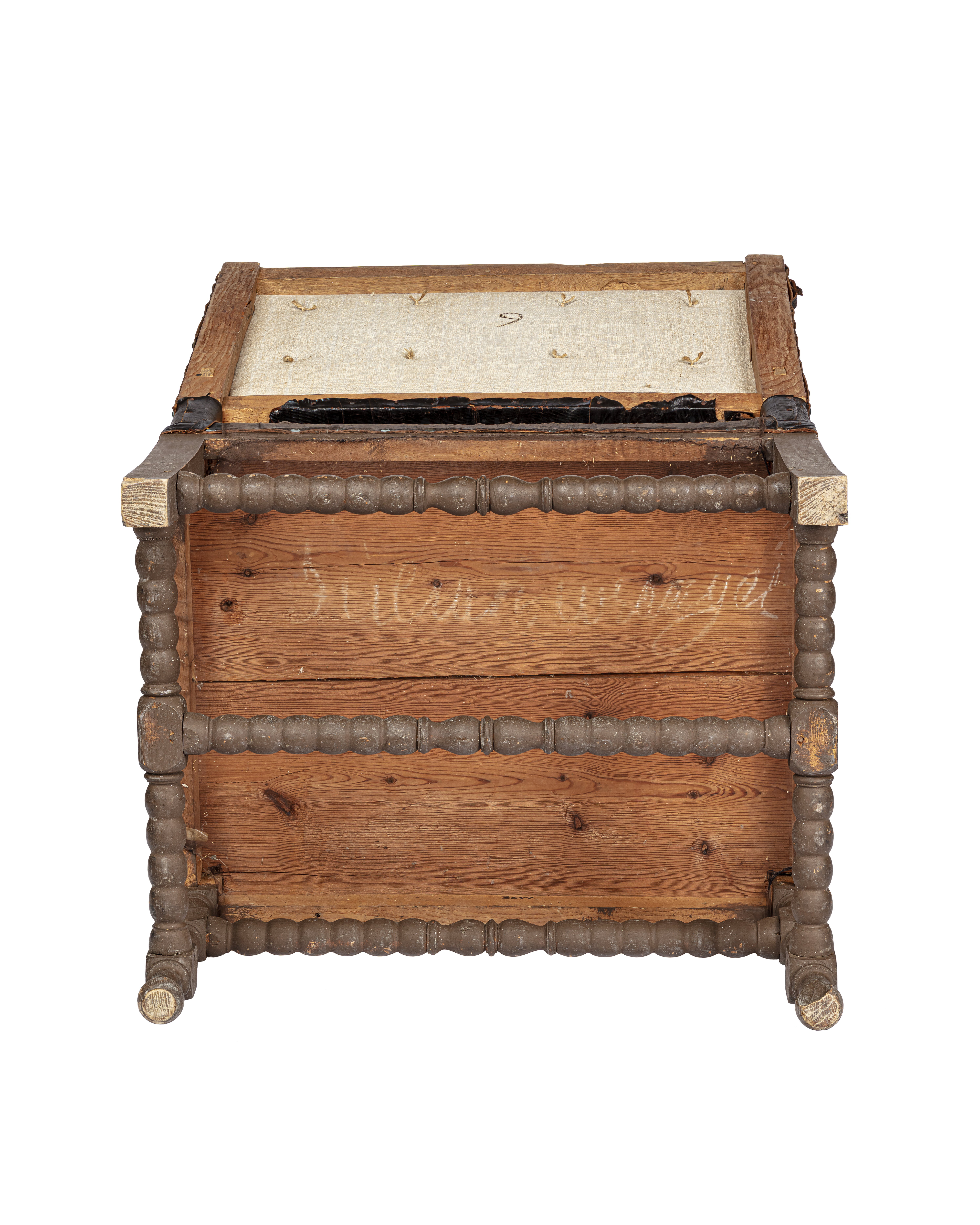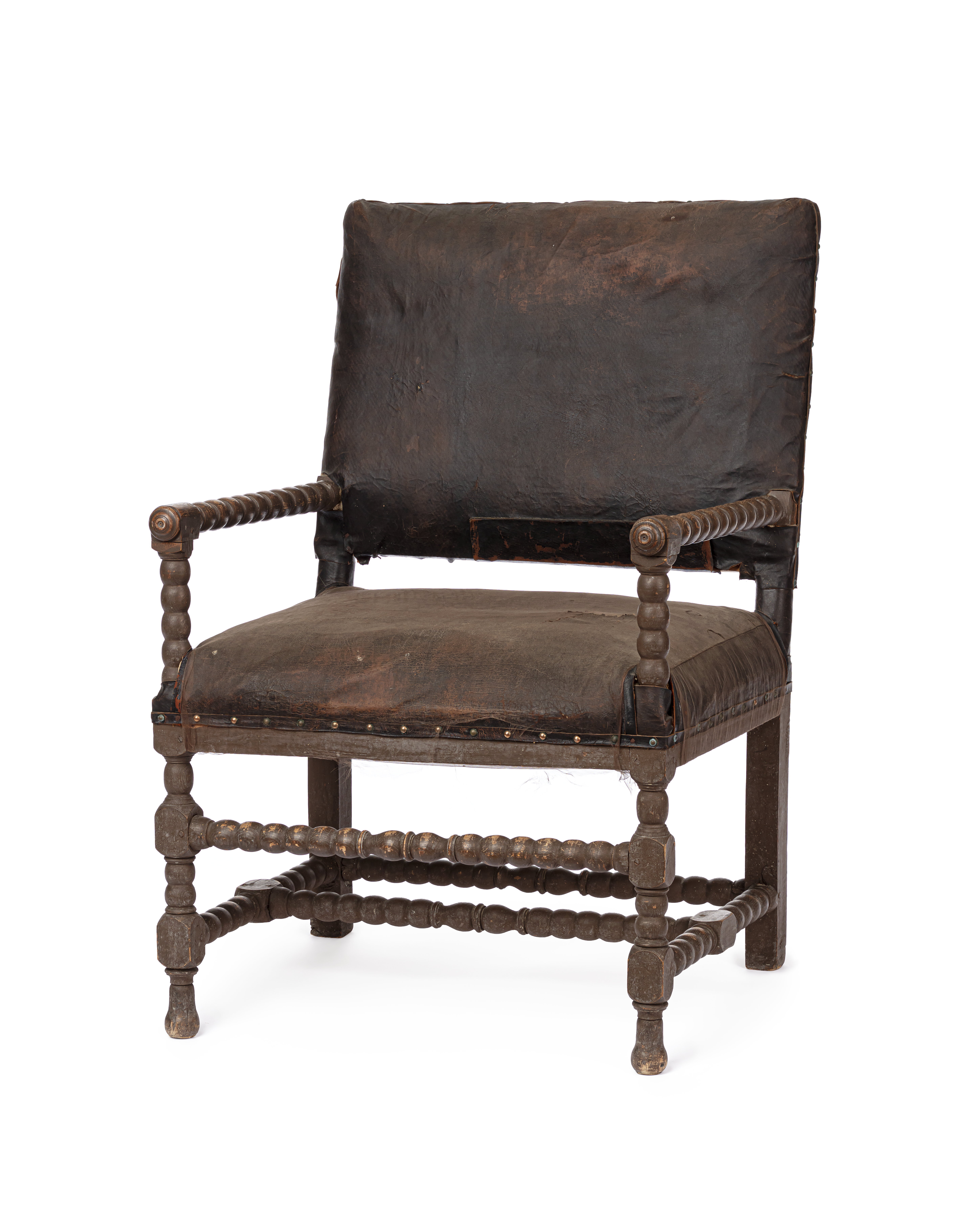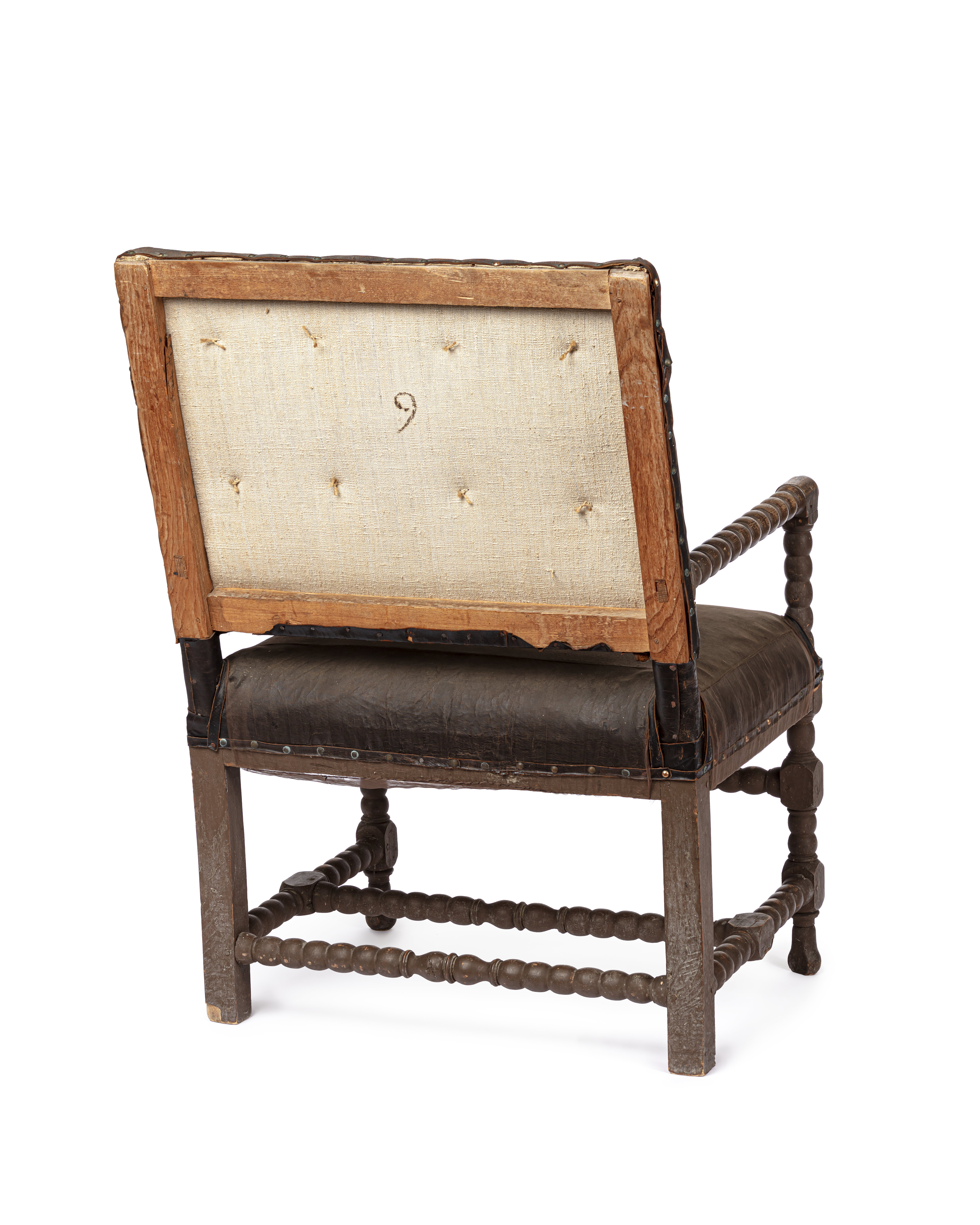 Svarvade ben, slåar, kryss, stolpar och armstöd. Stoppad sits och rygg, klädda med svart skinn. Tännlikor. Märkt i botten med krita "Julian Wrangel" och med svart "9" i ryggen.