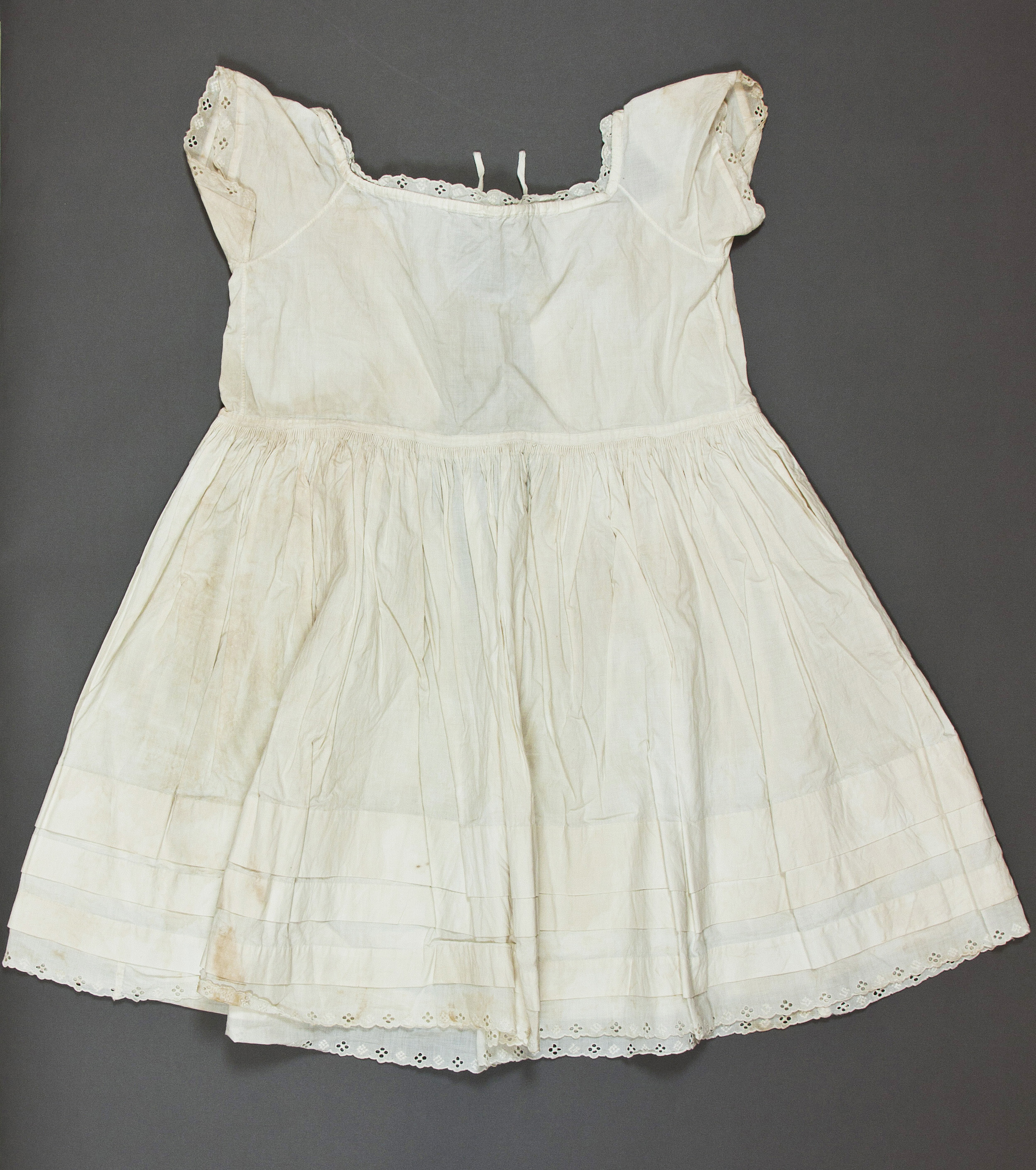 Barnunderklänning av vit bomull med kantbrodyrer föreställande blommor. Nedsydda veck kring kjolen. Tre veck, 40mm, 25mm och 20mm breda. En lång kjoldel och en kortare överdel med korta ärmar. Kjolen är vid och överdelen är rak. Två små knytband på ryggen, ett upptill och ett nertill.