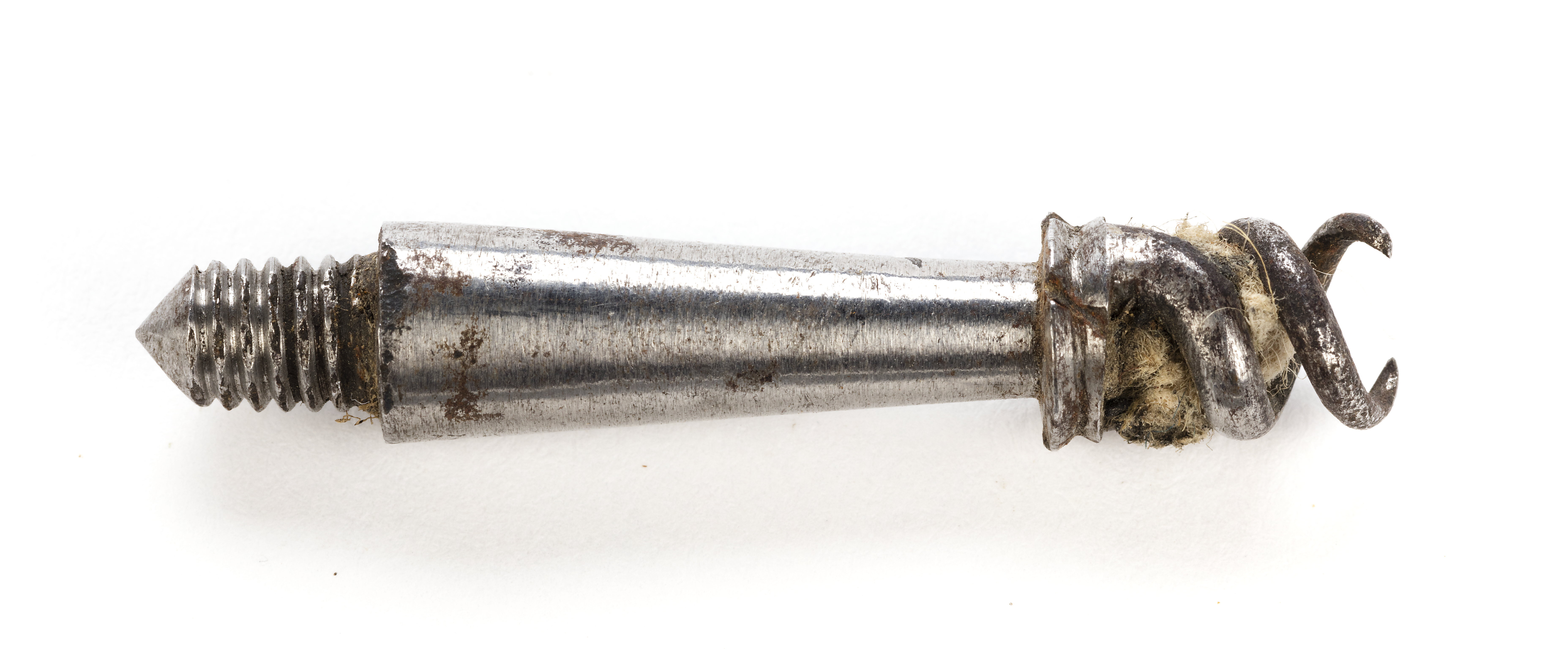 Krats av stål, bestående av en gängad del, l: 88 mm med konisk ände, en framåt avsmalnande, cylindrisk del, l: 23 mm, en smal platta med v-formig skålning på kanten och därpå två om varandra spiralvridna spetsar.