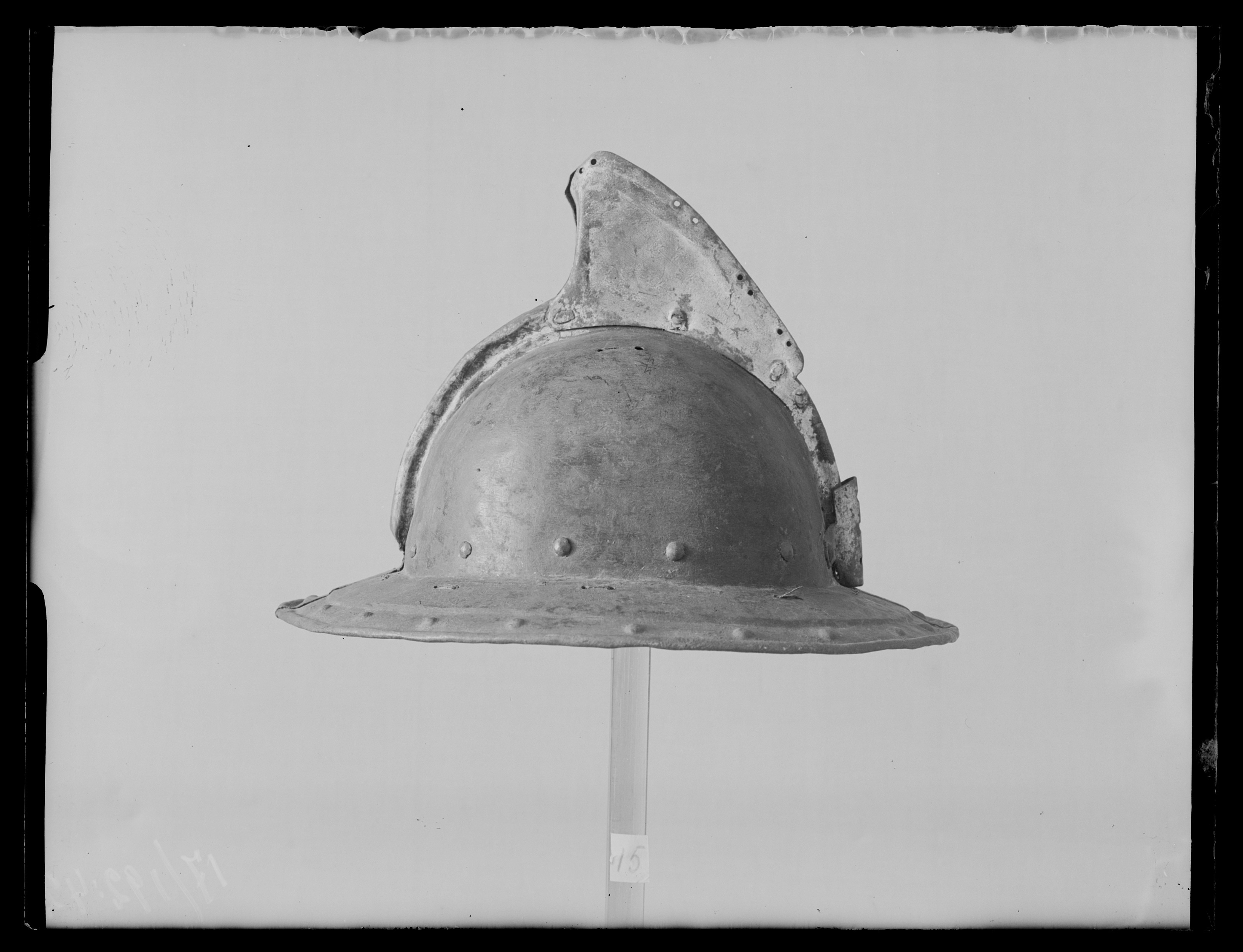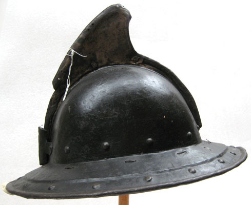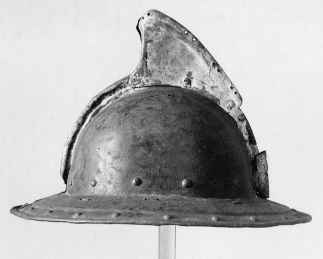 Av driven stålplåt. Utsidan målad svart med nederkant, kamkant och vinge ursprungligen guldgula, tydliga filspår. Insidan med slagmärken. Hjälm bestående av två halvor, sammanfogade i en längsmed klockan löpande kam, omvikt och förstärkt. Klockan rundad. Upptill på kammen är en senare (under 1700-talet) nitad dekoration i form av en trekantig något framåtsvängd vinge av bleckplåt, av två halvor fäst i kammen med tre nitar. Nertill övergår klockan i ett brätte, något neddraget med invikt rundsmidd kant och försänkt bård med falska uppdrivna nitar. På klockan baktill en plymhållare, H 53 mm, nedåt avsmalnande med svagt spetsig överkant och tre hål, fäst med två nitar. I klockan nertill på var sida nitar i rad. I kanten där brättet möter klockan är en rad av små slagna hålpar hela vägen runtom. I klockan upptill är på var sida om kammen ett hålpar. I brättet baktill ett mindre hål, framtill på högersidan två punsade stämplar, en otydlig samt en hästsko. Hjälmfoder av grov lärft, hopsytt av två halvor. Under detta en stoppning av linblånor. Fodret är fastsnört i brättetts hålpar med linnetråd.