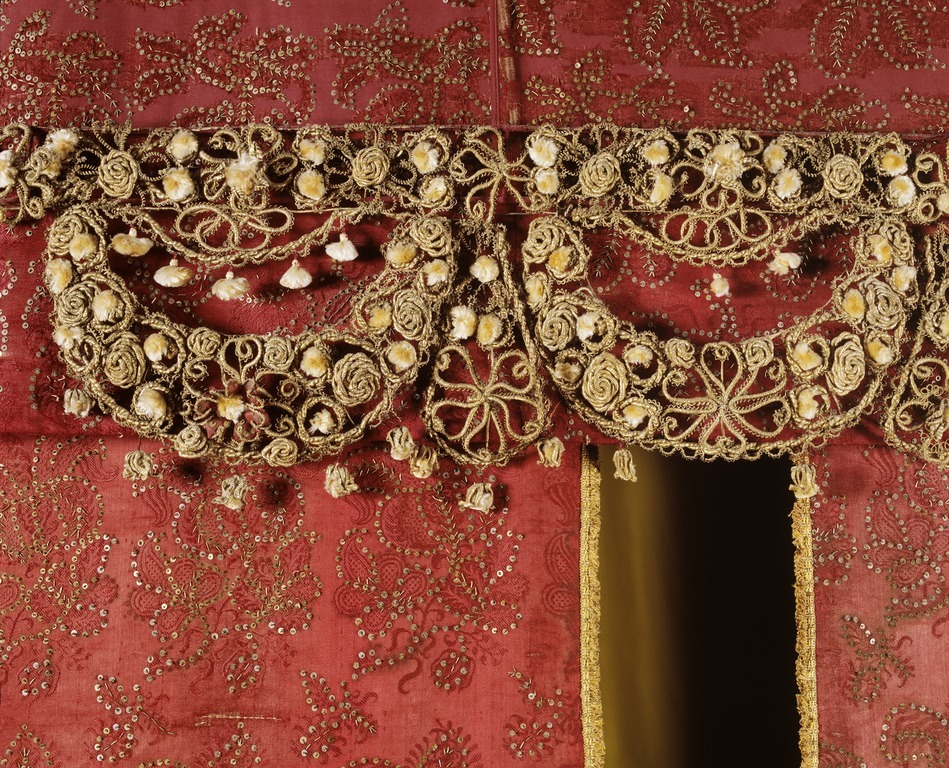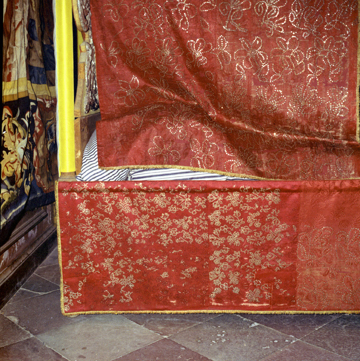 Himmelssäng med klädsel av rött blommönstrat sidentyg.