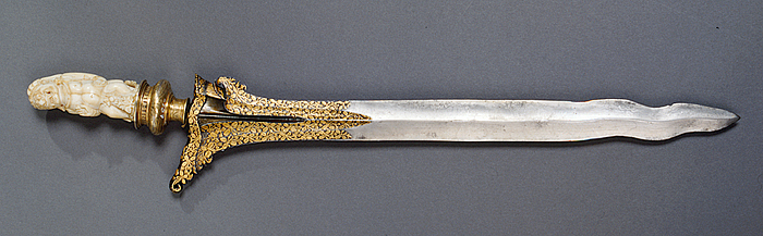 Fäste av skulpterat elfenben och klinga av stål. Fästet (hulu keris) skulpterat i form av en naken demon med stirrande runda ögon och blottade huggtänder, håret bakåtstruket i tunga slingor med flickig avslutning. Mellan demonskulpturen och klingbasen ett postamentliknande mellanled av förgyllt silver, över en smal cylindrisk hals en utskjutande vulst, häröver en låg krage. Mellanledet med graverad ytdekor av rankor, kragen med bårddekor. Klingbasen (ganja). Klingan tvåeggad, rak med vågig (flammig) spetsformigt utsvängd med nedåt omböjd ytterände, vars nedersida snidats i små böjda flikar. Basens motsatta sida snidad med en större uppåtriktad flik, och tre smärre dylika. Basens kant skodd med ett tvärgående, vågigt kantbeslag av stål, format som avslutning av klingbasen. Klingbasens sidor och kantbeslag med ett tätt yttäckande bladmönster i inslaget guld. 1710 års inventarium p. 71, rum III "1 D:o (dart) med Elfenbeen Hantag utskuren som 1 afgudh och silfwerkanp näst klingan, klingan inlagt med gull och Högt Arbete och flamerat på ändan baljan med Swart sammet öfwerdragen med förgyllt bleck och dobsko utstucken, 1 knif och 1 prim Hooss". Anm: Fästets förgyllda beslag av europeiskt ursprung.