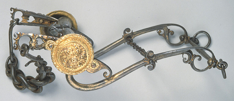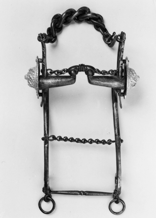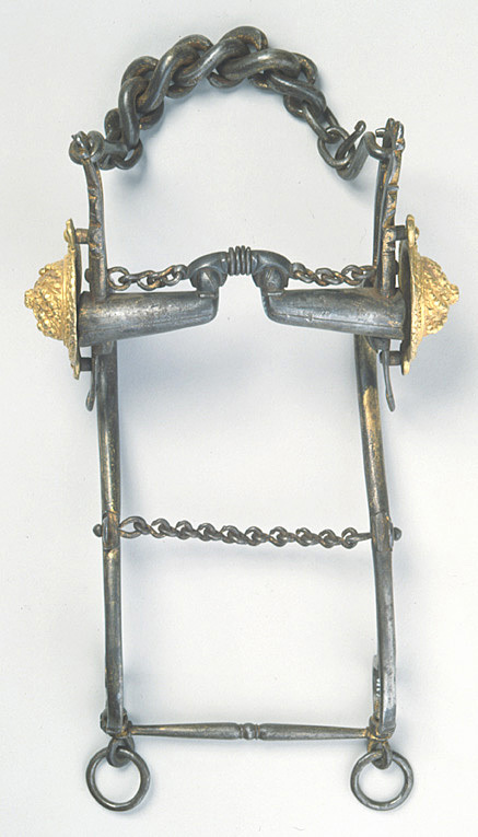 Stångbett av förgyllt stål, stängerna med volut formade utskott samt genombrutet huvud. Helt bett av stål med två korta länkar fästade i stängerna. Välvda reliefornerade bucklor av förgyllda mässing. Kraftig kindkedja, tumnskumkedja, stängerna nedtill sammanhållna av en smal, tvärgående, på mitten profilerad stång, lekare med tygelring