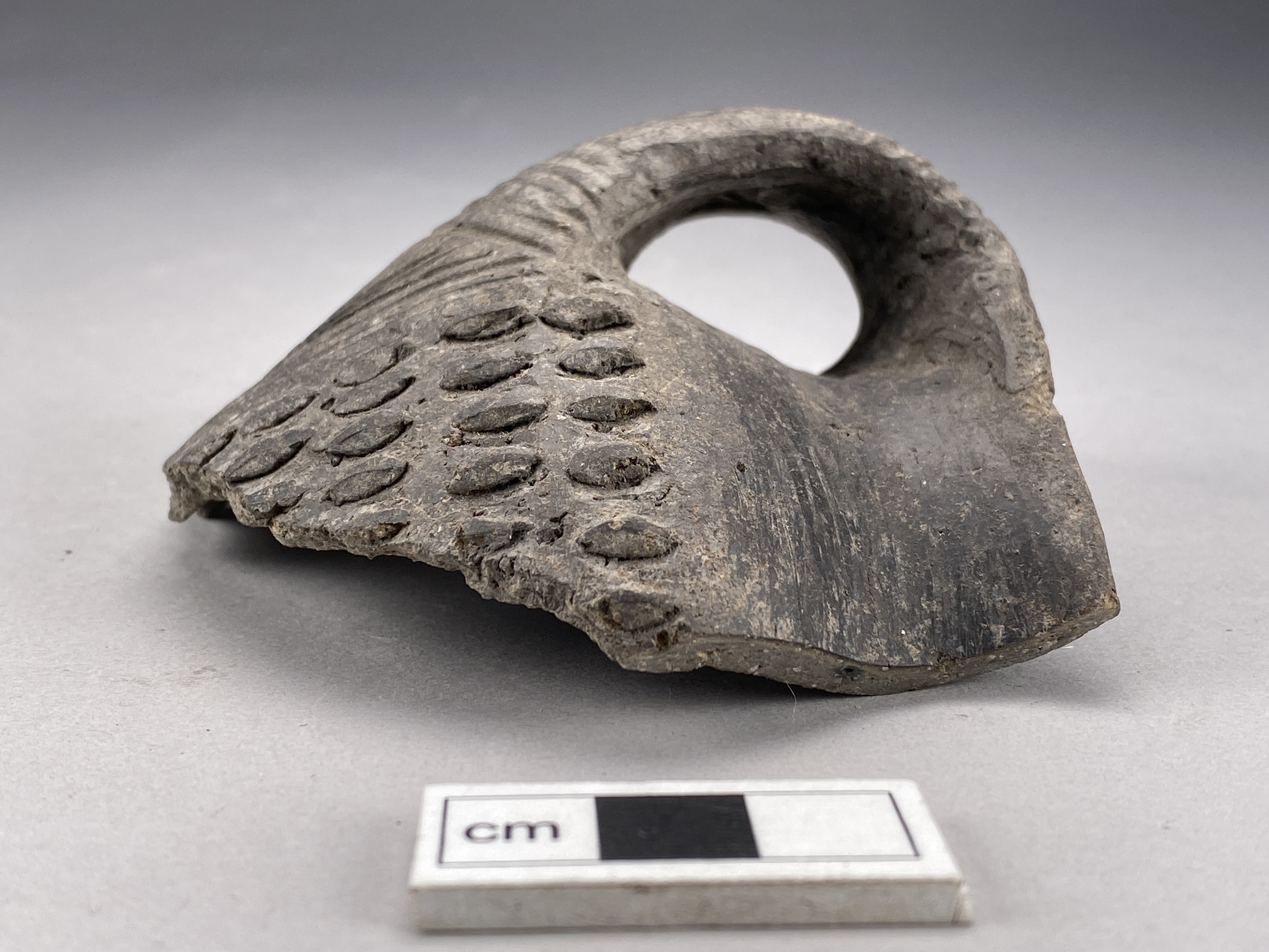 del av sidan till ett hänkelkärl med dekor av ränder på hänkeln och nagelintryck på skuldra och buk