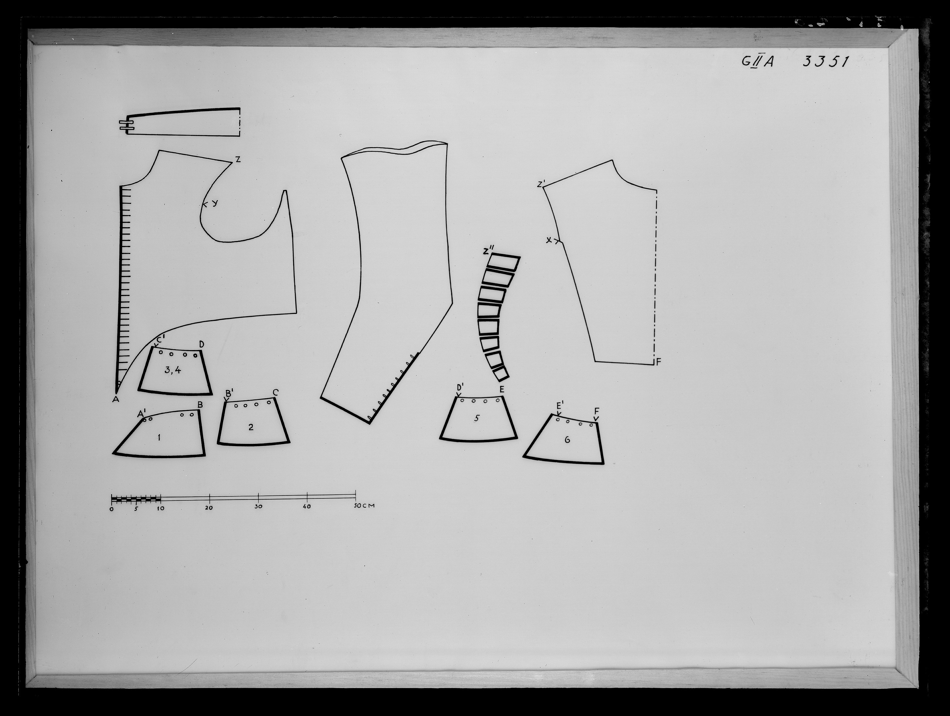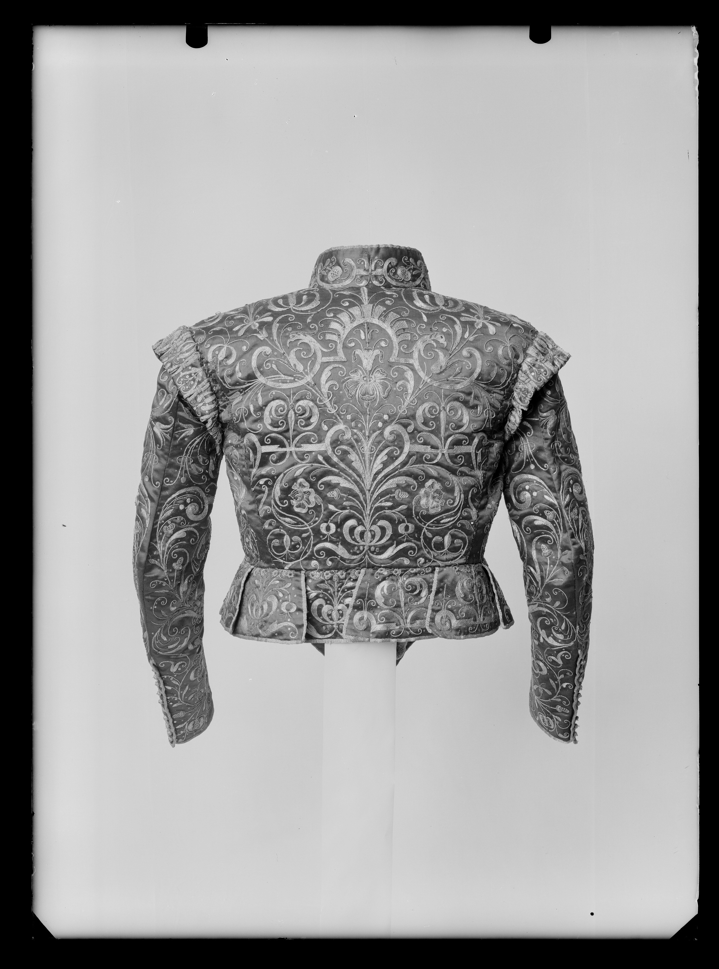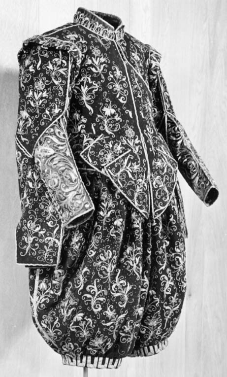 Tröjan skuren med liten snibb mitt fram och 12 trapetsformiga skört i midjan. Skörten är c 92-96 mm höga och har tränsade hål i överkant. Tröjan knäpps med små snörmakeriknappar av guldtråd hela vägen fram. Ståndkragen har två knappar på höger sida och två tränsar på vänster sida. I ärmsprunden finns tio knapphål och 10 små guldknappar. Tröjan är täckt av sirliga broderier av guldtråd och kantiljer. Mönstret har betydligt större rapport än det på kasacken och byxorna. Det består av slingrande blommor och blad med inslag av beslagsornamentik. Alla sömmar och kanter pryds av en 6 mm smal guldgalon. Foder av blå taft och vit linnelärft. Denna dräkt ingick sannolikt i en beställning som Gustav II Adolf gjorde 1620 hos hovleverantören juvelerare Sebastian Lellij m. fl. i Hamburg, inför sitt bröllop med Maria Eleonora. Dräkten levererades i delar och färdigställdes av kungens hovskräddare Baltzar Dinet.