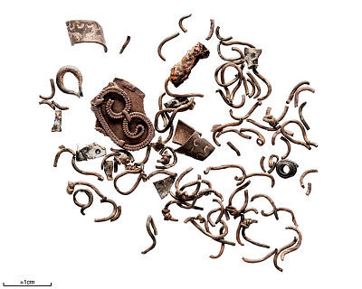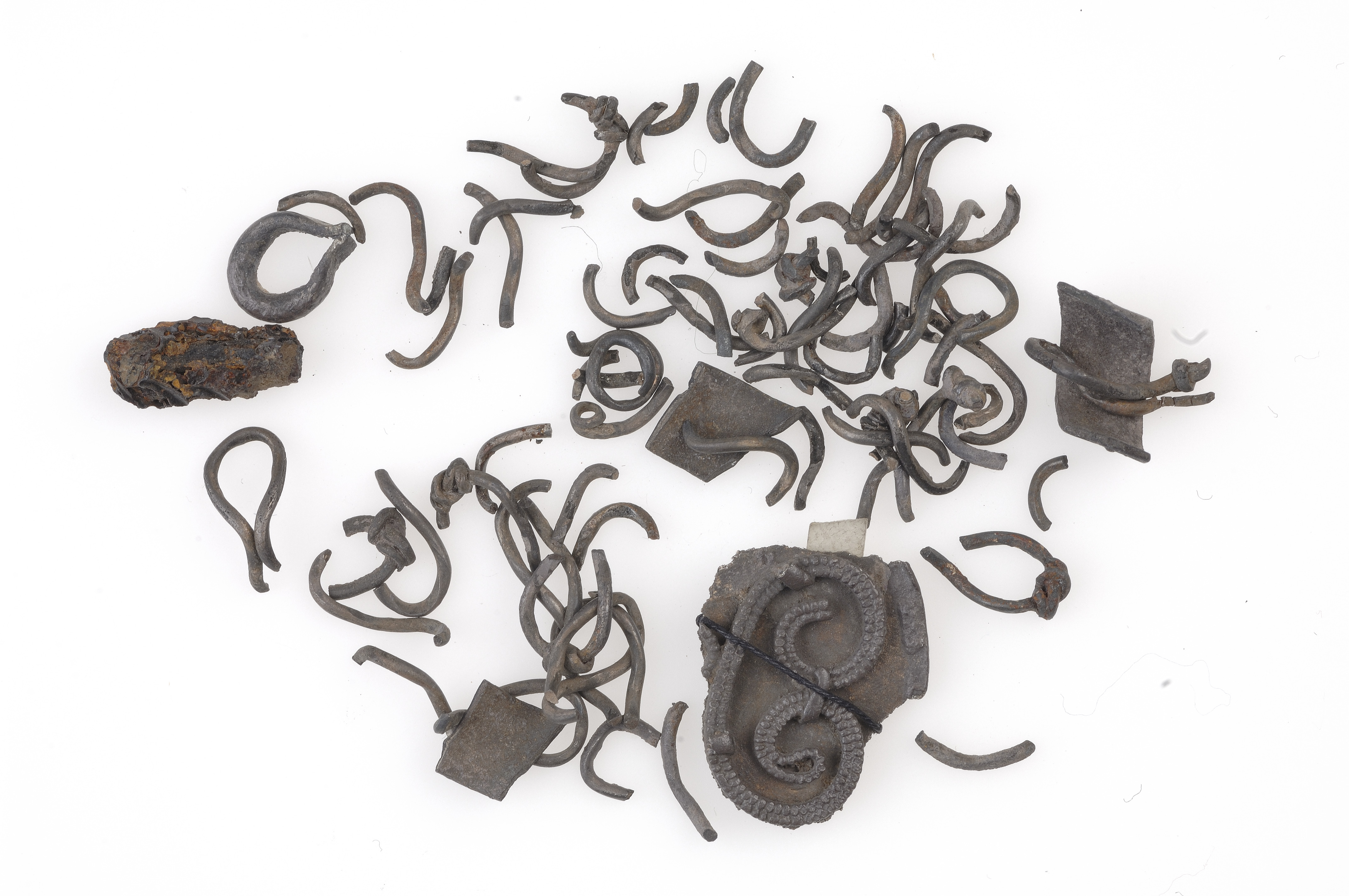 Stort antal små fragment av filigrantråd samt en liten bit bottenplatta. Med största sannolikhet härrörande från ett hänge liknande de övriga.