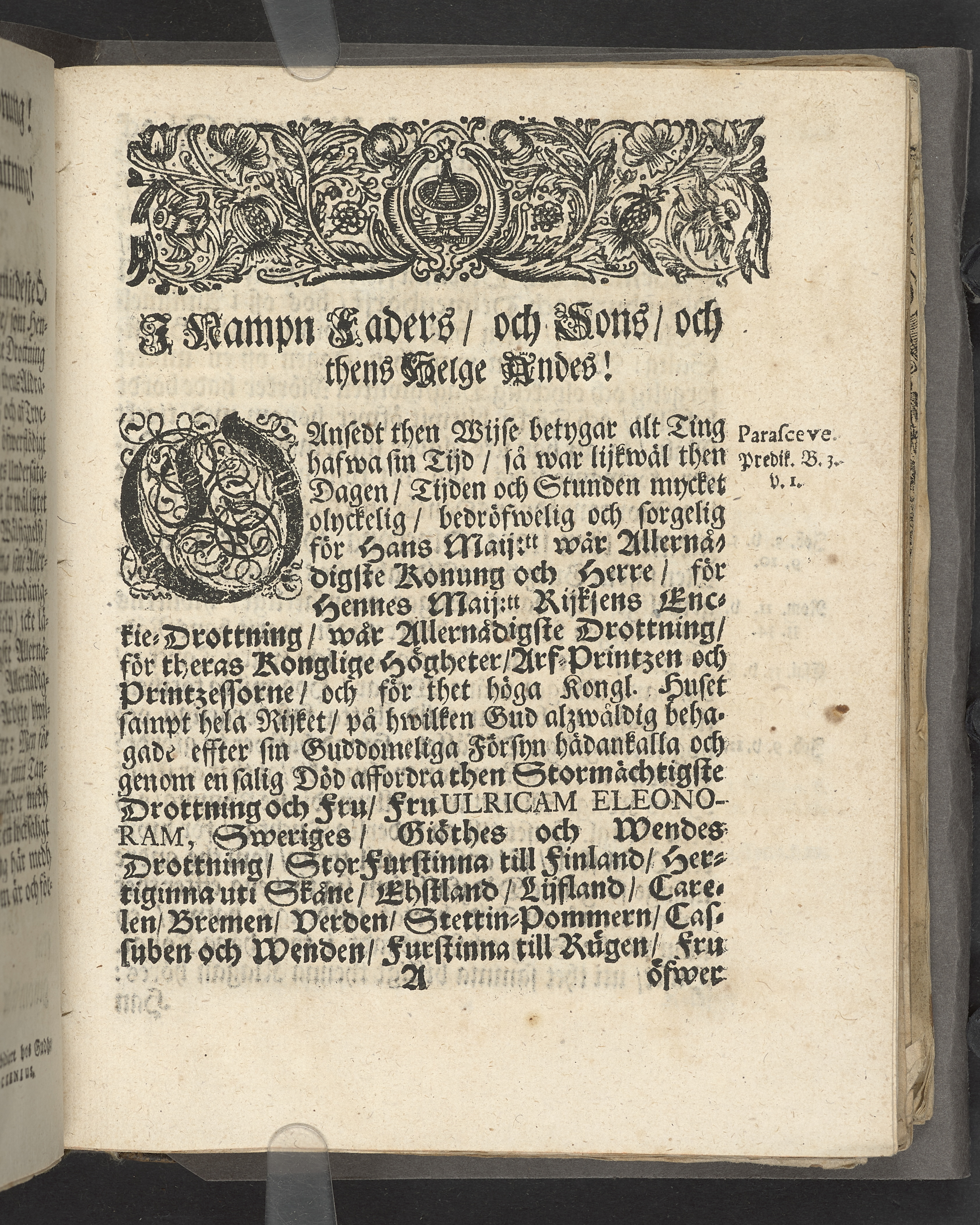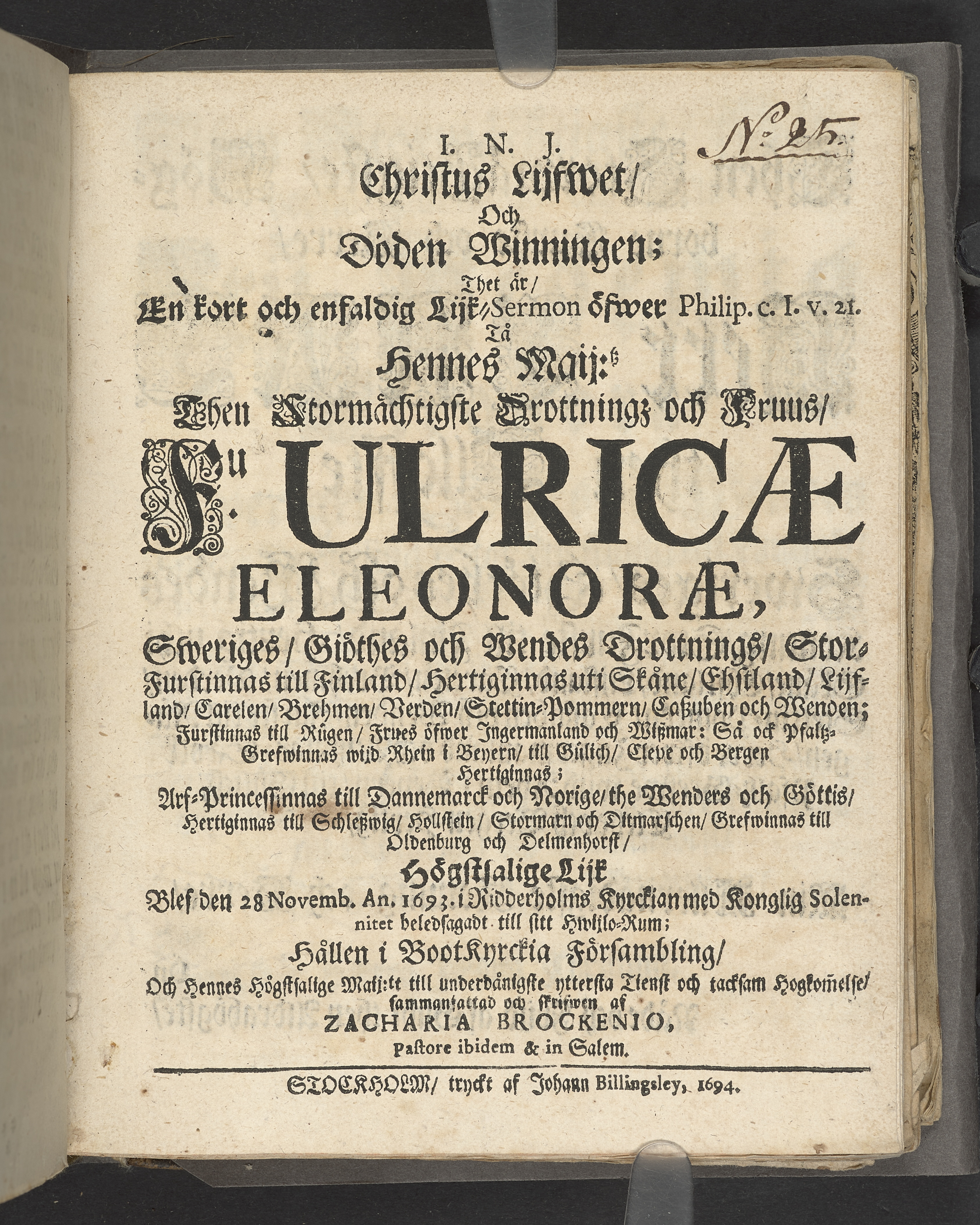 I. N. J. Christus lijfwet, och döden winningen; thet är, en kort och enfaldig lijk-sermon ... tå ... F.u Ulricæ Eleonoræ, Sweriges, Giöthes och Wendes drottnings ... lijk blef den 28 novemb. an. 1693. i Ridderholms kyrckian med konglig solennitet beledsagadt till sitt hwijlo-rum; hållen i Bootkyrckia försambling ... Skrifwen af Zacharia Brockenio ... Stockholm, tryckt af Johann Billingsley, 1694.