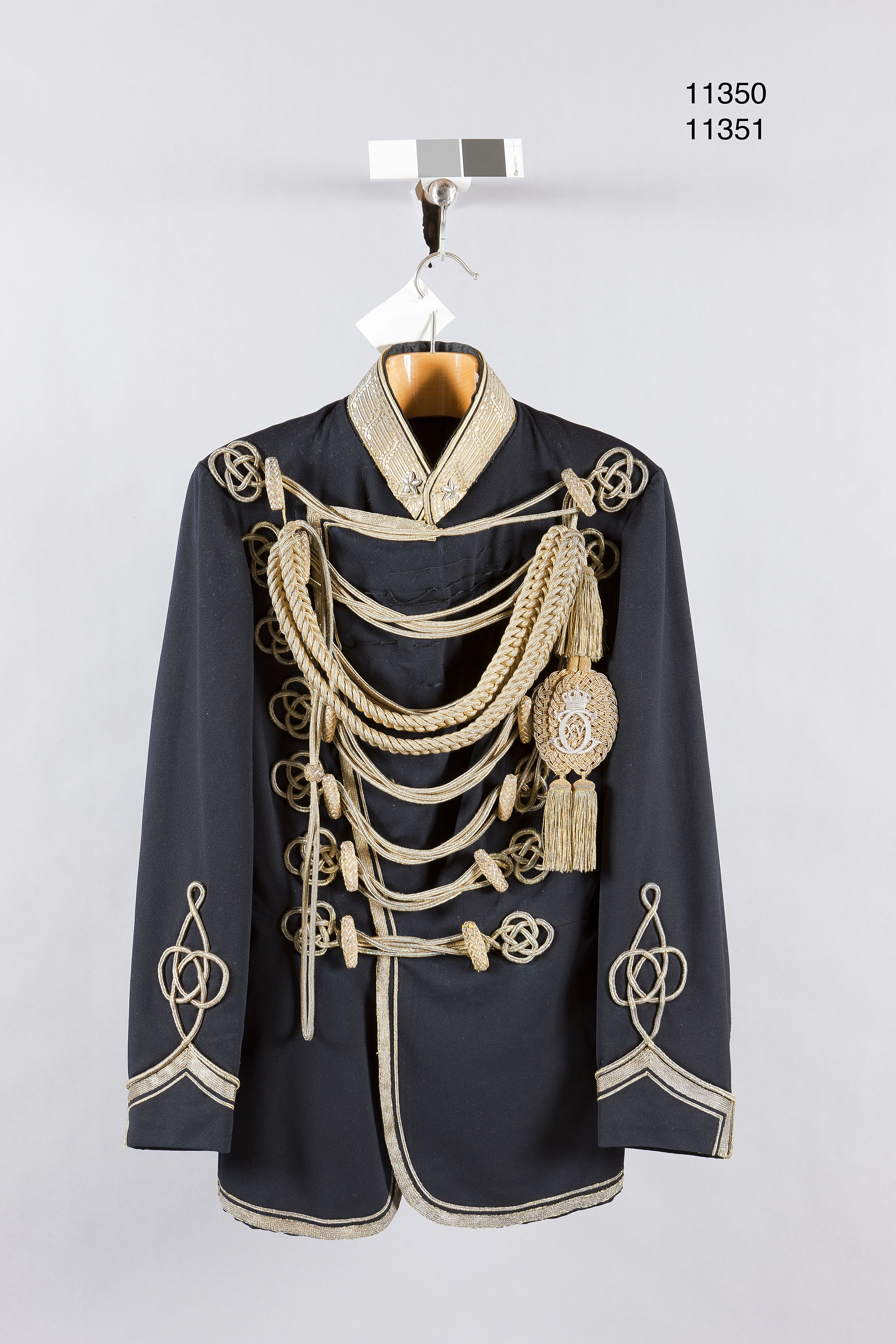 Attila av mörkblått kläde med ståndkrage med guldgalon och en broderad silverstjärna. På vardera framstycket sju stycken öglor med spolformiga knappar för knäppning. På höger sida fem hyskor och på vänster sida fem hakar samt sju långa smala tränsar och fyra mindre samt en liten ficka. Rocken kantad med ett brett och ett smalt beläggningssnöre av guldtråd.