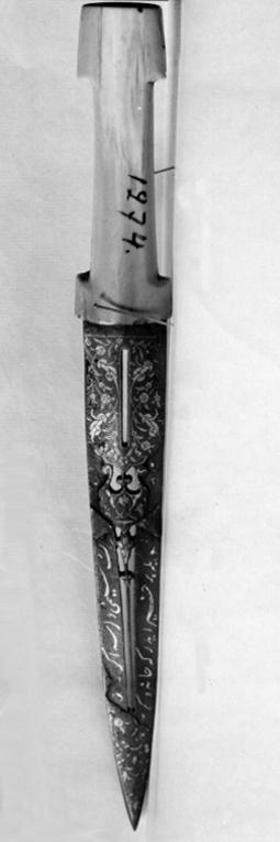 Fäste av vitt ben, spetsovalt tvärsnitt med smalare kantig kavel. Klinga av svärtat stål, 31 mm bred vid fästet, rak, tvåeggad, hopsmidd av flera delar och genombruten i mitten, ornerad med rankor och turkisk eller persisk? Inskrift av påslaget guld. Inköpt för 252:-. Ingenjör Carl Robert Lamms samling nr 1274. Såld till Lamm av Fredrik Robert Martin 1900-08-11.