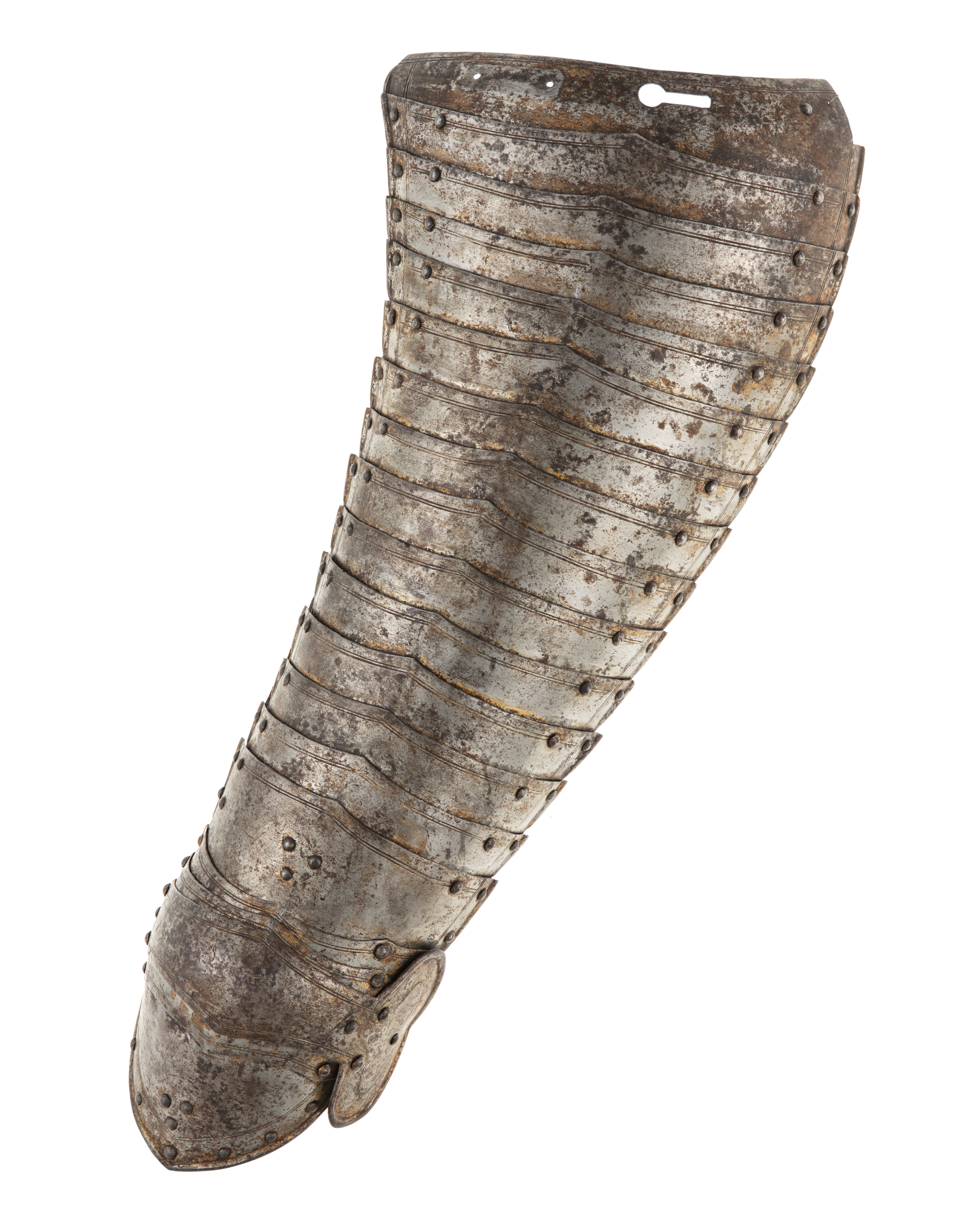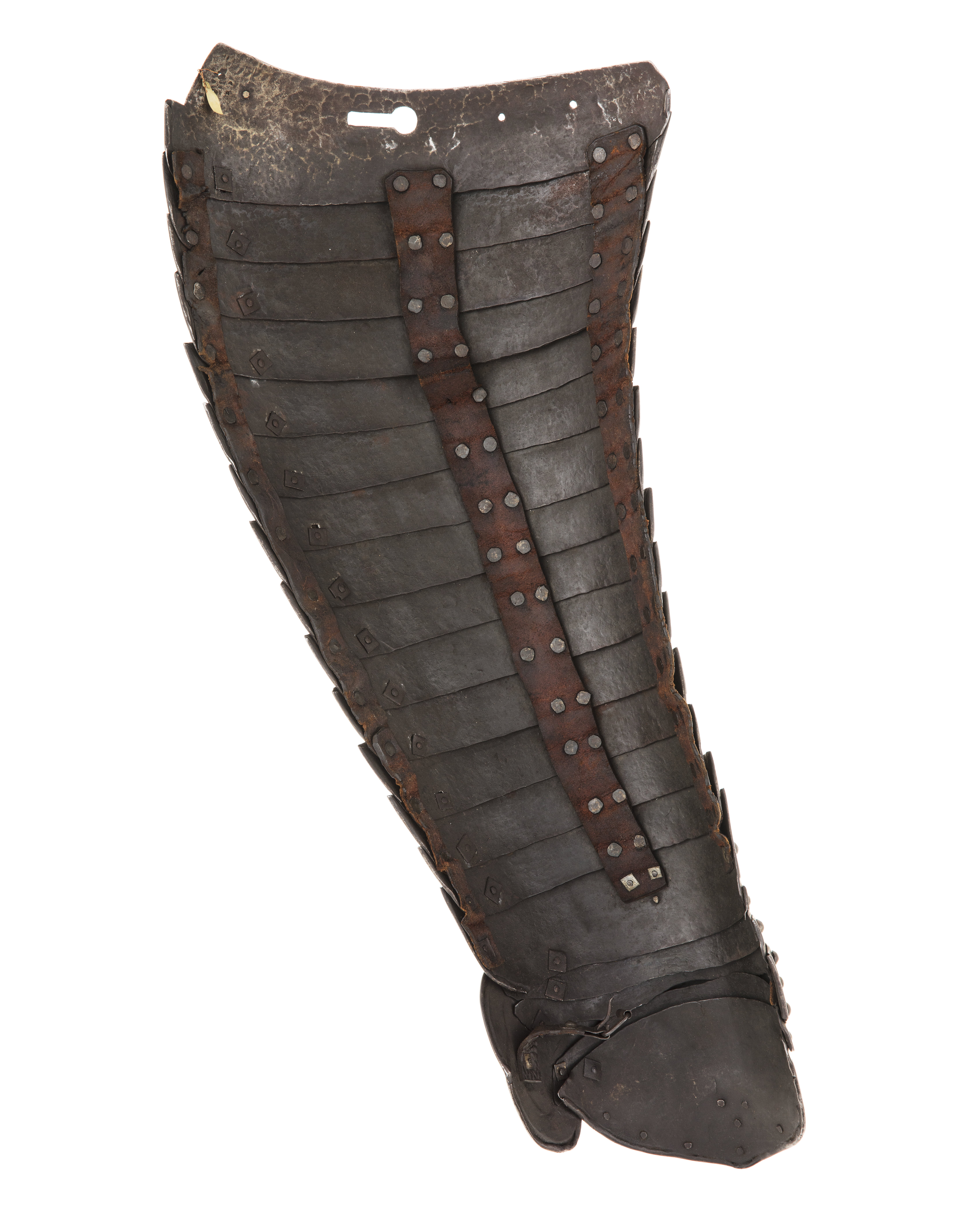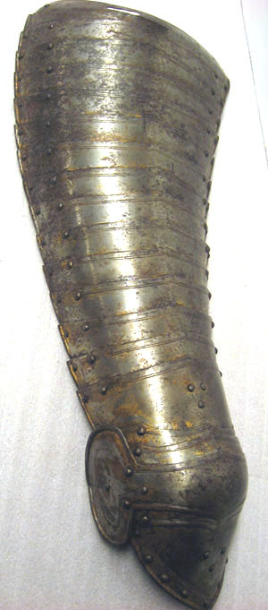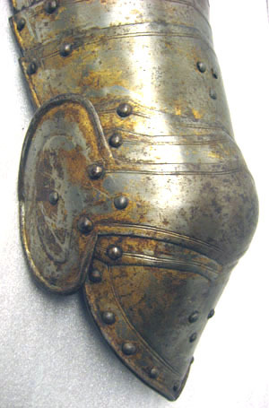Driven stålplåt med rester av förgyllning. Sammanlagt 20 delar. Lårstycke av 14 välvda skenor nedåt avsmalnande i bredd. Sammanfogade omlott med nitar fästade på insidan i kanterna och i mitten med läderband, b 53-23 mm. Ytterkanterna omvikta och rundsmidda och övre kanten i mitten utdragen till svag spets. I sidorna och övre kant ristad dubbellinje. Översta skenan med i yttre kanten vertikal urtagning, i mitten nyclelhålsformat hakhål, l 43 mm. Knäbuckla, väld med övre och undre kant utdragen till svag spets. Mot utsidan utdragen till oval mussla, h123, b 73 mm, mot insidan tvärt avslutad. På musslans insida ett svart läderband med i änden sölja av stål, l 60 mm. Söljan med rektangulär platt ram och utåt rulle. Upptill förlängning av två mindre och en större skena, nertill av en mindre och en större. Demindre skenorna med övre kant utdragen till tre spetsar. Nedersta skenan avsmalnande nedåt till spets. Runt kanterna ristade linjer och nitar.