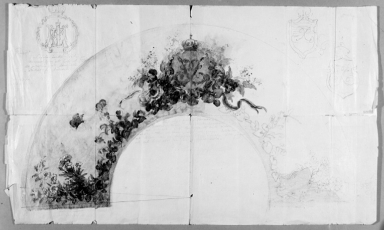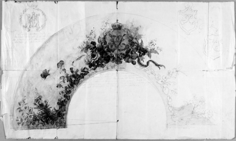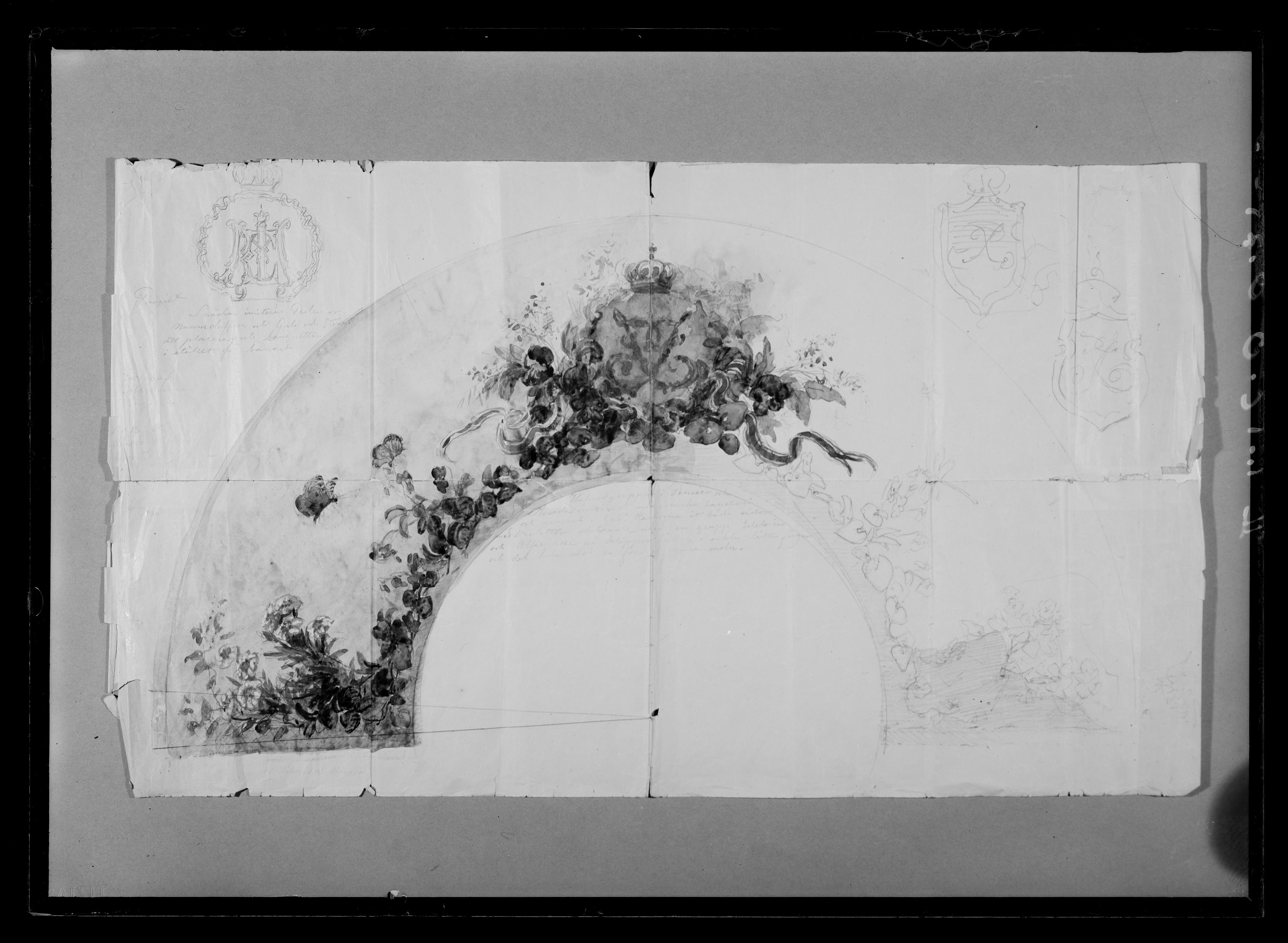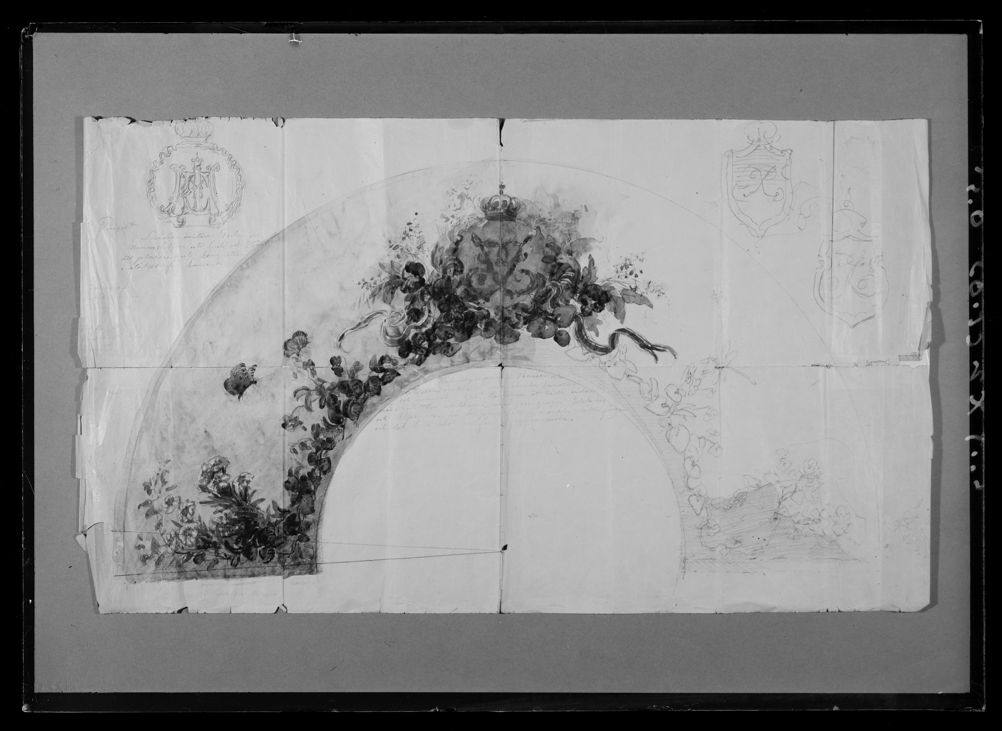 Halvcirkelformig blyertsteckning av blommor, fjärilar och trollslända mot himmelsbakgrund, i mitten krönt namnchiffer, spegelmonogram J med fladdrande svenska och norska band. Vänster halva av teckningen till och med namnchiffret akvarellerad. Nedanför namnchiffret skrivet med blyerts: "Hufvudgruppen i Penséer och // Reseda omvirat med Svenska bandet // och namnet i guld. Rankorna åt båda sidor // med Violetter slutande med en grupp Edelweiss // och Alpenrose på klippor hållna i enkla lätta färger // och det hela mot en fond af ljusa moln." Nertill till v. skrivet: "ej Edelweiss och Alprosor". I övre v. hörnet tecknat ett krönt namnchiffer LME, därnedanför skrivet och överkorsat: "Project. (( Snäckan imiterar Perlemor // Namnchiffern uti Guld och Stenar att placeras uti bouquetten // istället för bandet", därnedanför: "Josephine // Maximiliane // Eugenie" samt otydlig text. I övre h. hörnet skissat två krönta namnchiffer i sköldar, J.