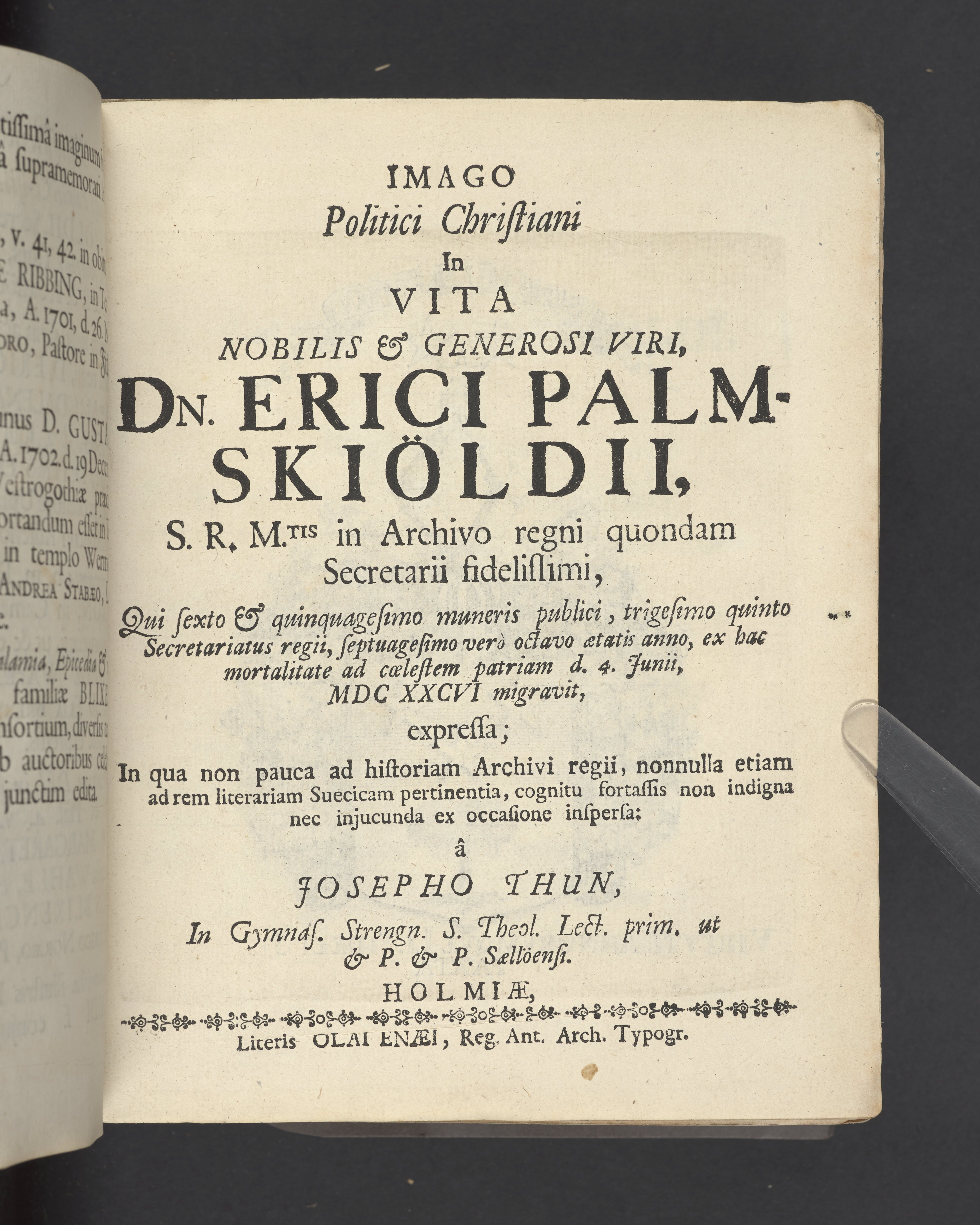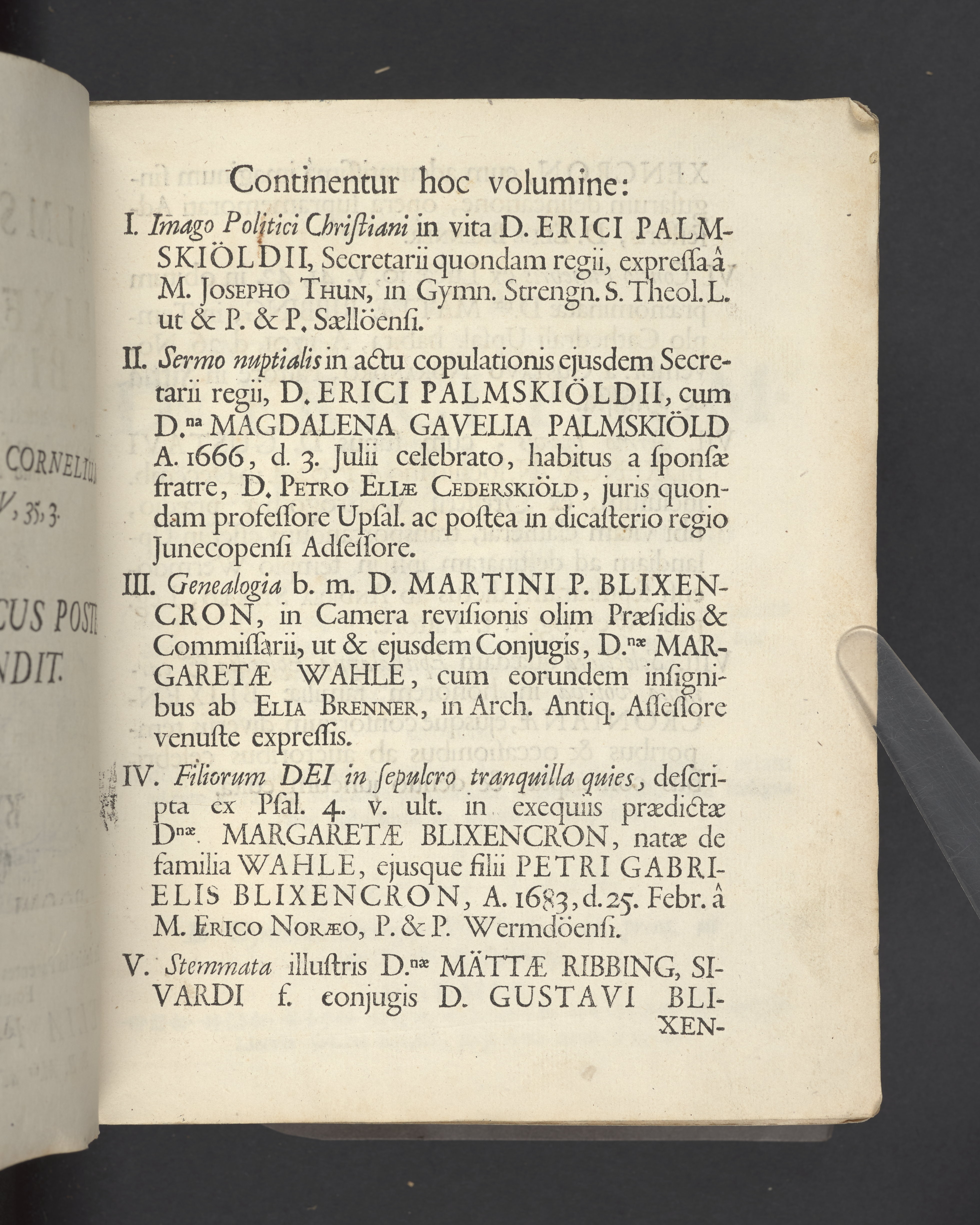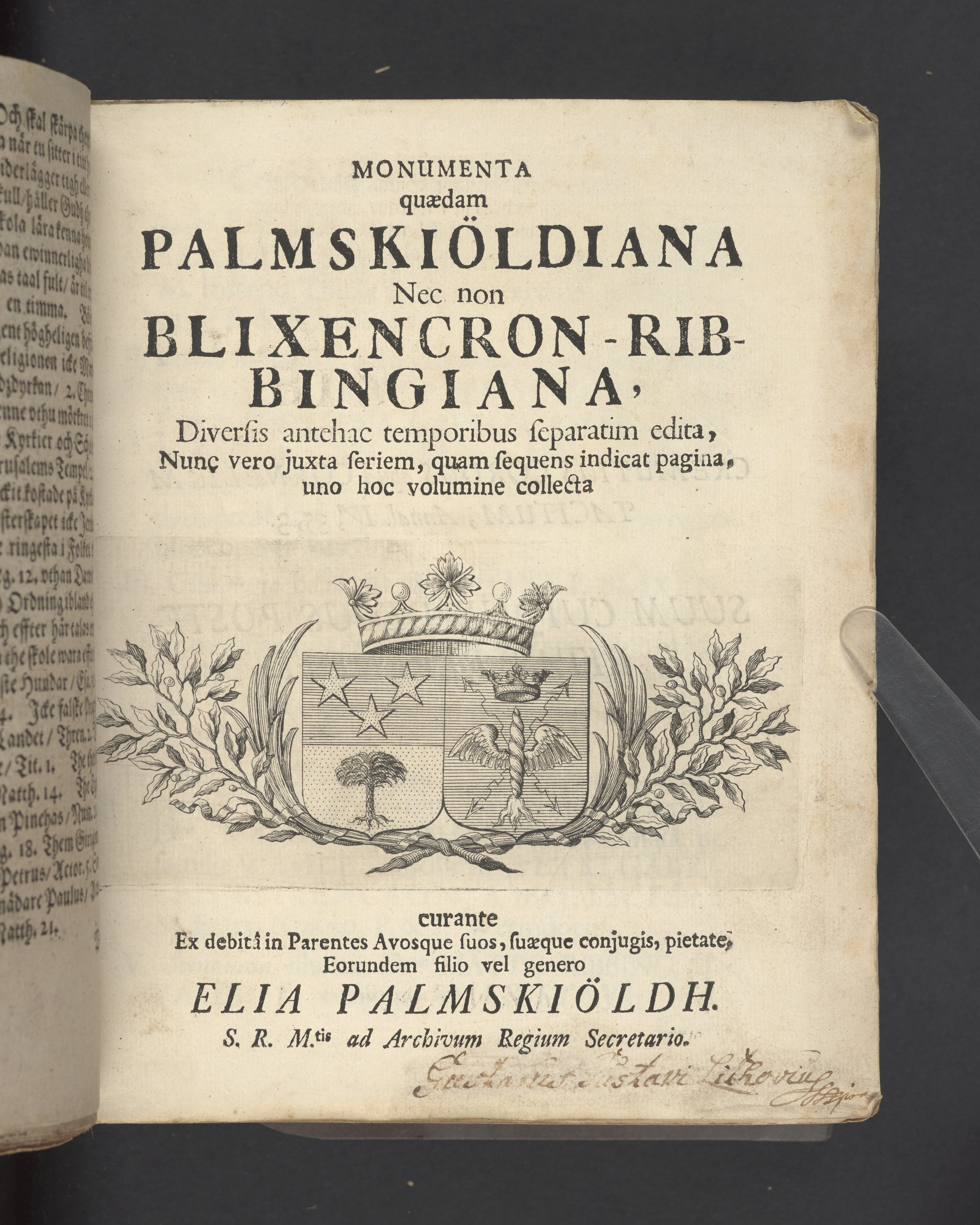 Monumenta quædam Palmskiöldiana nec non Blixencron-Ribbingiana, diversis antehac temporibus separatim edita, nunc vero juxta seriem, quam sequens indicat pagina, uno hoc volumine collecta curante ex debitâ in parentes avosque suos, suæque conjugis, pietate, eorundem filio vel genero Elia Palmskiöldh. S. R. M.tis ad archivum regium secretario.