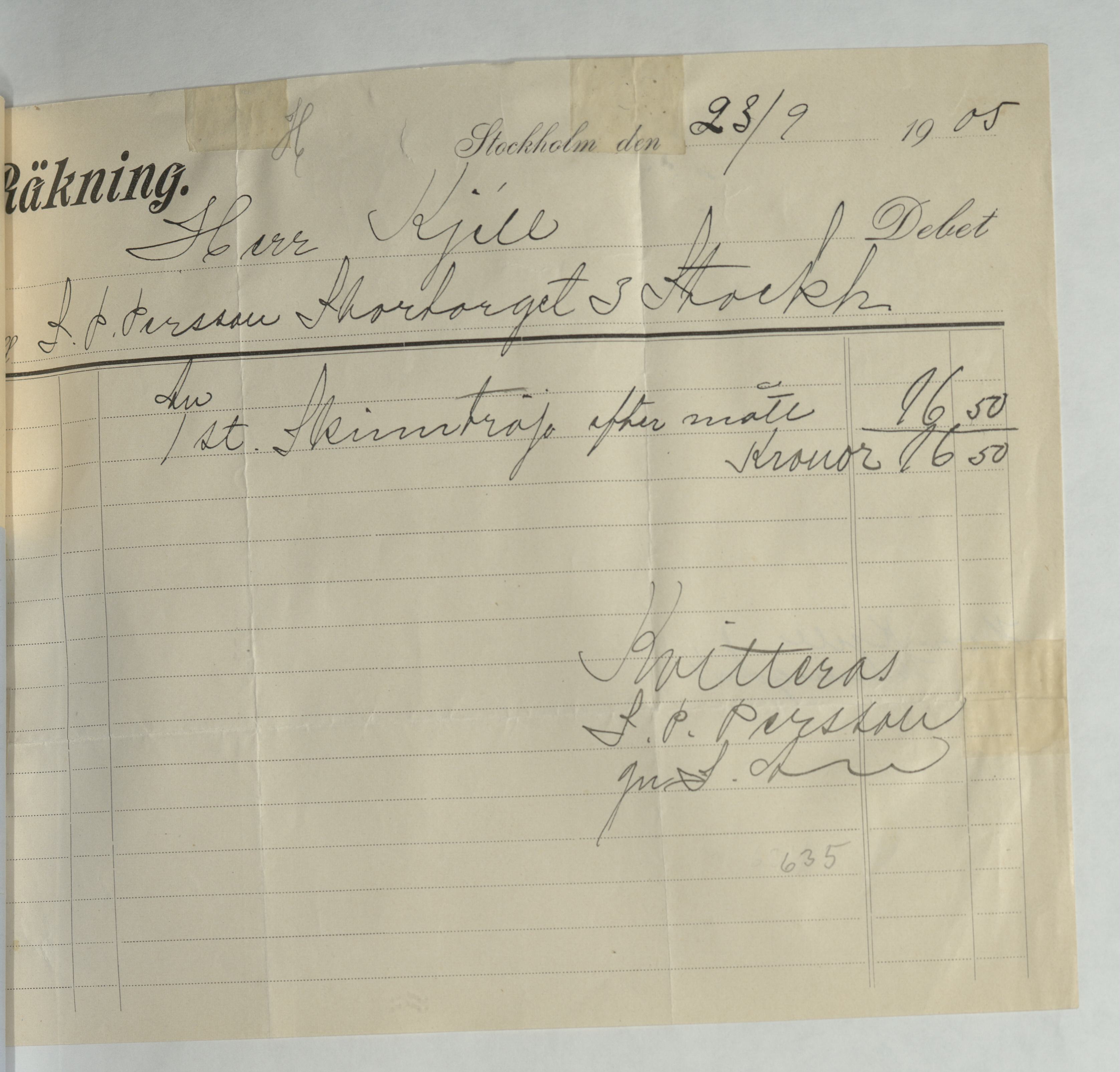Kvitto från S.P Persson, för 1 st Skinntröja sydd efter mått, för 16:50Kr. Betalt 23 september 1905.