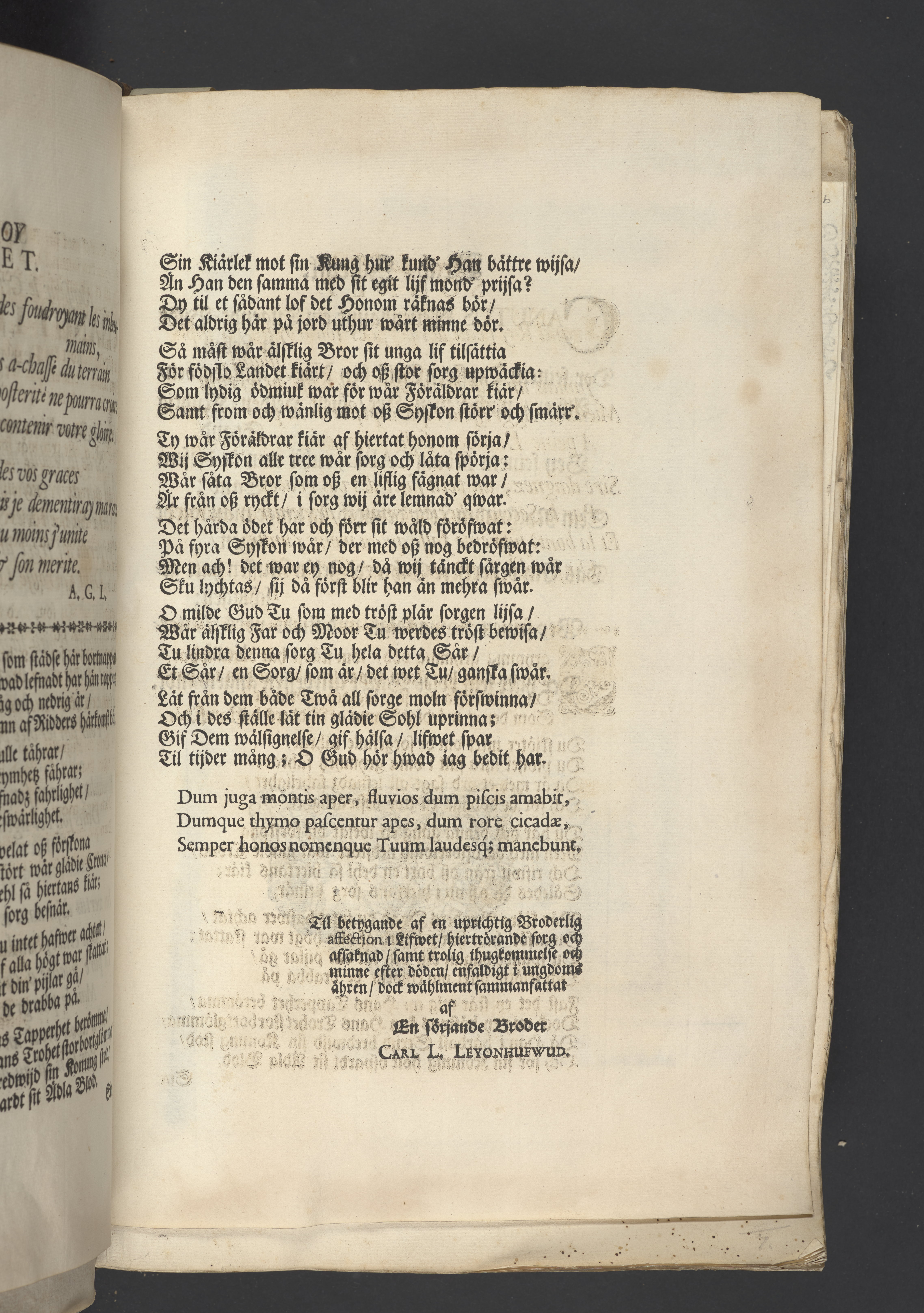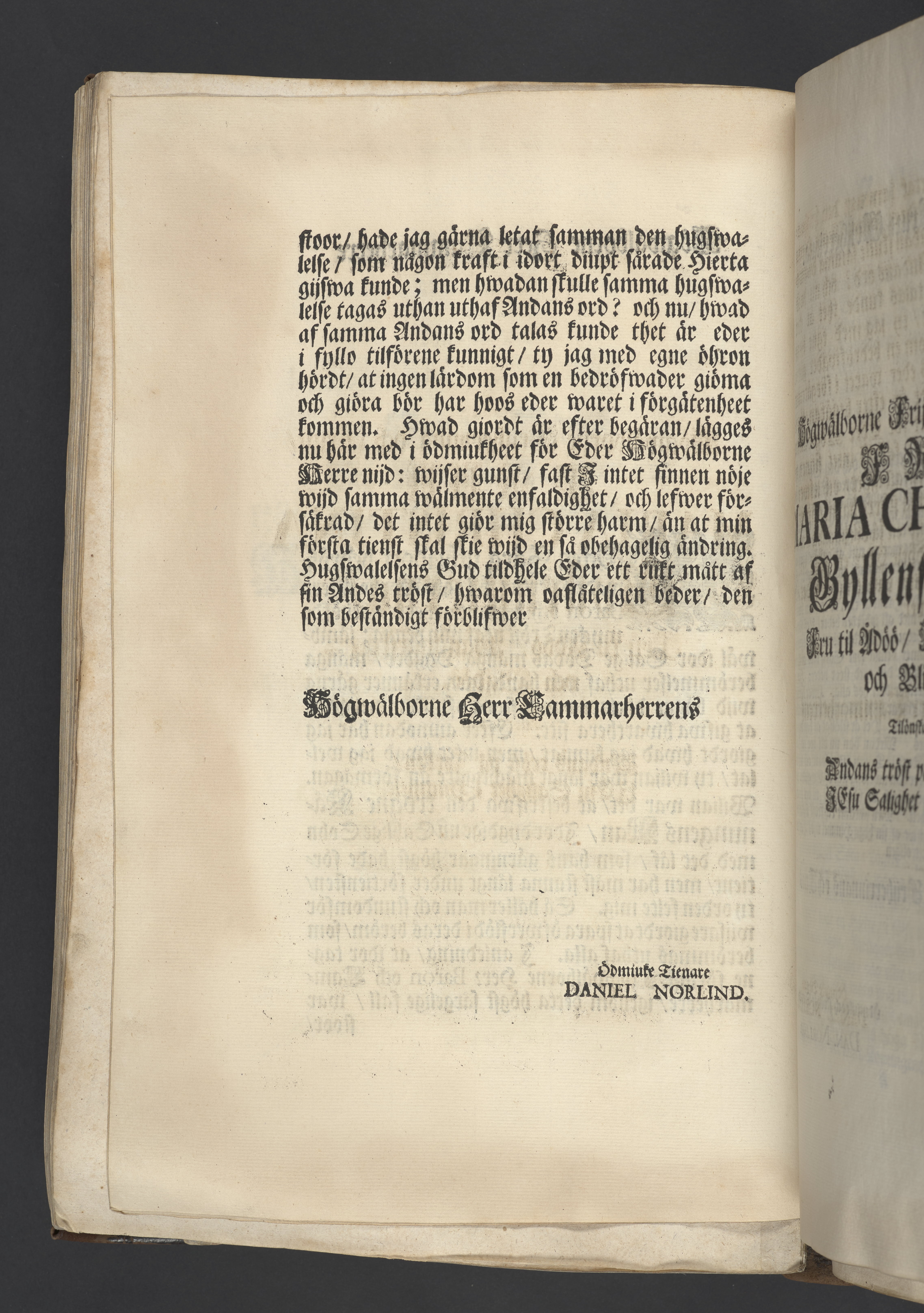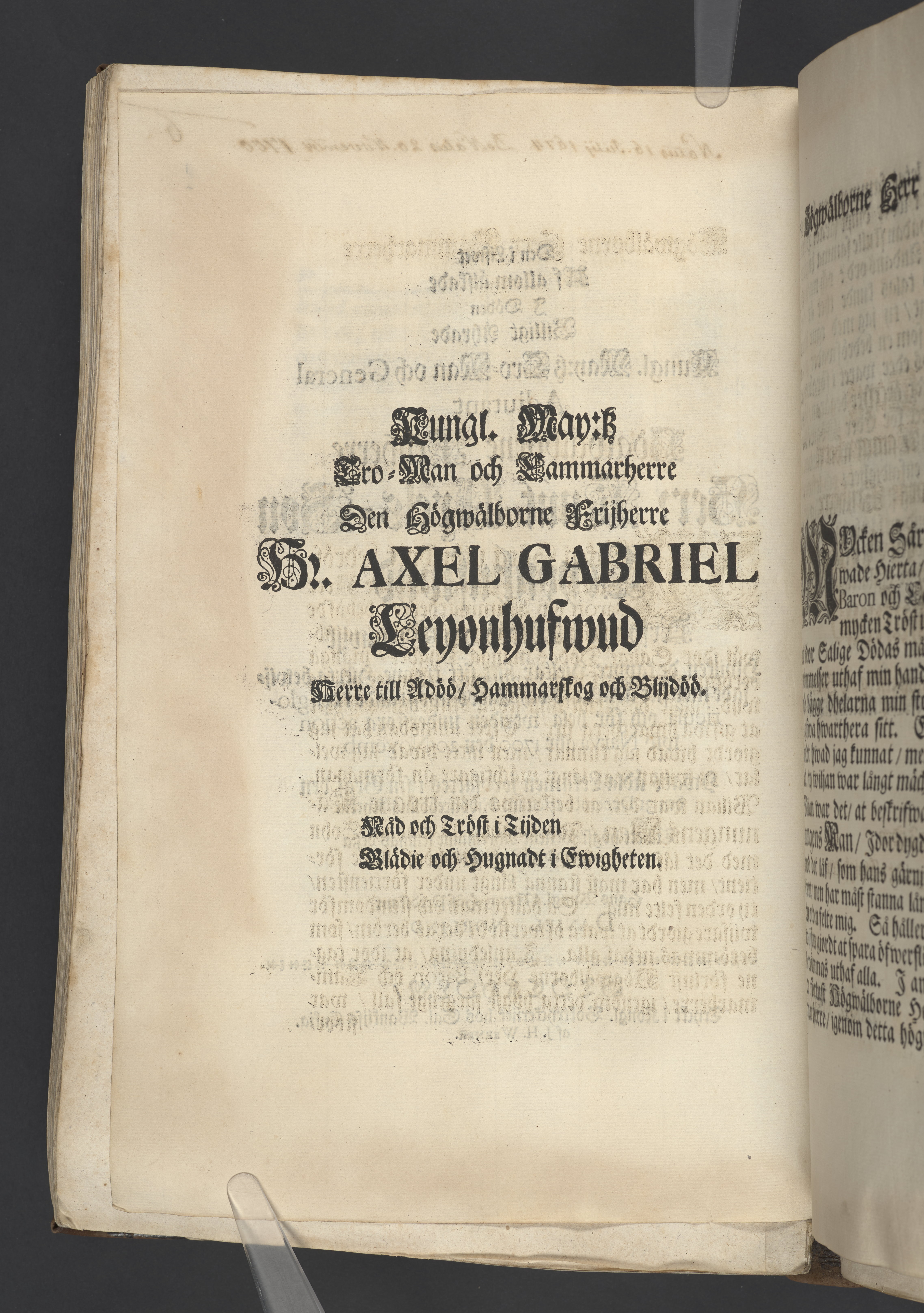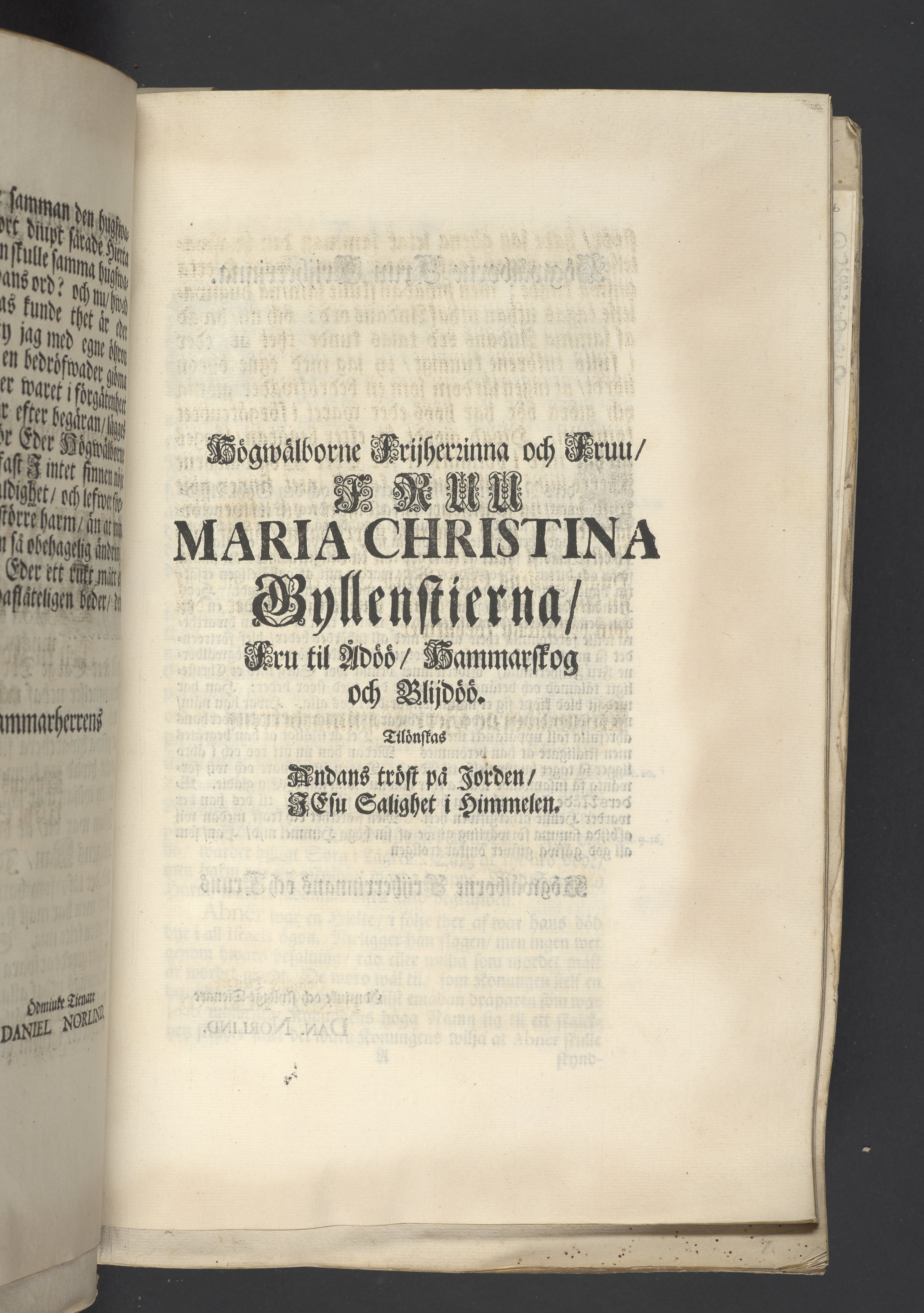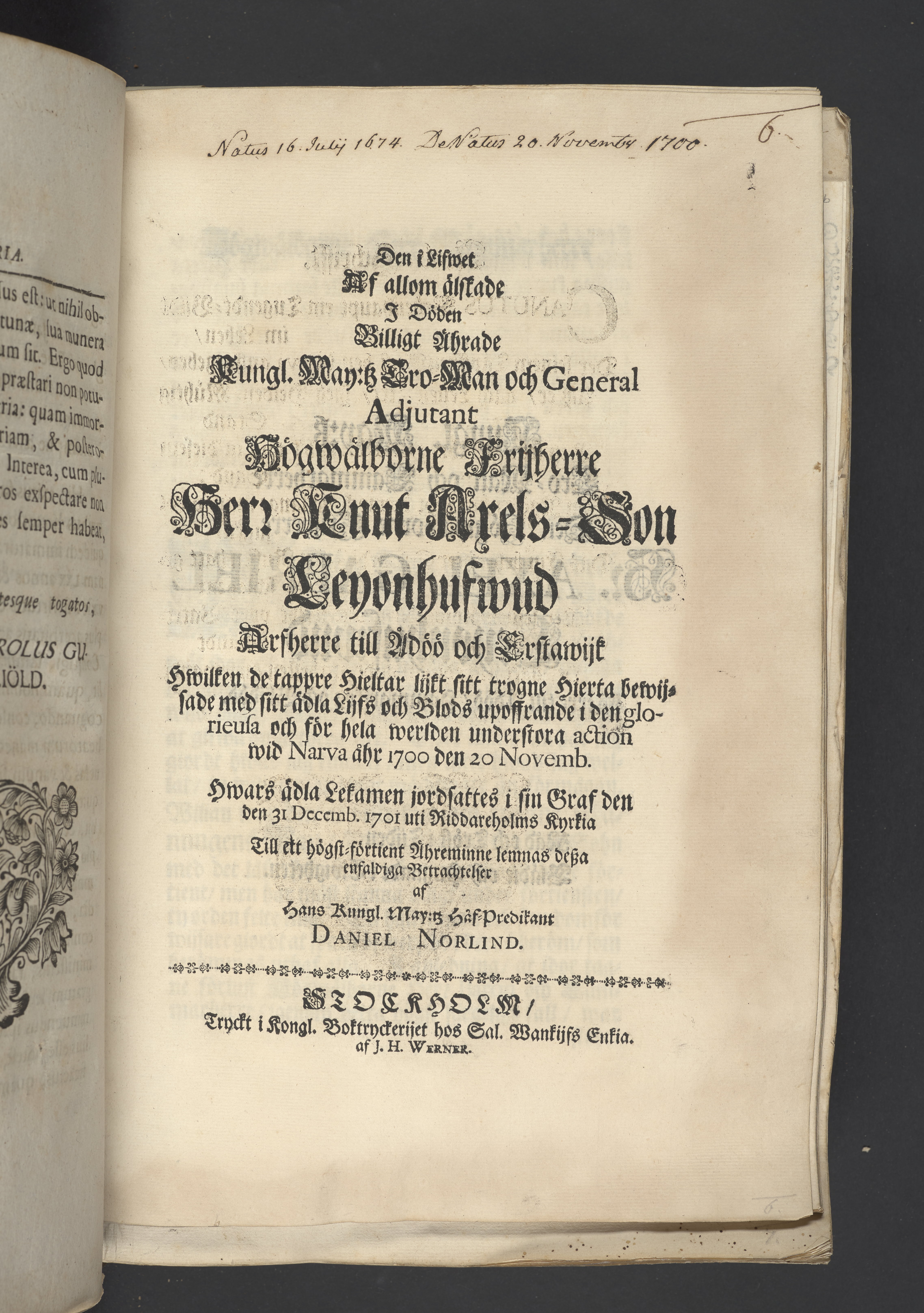 Den i lifwet af allom älskade i döden billigt ährade kungl. may:tz tro-man och general adjutant ... Knut Axels-son Leyonhufwud ... hwilken de tappre hieltar lijkt sitt trogne hierta bewijsade med sitt ädla lijfs och blods upoffrande i den glorieusa och för hela werlden understora action wid Narva åhr 1700 den 20 novemb. Hwars ädla lekamen jordsattes i sin graf den 31 decemb. 1701 uti Riddareholms kyrkia till ett högst-förtient ähreminne lemnas desza enfaldiga betrachtelser af ... Daniel Norlind. Stockholm, tryckt i kongl. boktryckerijet hos sal. Wankijfs enkia. Af J.H. Werner.