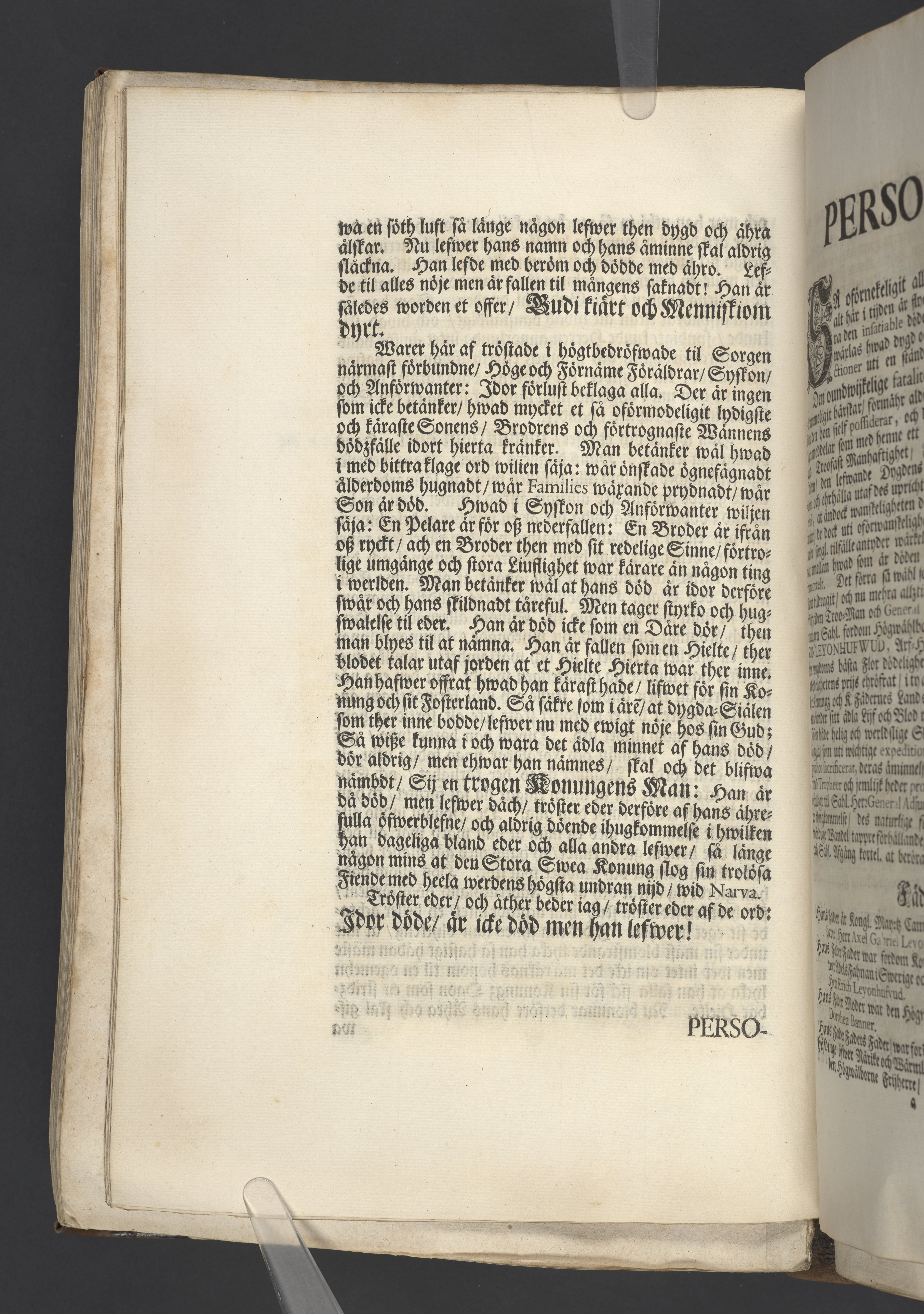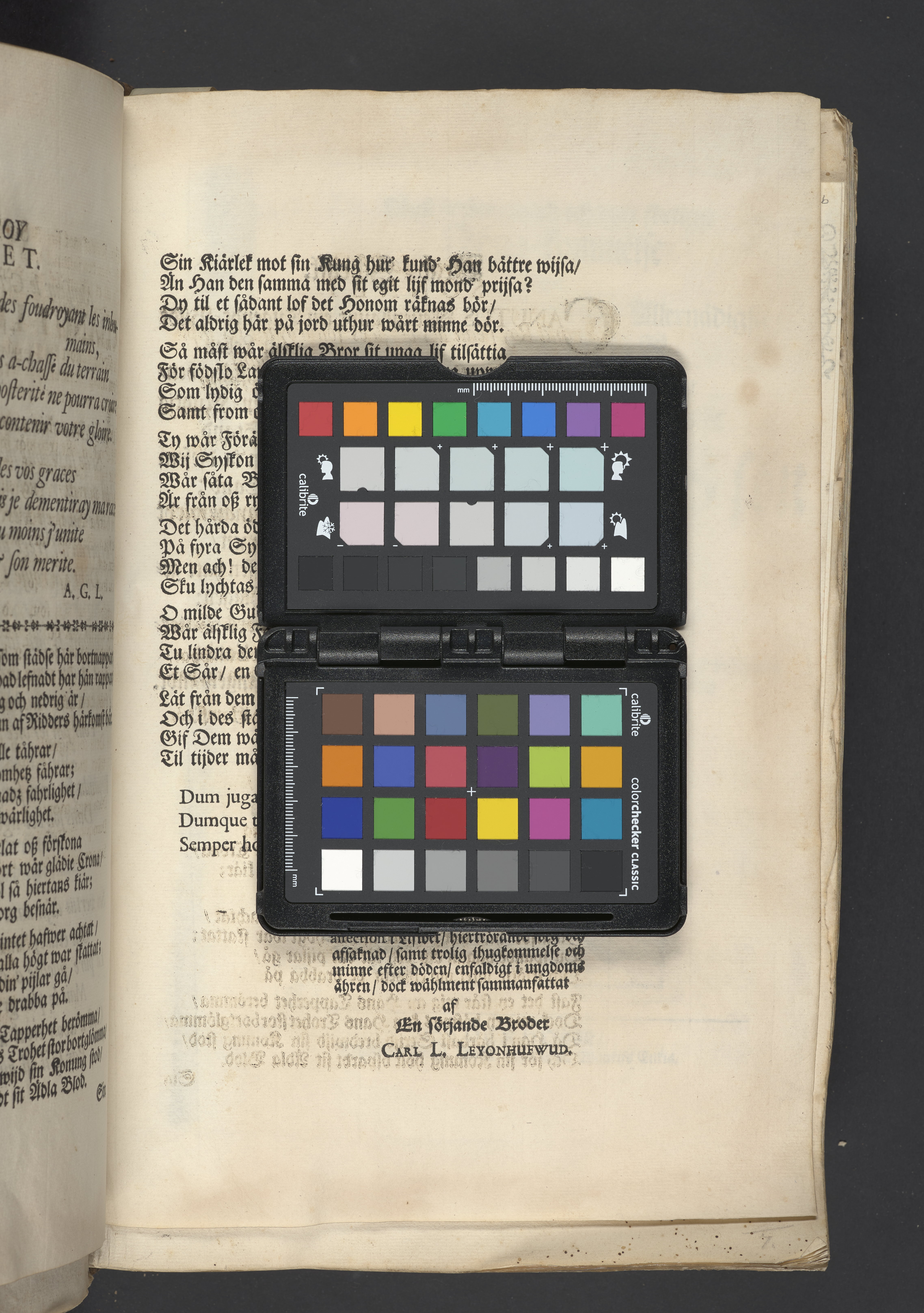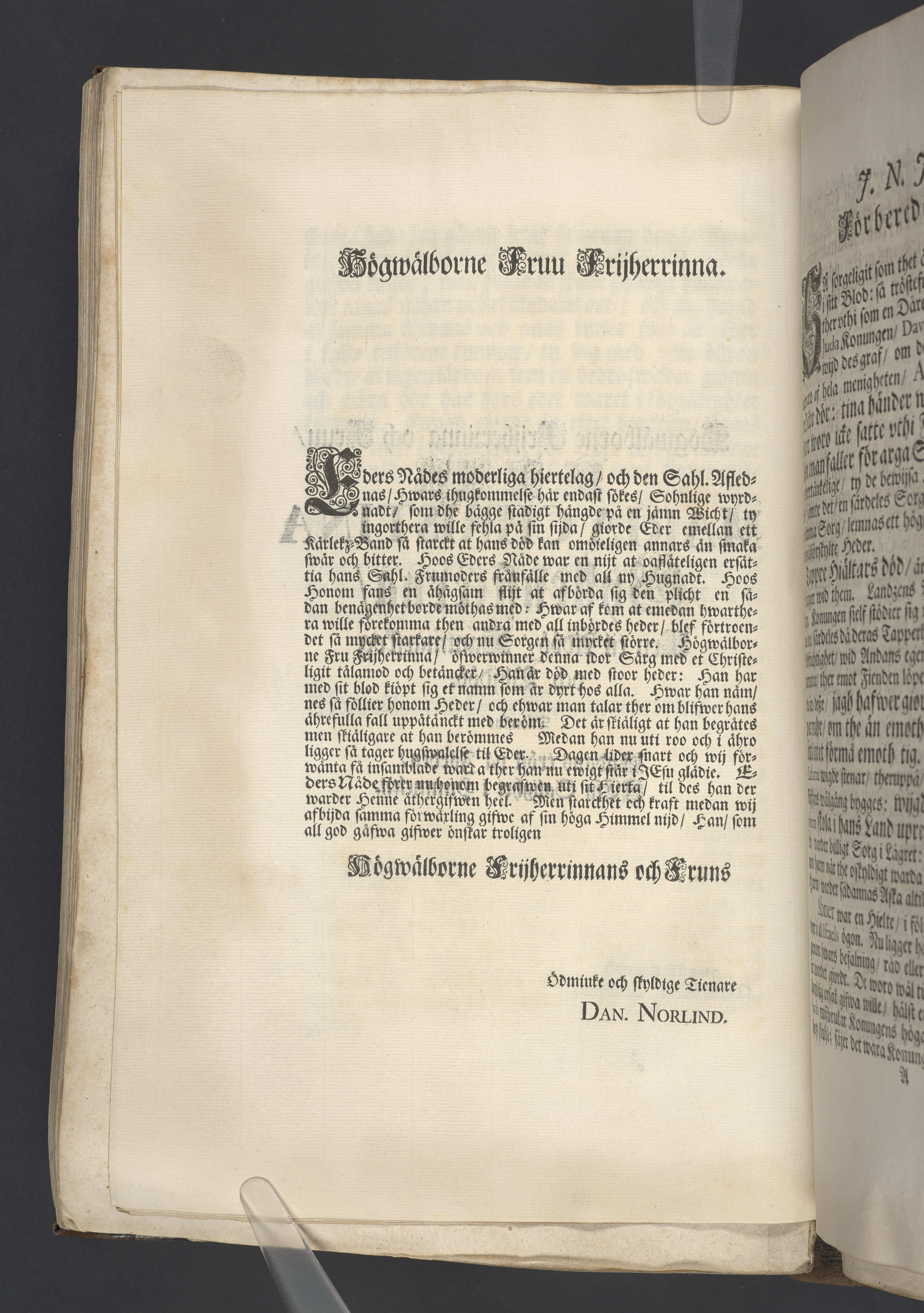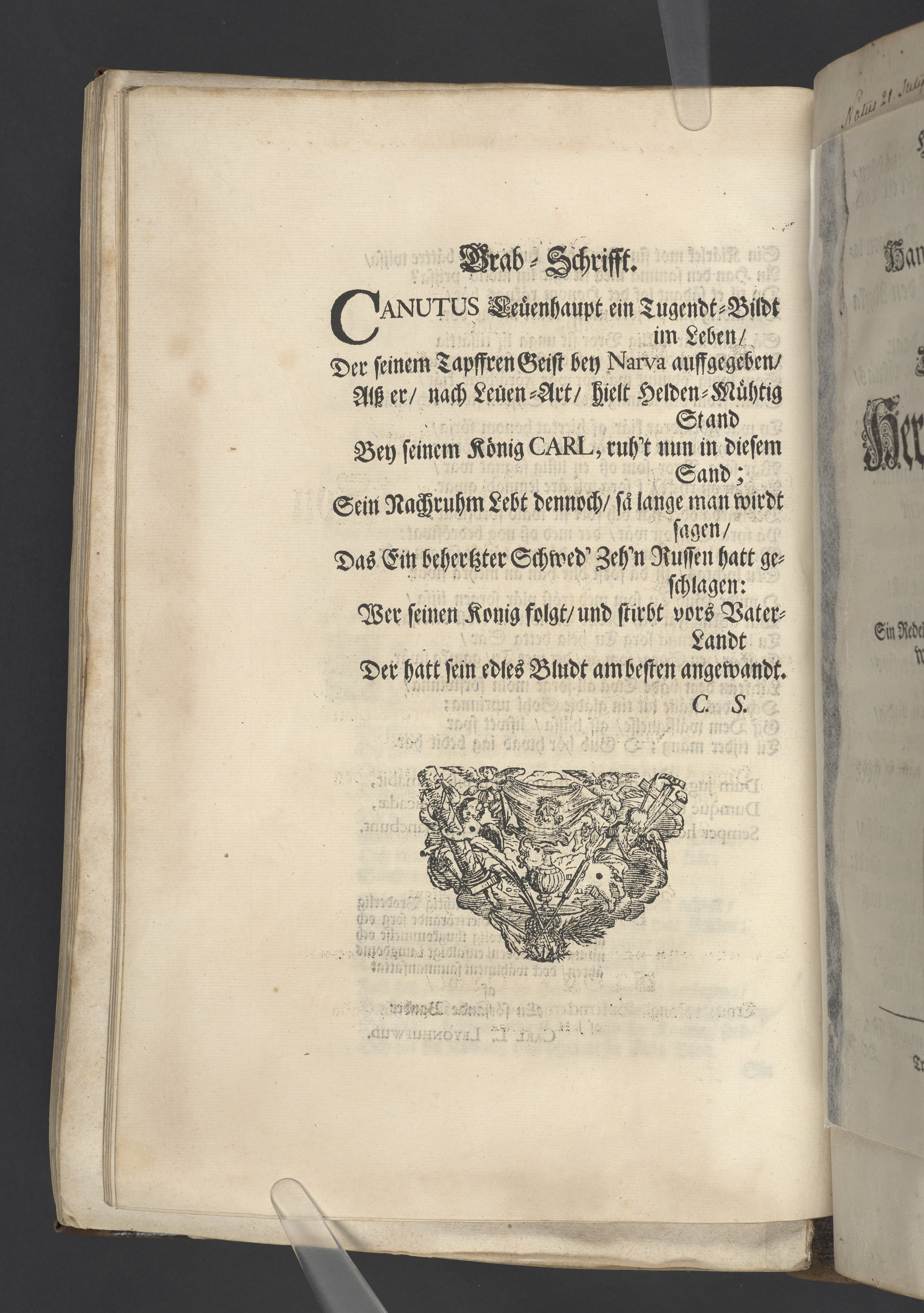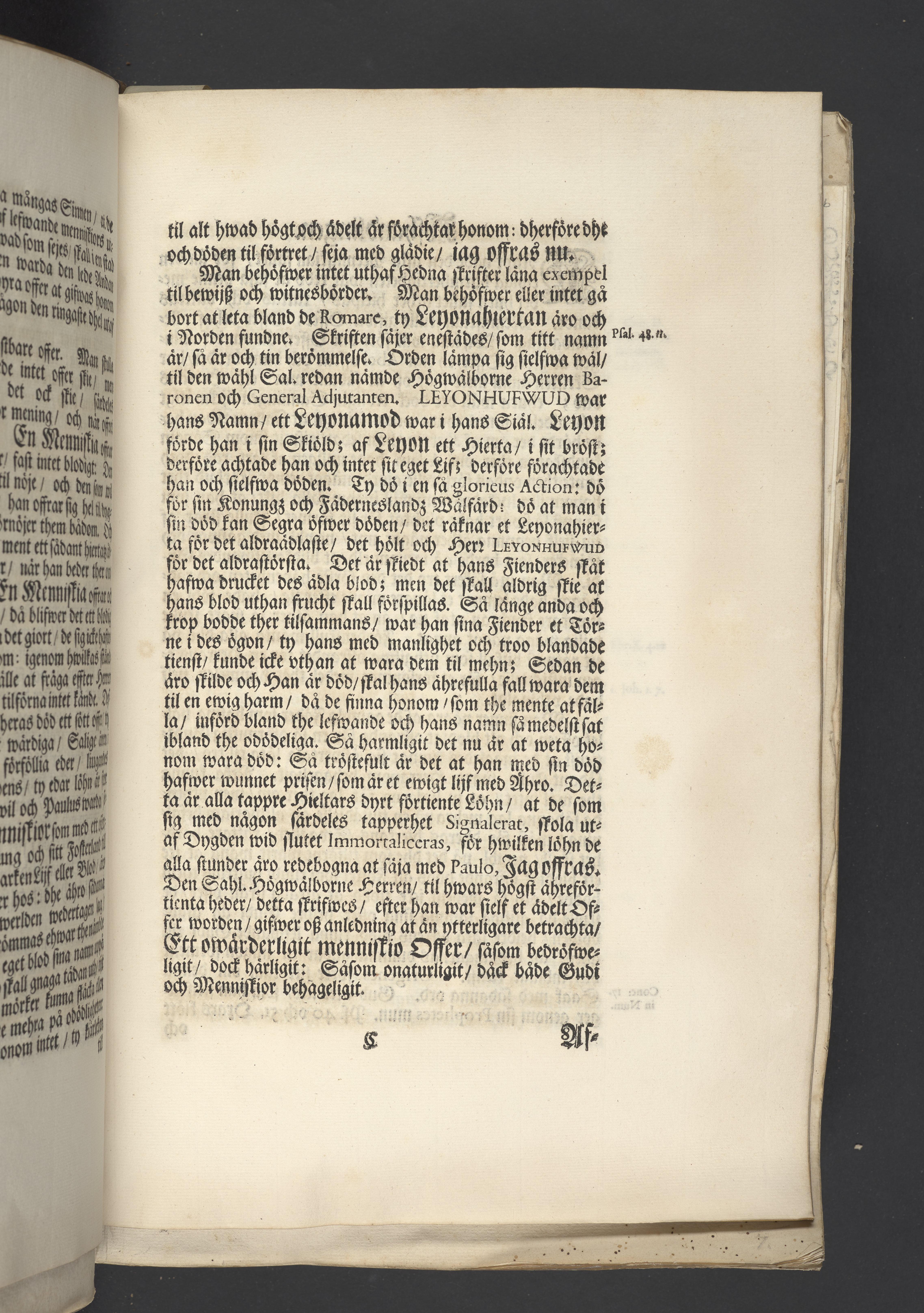 Den i lifwet af allom älskade i döden billigt ährade kungl. may:tz tro-man och general adjutant ... Knut Axels-son Leyonhufwud ... hwilken de tappre hieltar lijkt sitt trogne hierta bewijsade med sitt ädla lijfs och blods upoffrande i den glorieusa och för hela werlden understora action wid Narva åhr 1700 den 20 novemb. Hwars ädla lekamen jordsattes i sin graf den 31 decemb. 1701 uti Riddareholms kyrkia till ett högst-förtient ähreminne lemnas desza enfaldiga betrachtelser af ... Daniel Norlind. Stockholm, tryckt i kongl. boktryckerijet hos sal. Wankijfs enkia. Af J.H. Werner.