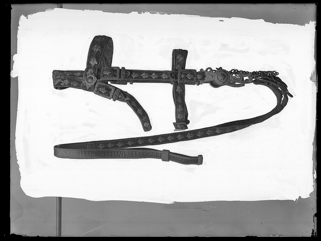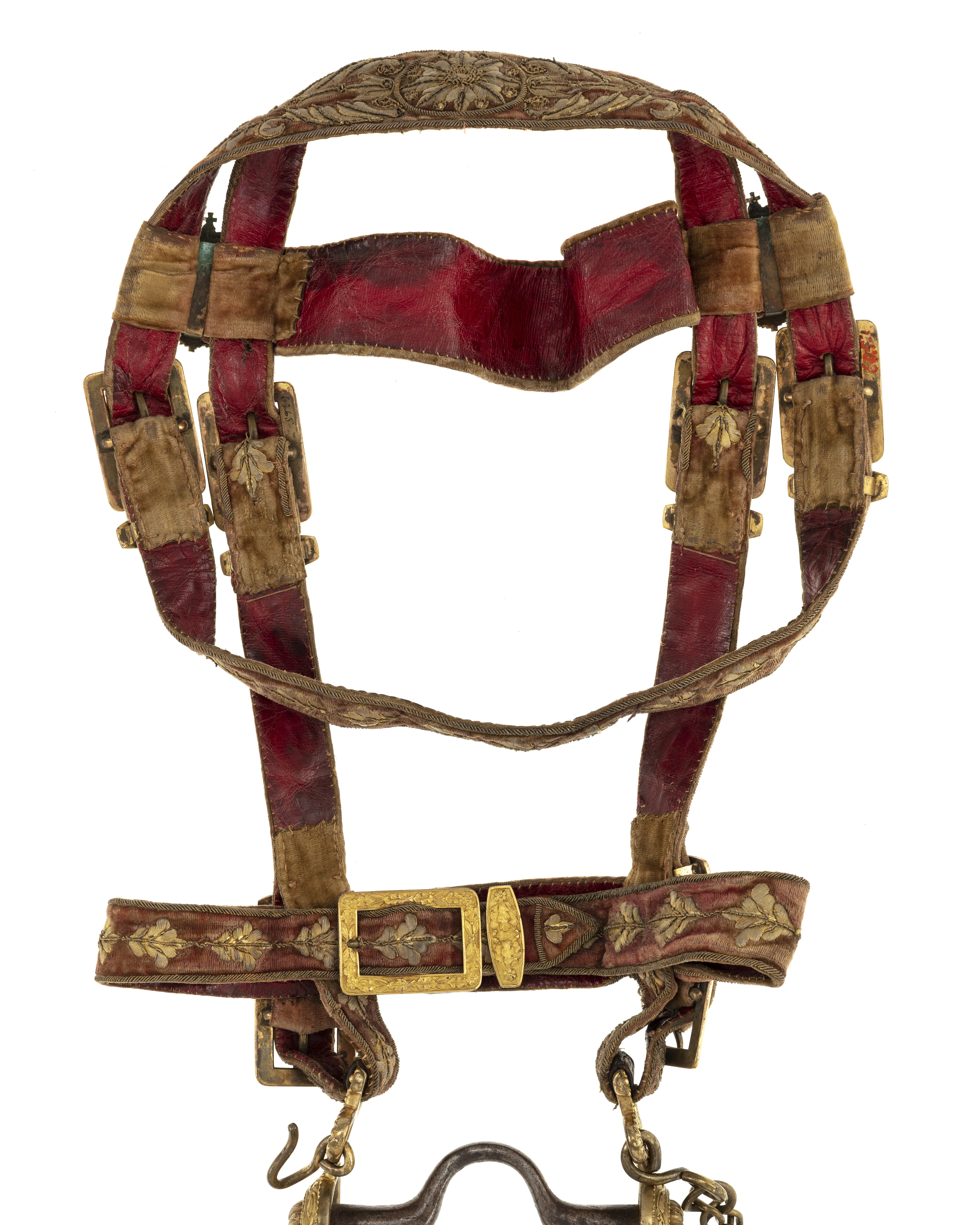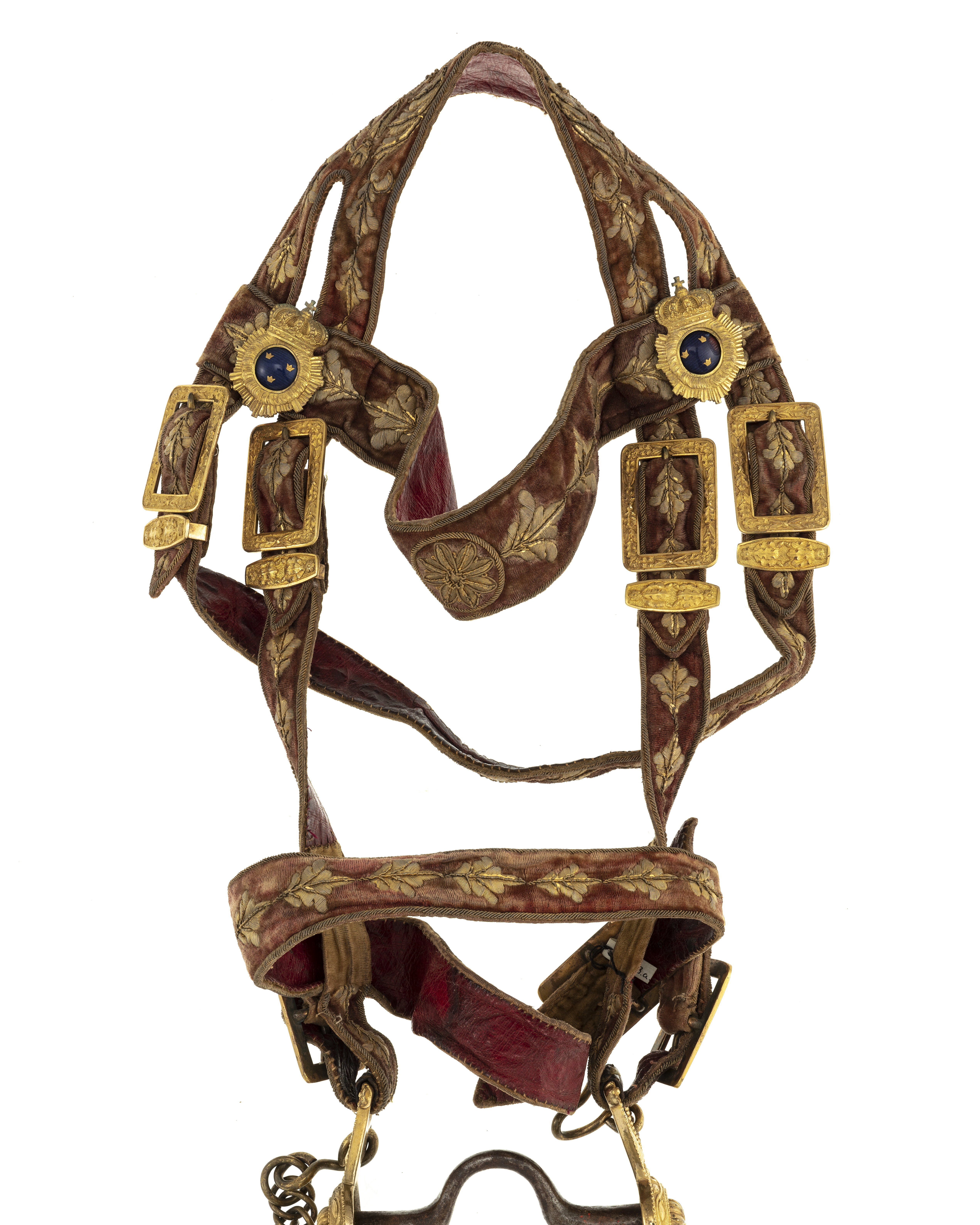 Huvudlag av rött läder överklätt med röd sammet med längsgående eklövsranka samt vulstformig kant, allt broderat med guldtråd samt paljetter. Remmar med på vardera sidan två rektangulära söljor med bladdekor samt hälla. Sidoremmarna övergående i nackrem, tvådelad, den bakre delen utdragen i käkrem med två söljor. Pannremmen 51 mm bredmitt fram med blomornament, vid fästena runda, krönta, med strålar omgivna blåemaljerade trekronorssköldar. Nosrem 38 mm bred med en sölja.
