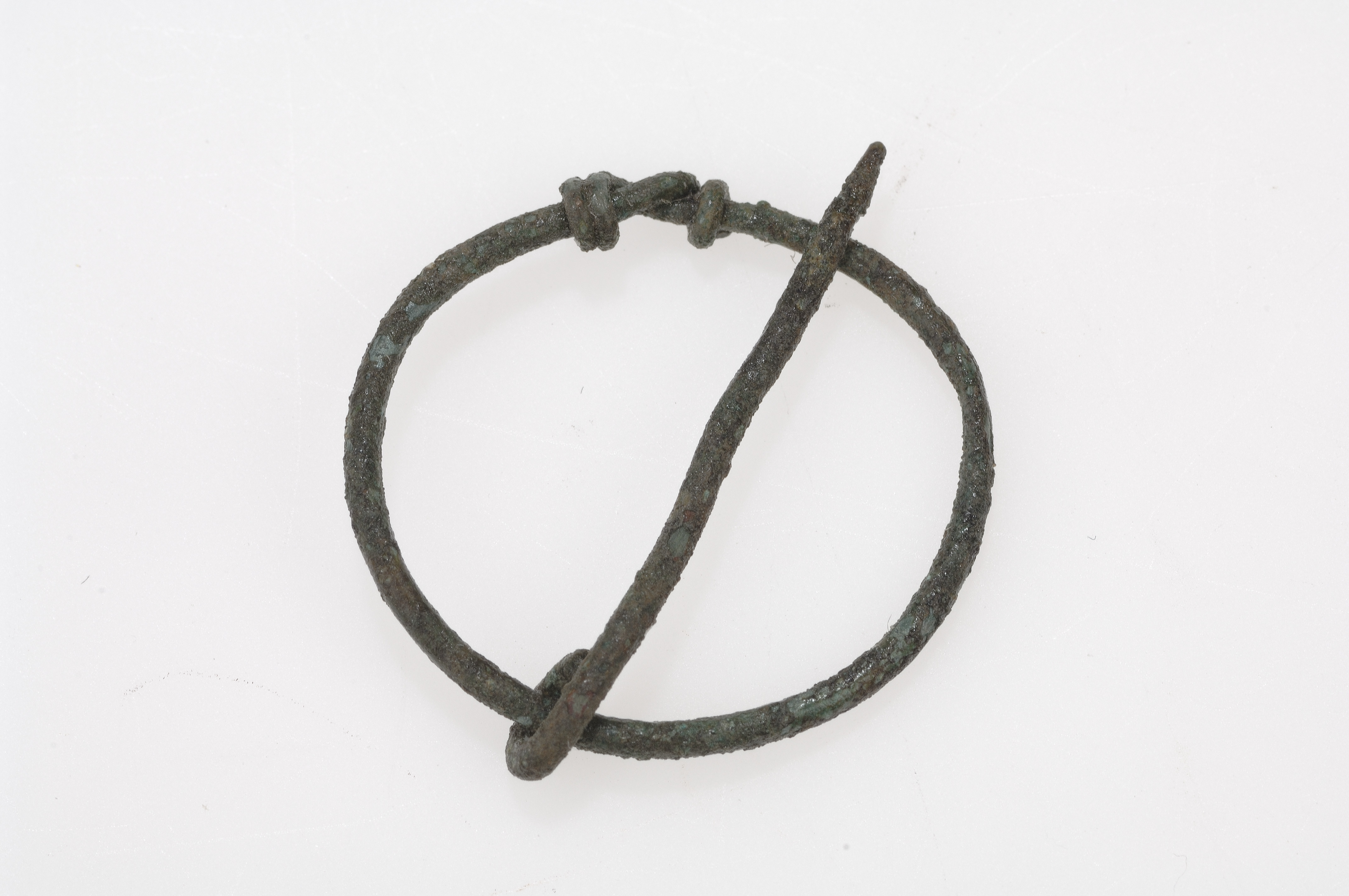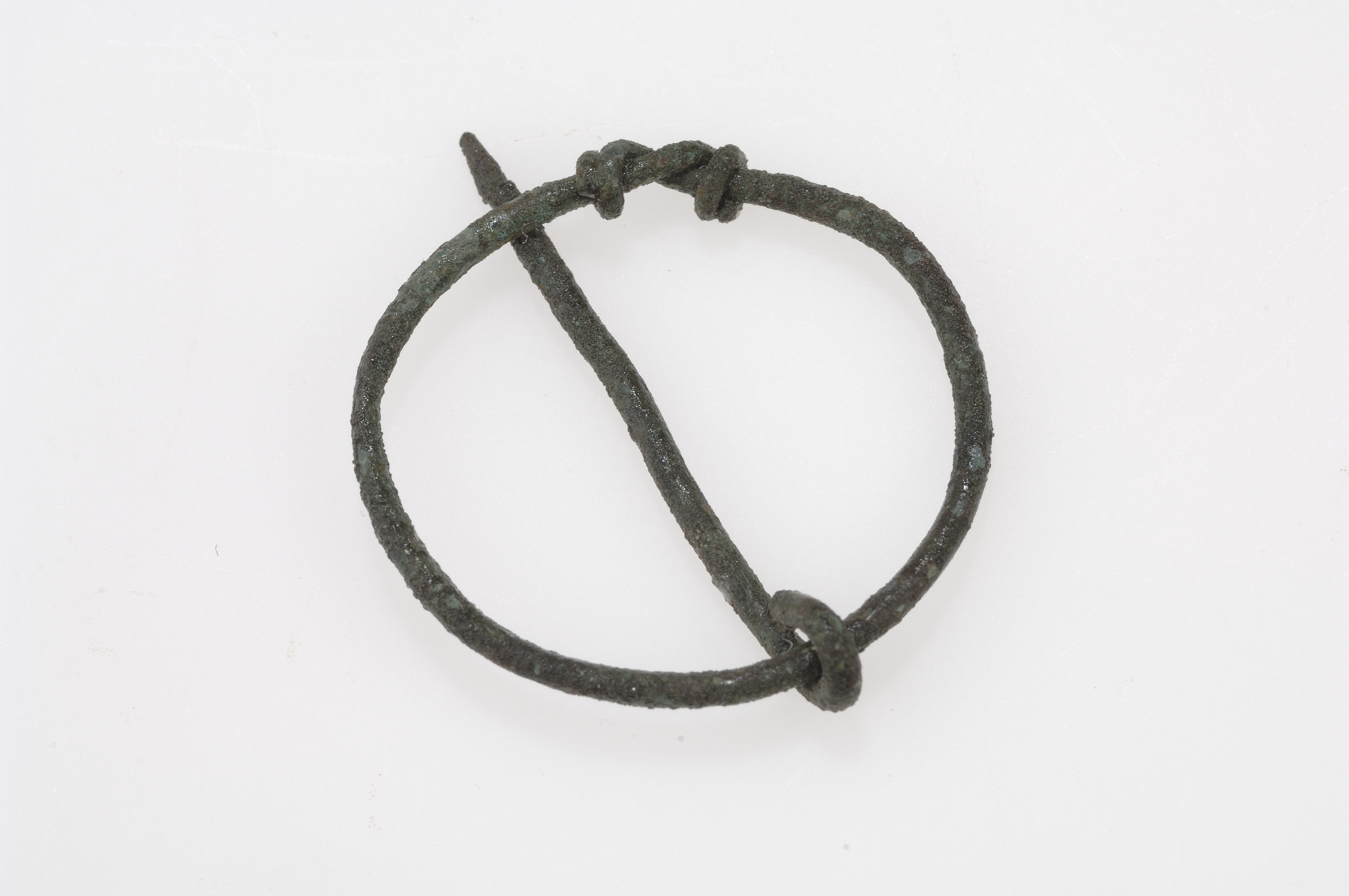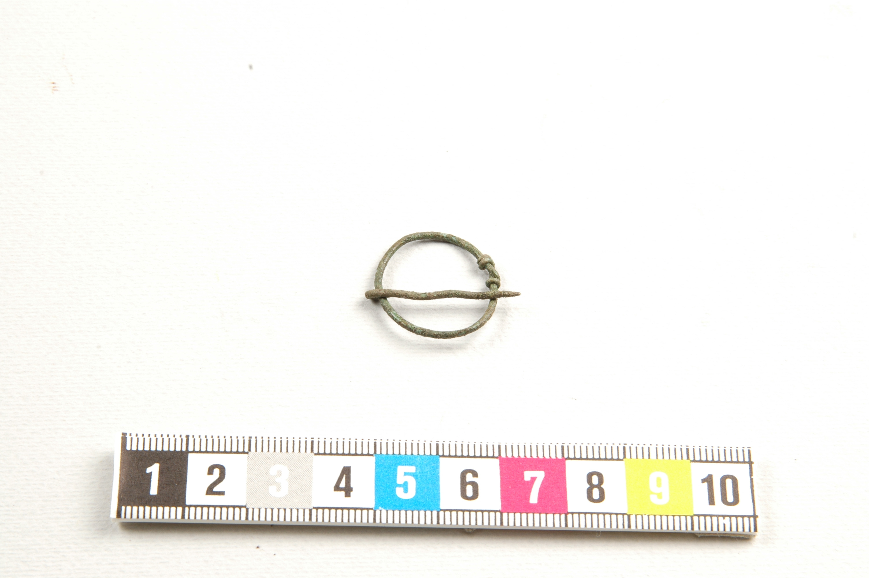 Liten cirkelrund sölja av mycket smal 1 mm tjock ten, 22x25 mm i diam. dubbelt omvirade ändar. Enkelt omvirad nål 15 mm l.