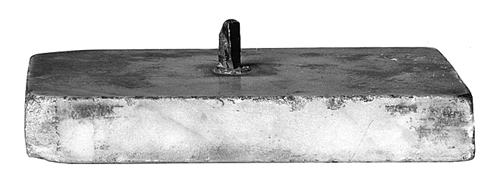Brevpress av marmor. Rektangulär marmorskiva med fäste för en klnopp som saknas.