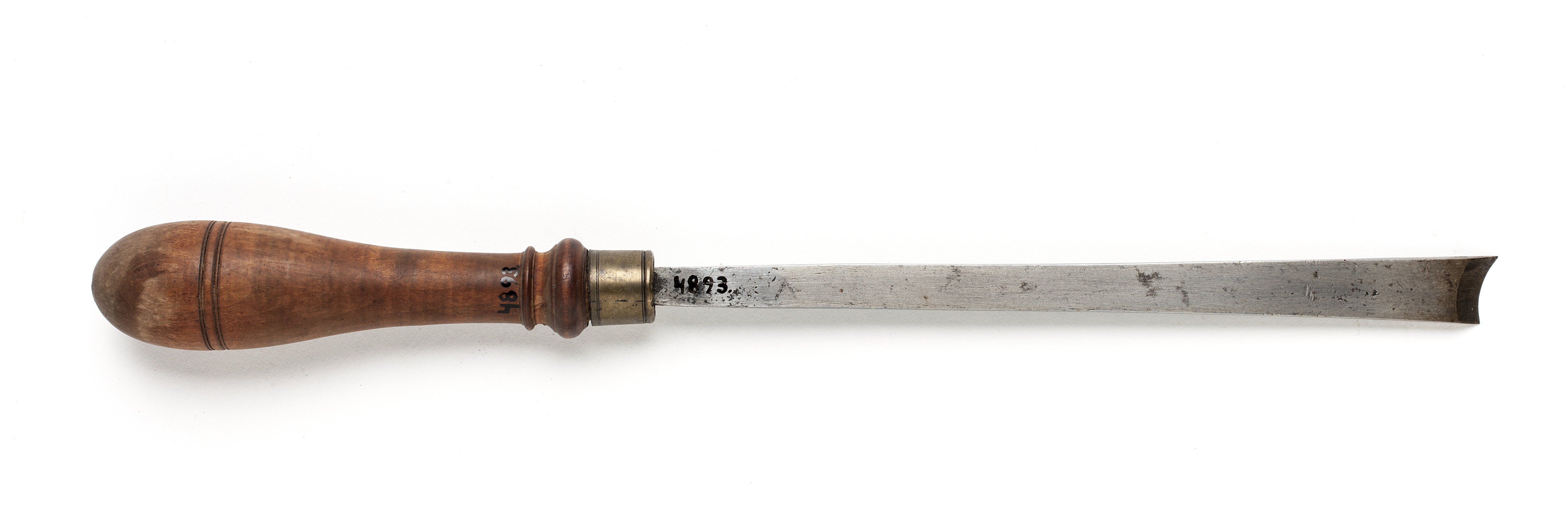 Klinga med rektangulär genomskärning. Konkav egg, sned åt vänster. Svarvat skaft av päronträ med två vulster nedtill ("skoklostertyp"). Mässingsring. Stämpel i skaftets ände vid fästet: "89" med stansar nr 5375.