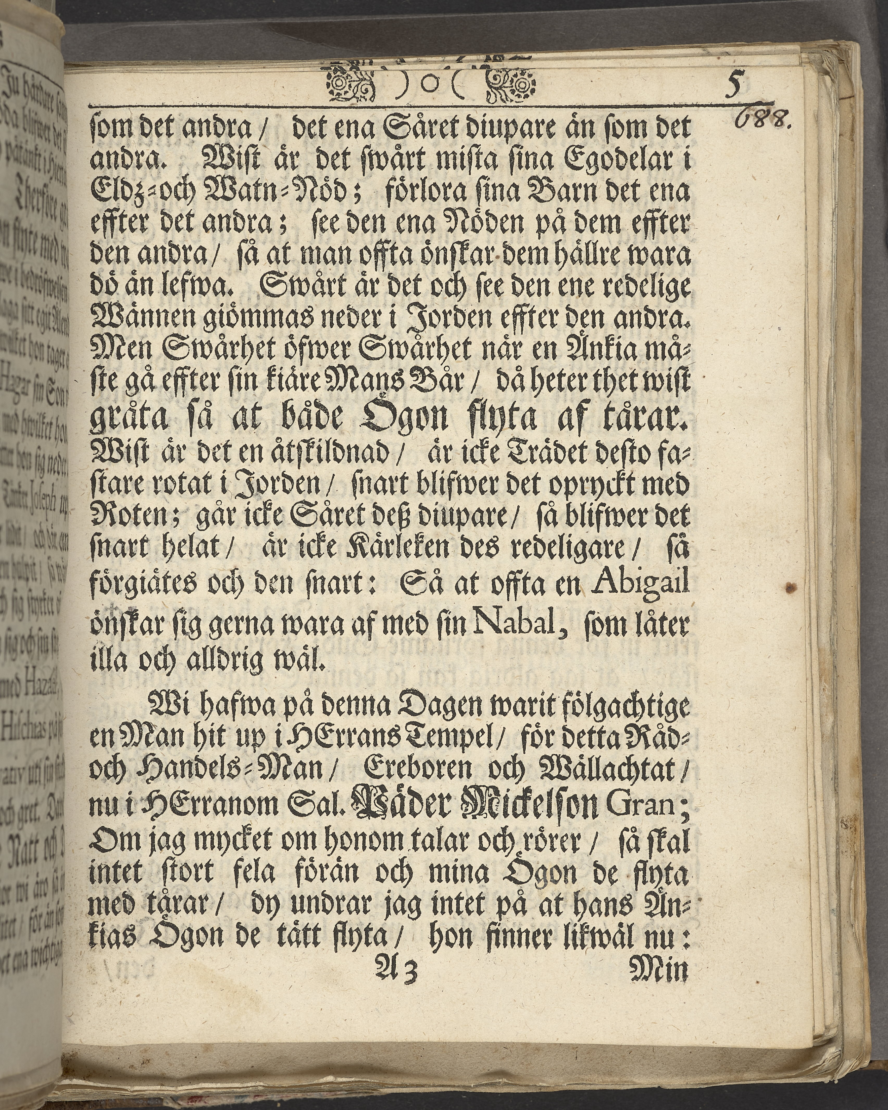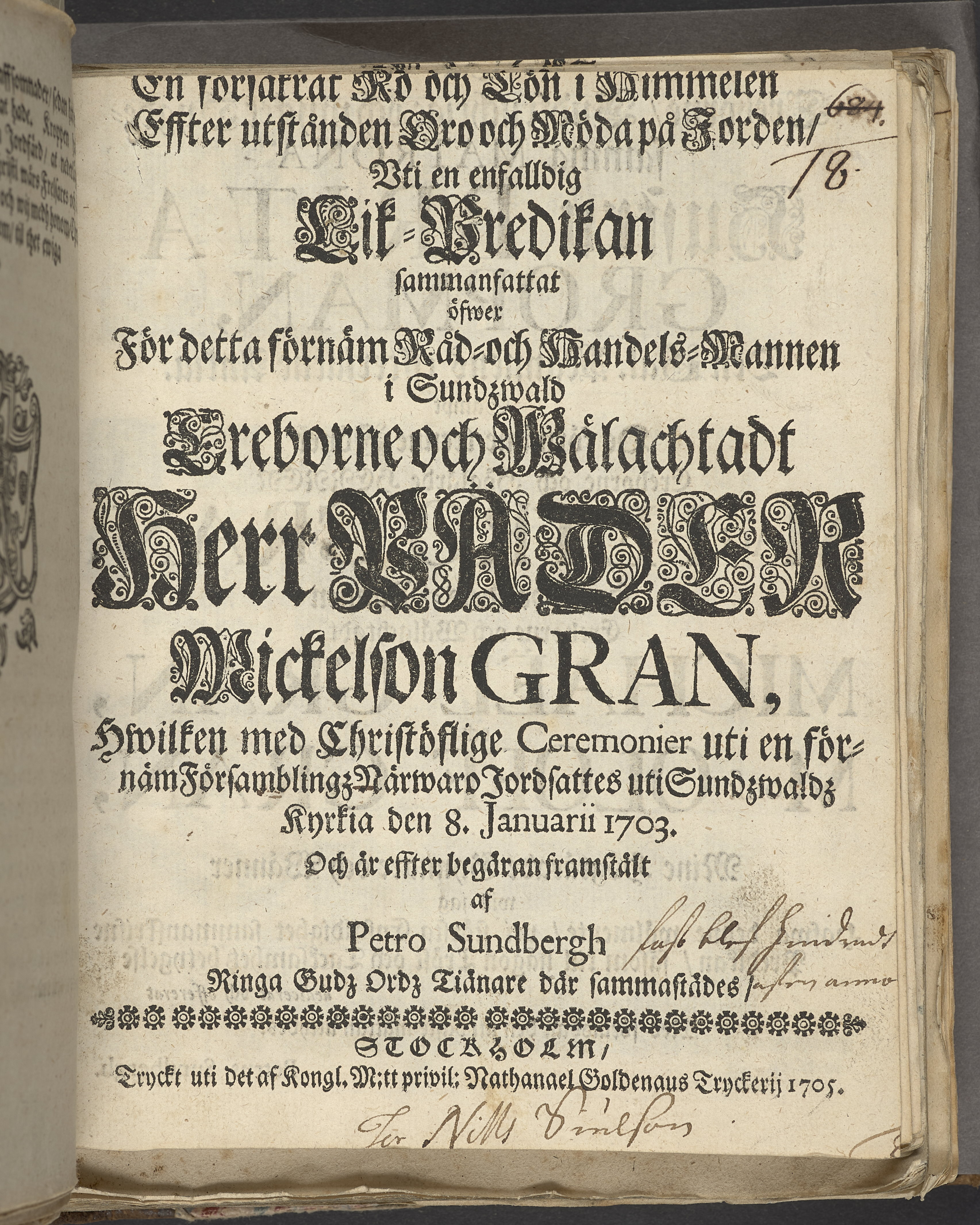 En försäkrat ro och lön i himmelen effter utstånden oro och möda på jorden, vti en enfalldig lik-predikan sammanfattat öfwer för detta förnäm råd- och handels-mannen i Sundzwald ... Päder Mickelson Gran, hwilken med christöflige ceremonier uti en förnäm församblingz närwaro jordsattes uti Sundzwaldz kyrkia den 8. januarii 1703. Och är effter begäran framstält af Petro Sundbergh ... Stockholm, tryckt uti det af kongl. m:tt privil: Nathanael Goldenaus tryckerij 1705.