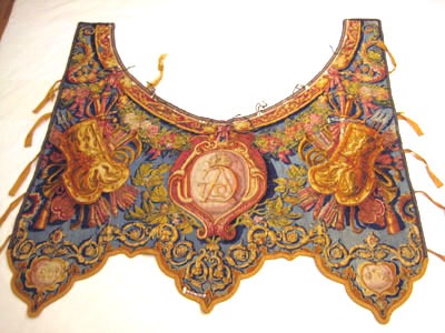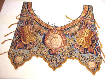 På den ena halskappan a) ett större hål. Den ena beklädnaden a) (med blå botten) lagad i Handarbetets vänners väfskola 1896 (se prot. 5.6.96.)