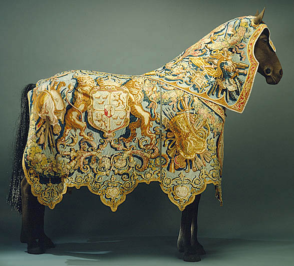 2 Romerska Häst Täcken med 2 halskappor och 2 bröststycken, wäfne som tapeter af silke och fin ull samt prydde med kronor och wapen, gewär, Konungens Namnn samt året 1621.