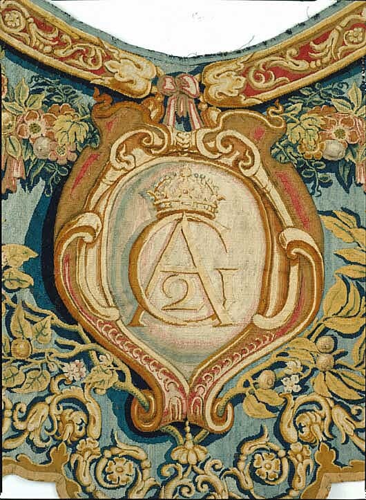 Två romerska hästtäcken, hvardera med halskappan och bröststycke, i gobelinsväfvnad af ull och silke, med ornamenter af trofeer, kronor och vapen, Gustaf II Adolfs namnchiffer samt "Anno 1621".