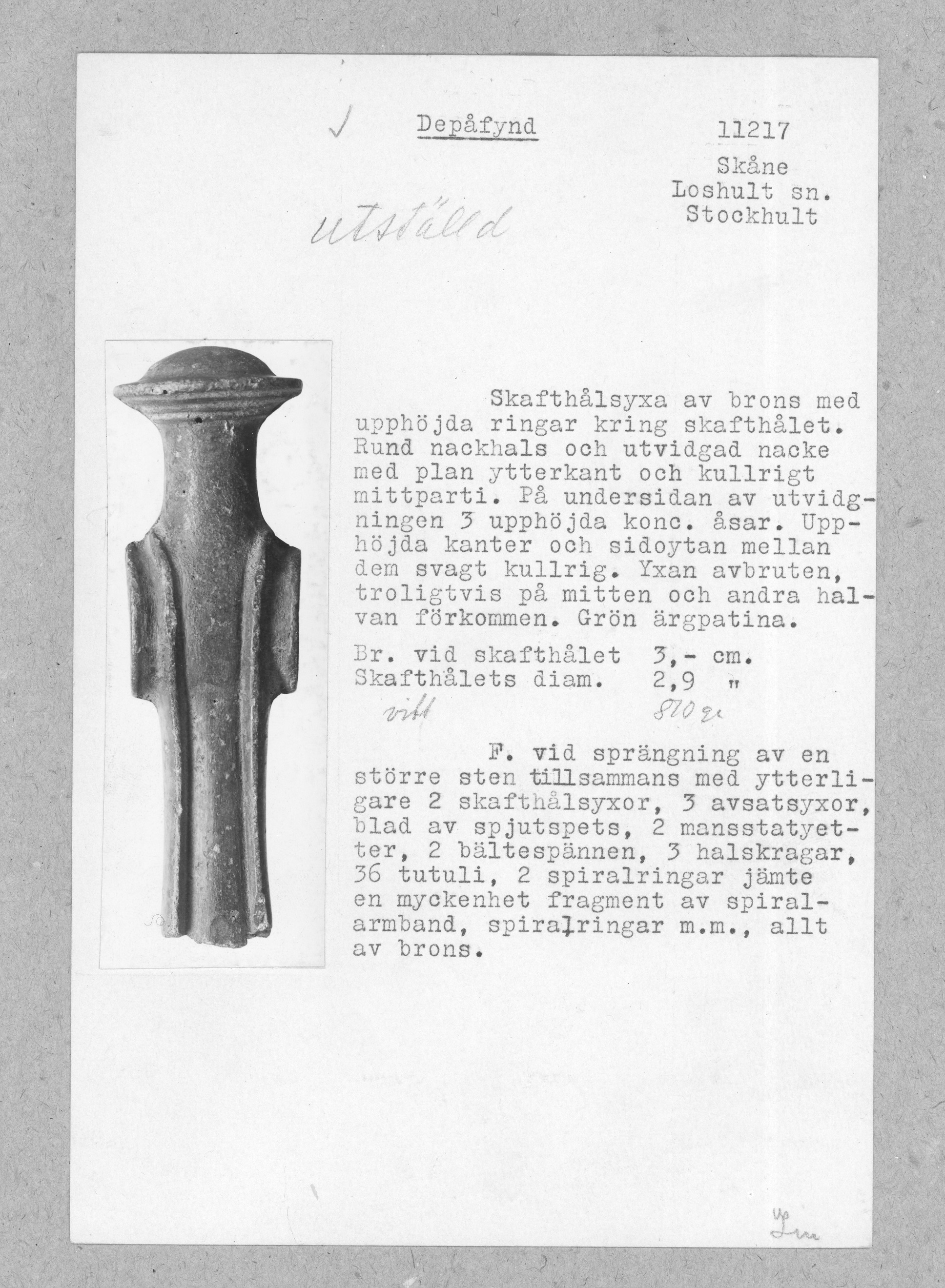 Skafthålsyxa av brons med upphöjda ringar kring skafthålet. Rund nackhals och utvidgad nacke med plan ytterkant och kullrigt mittparti. På undersidan av utvidgningen finns tre upphöjda koncentriska åsar. Upphöjda kanter och sidoytan mellan dem är svagt kullrig. Yxan är avbruten, troligtvis på mitten och den andra halvan är försvunnen.