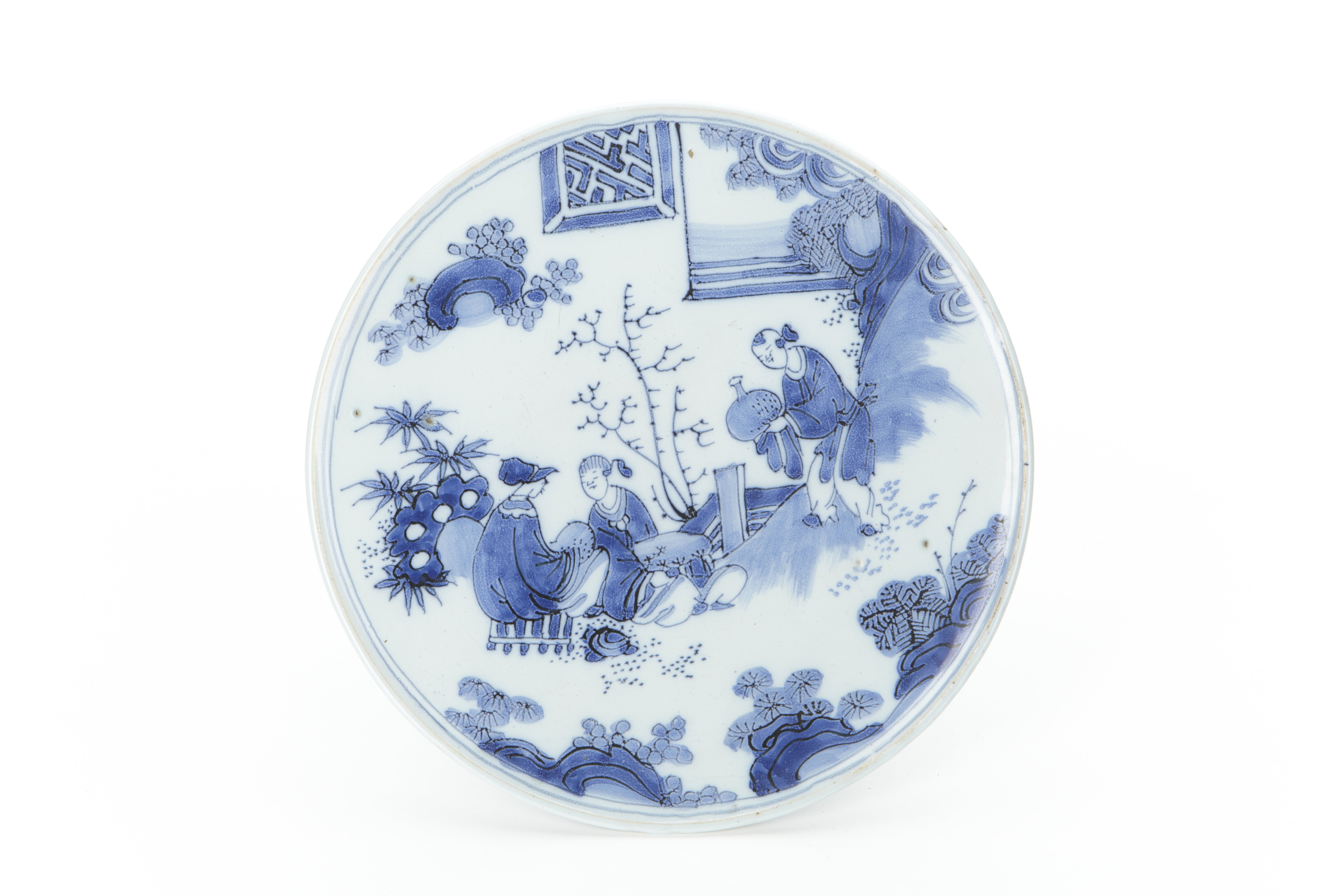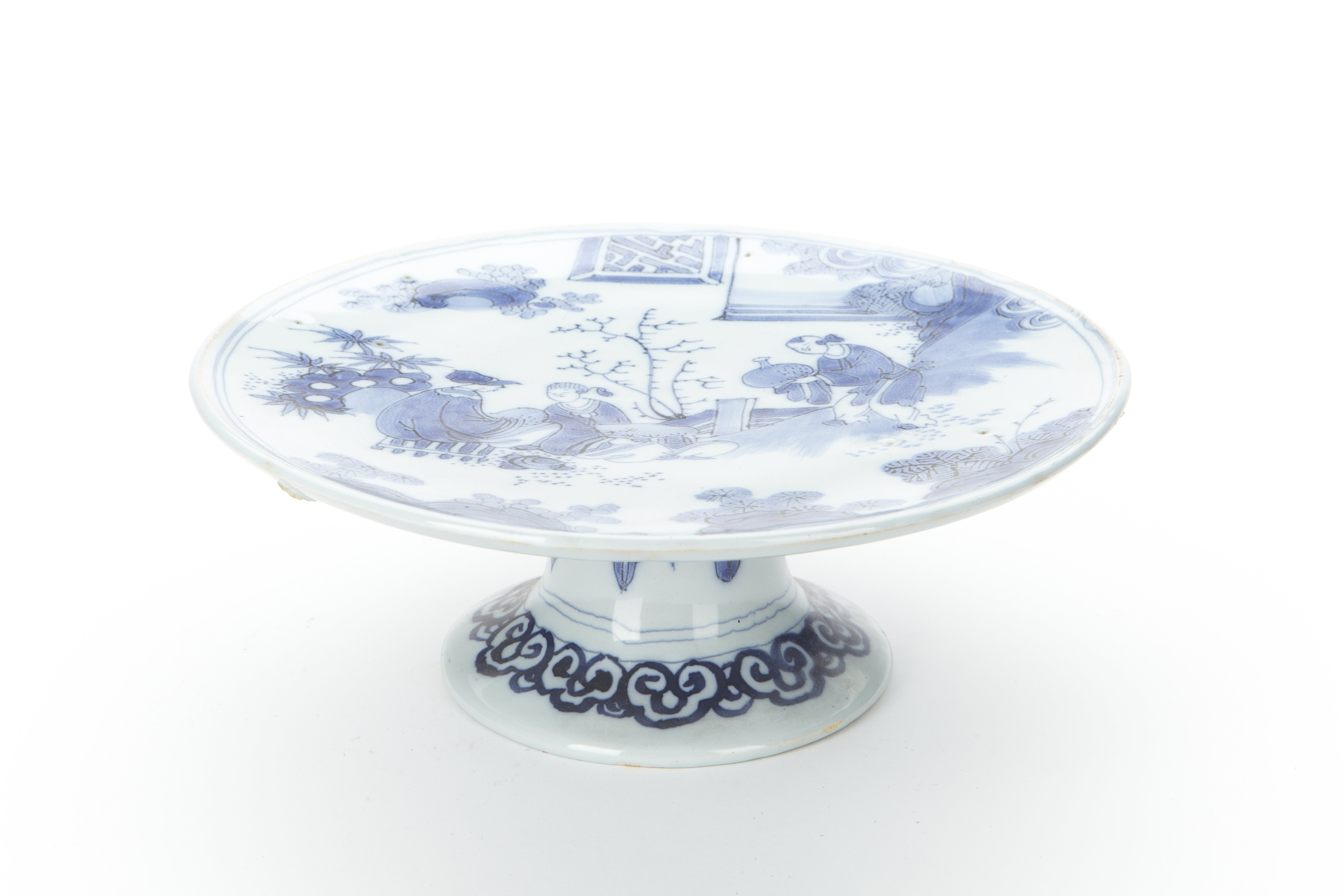 På fatet tre figurer bland växtornament. Fatets undersida med kryss och cirklar. På foten palmettbård. Delft 1600-talets senare hälft. 1845 " 1 st. rund Presenter Bricka på hög fot". 1823 " 1 st. rund Presenter Tallrick med fot, har Bilder och blommvärk". 1794 ? " 1 st. Blå och hvit Presenter Tallrick". 1756 ? " 1 Presenter tallrick". 1728 ? " en presentertallrick".