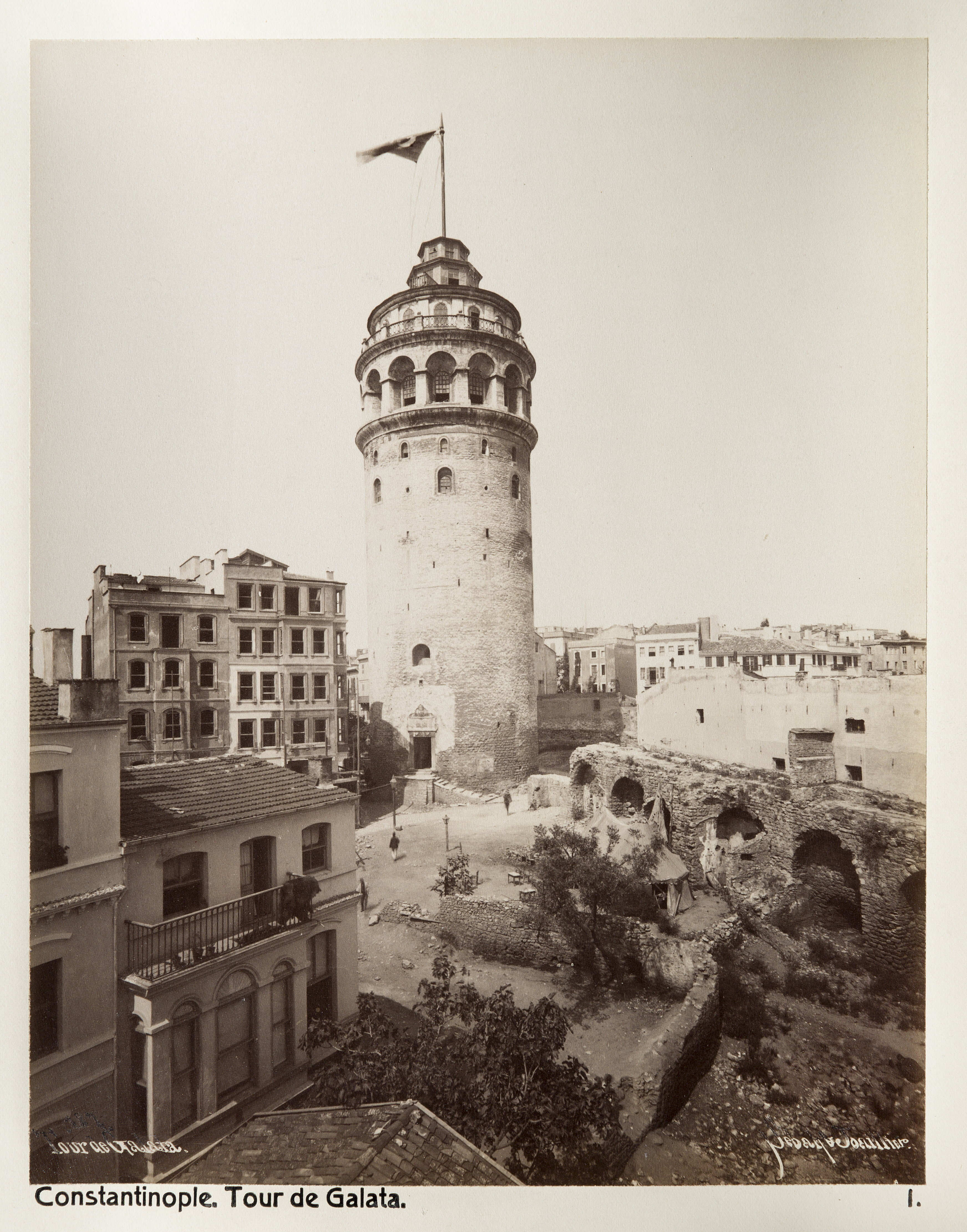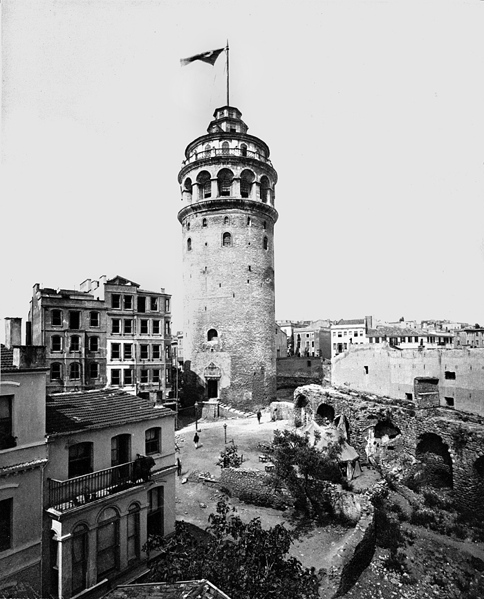 Galatatornet, Konstantinopel (nuvarande Istanbul). Text på originalet: "Constantinople. Tour de Galata." Fotografierna LXVI:O.01.-54. kommer från resan till Turkiet och Mindre Asien som Wilhelmina och Walther von Hallwyl gjorde den 27 april - 20 juni 1901. De lämnade Sverige den 5 november 1900 för Egypten, där de stannade till den 28 mars 1901, då de fortsatte till Palestina. Den 27 april fortsatte de till Turkiet och Mindre Asien. Med på resan var Wilhelminas sällskapsdam, fröken Ida Uhse. I Konstantinopel (Istanbul) anslöt sig Wilhelminas mor Johanna Kempe och kusindottern Elma Hök. Fotografierna är inköpta av Wilhelmina i Konstantinopel (Istanbul) och Brussa. Alla uppgifter kommer från Ida Uhses reseanteckningar.